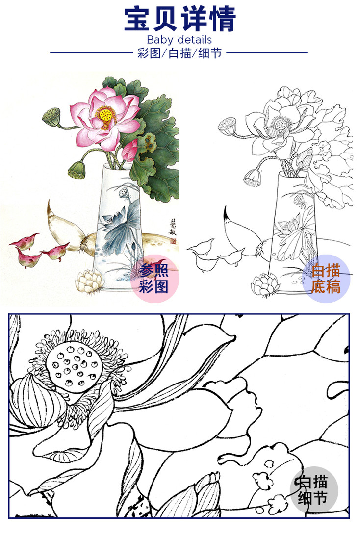 工笔花鸟白描底稿-荷花瓶花-斗方小品册页-A304