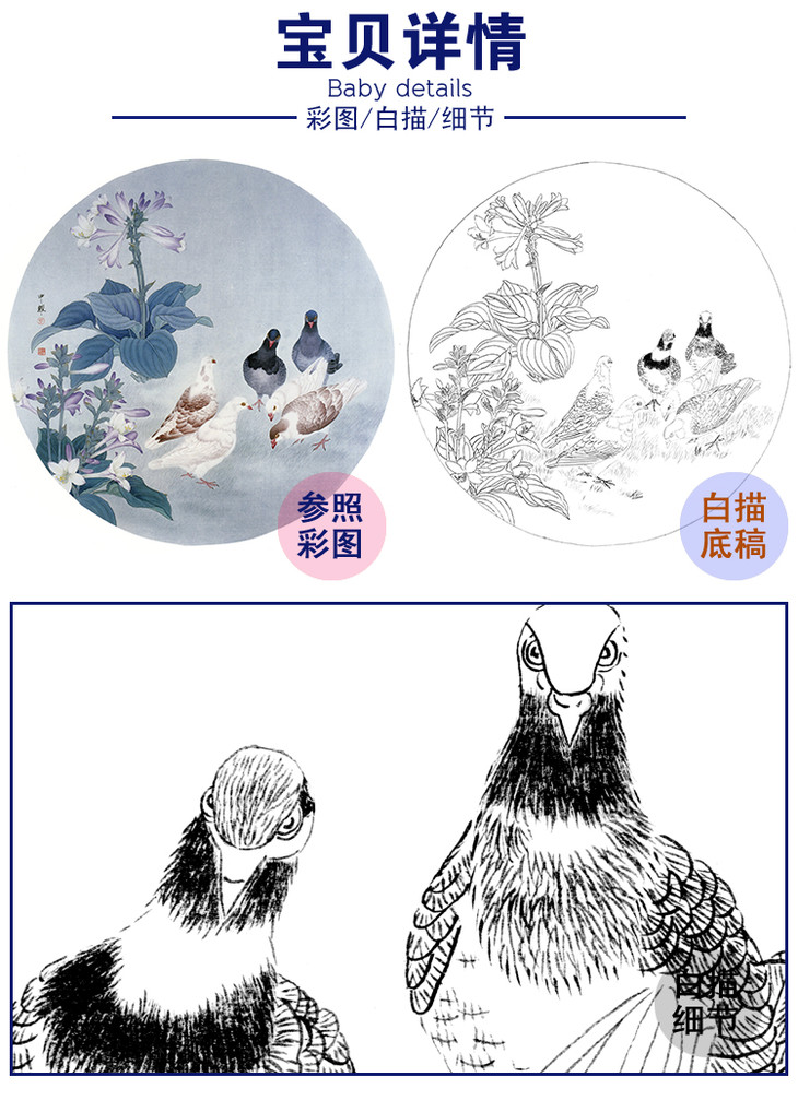 工笔花鸟白描底稿-周中耀《会盟》-鸽子小品-多种白描尺寸可选-ZY07