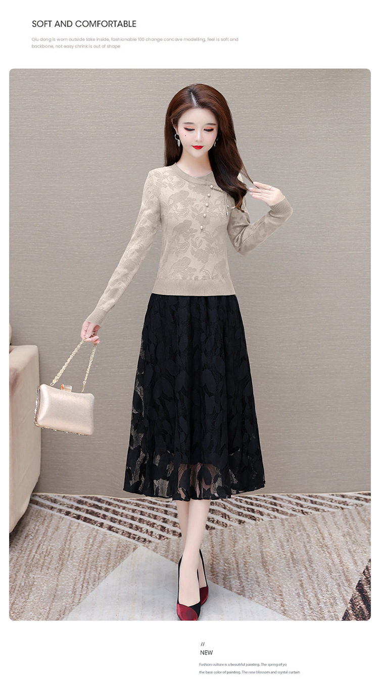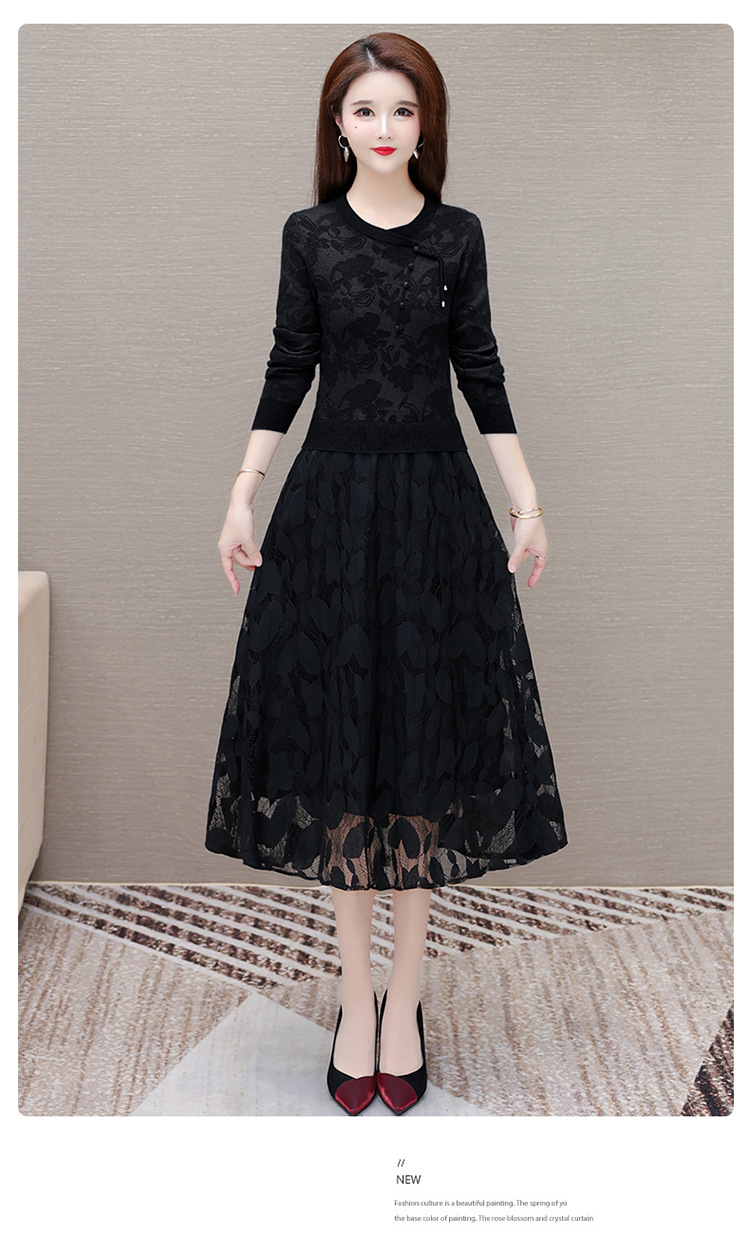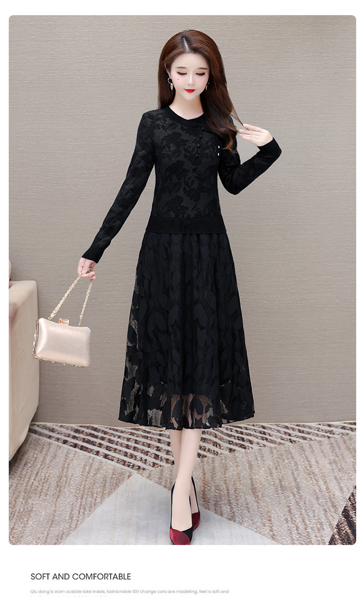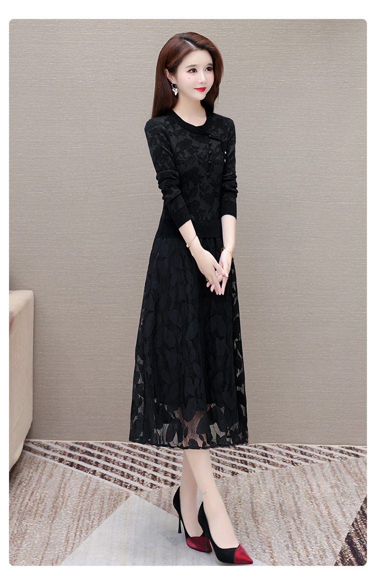 QYMXY-24LXB801-Y针织连衣裙女2024年新款毛衣裙拼结时尚蕾丝网纱裙长袖A字裙 商品图3