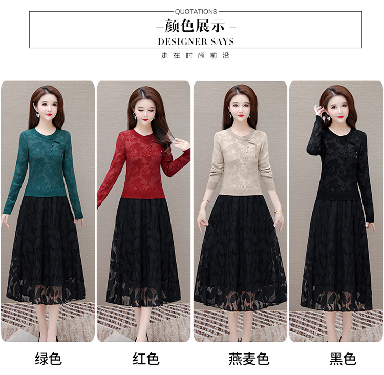 QYMXY-24LXB801-Y针织连衣裙女2024年新款毛衣裙拼结时尚蕾丝网纱裙长袖A字裙 商品图1