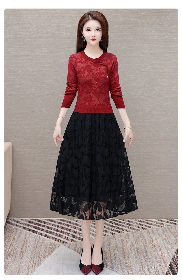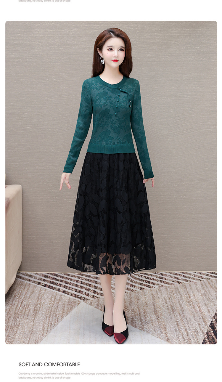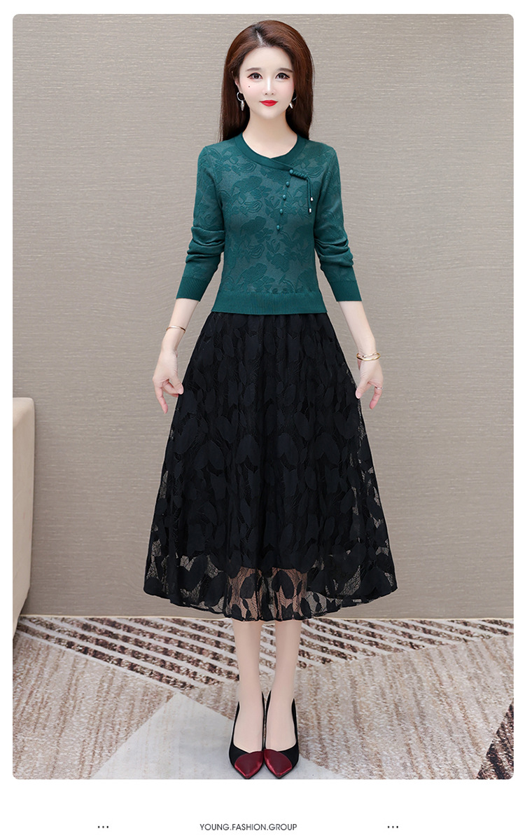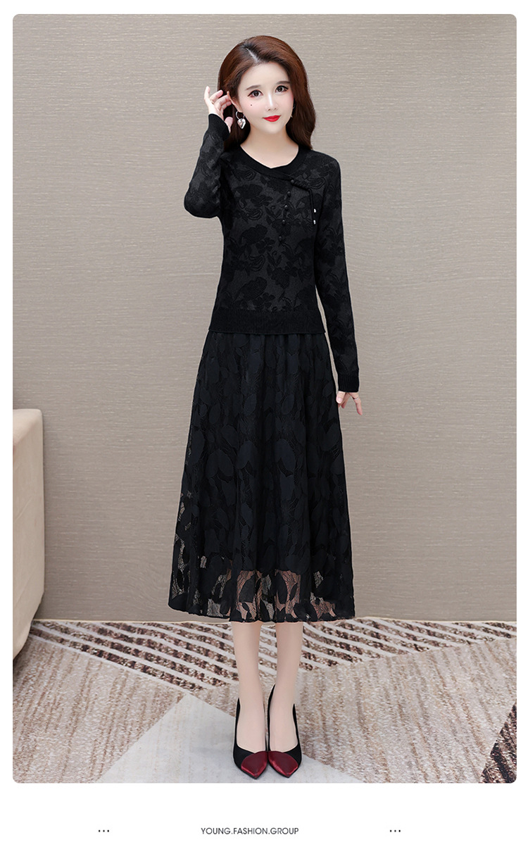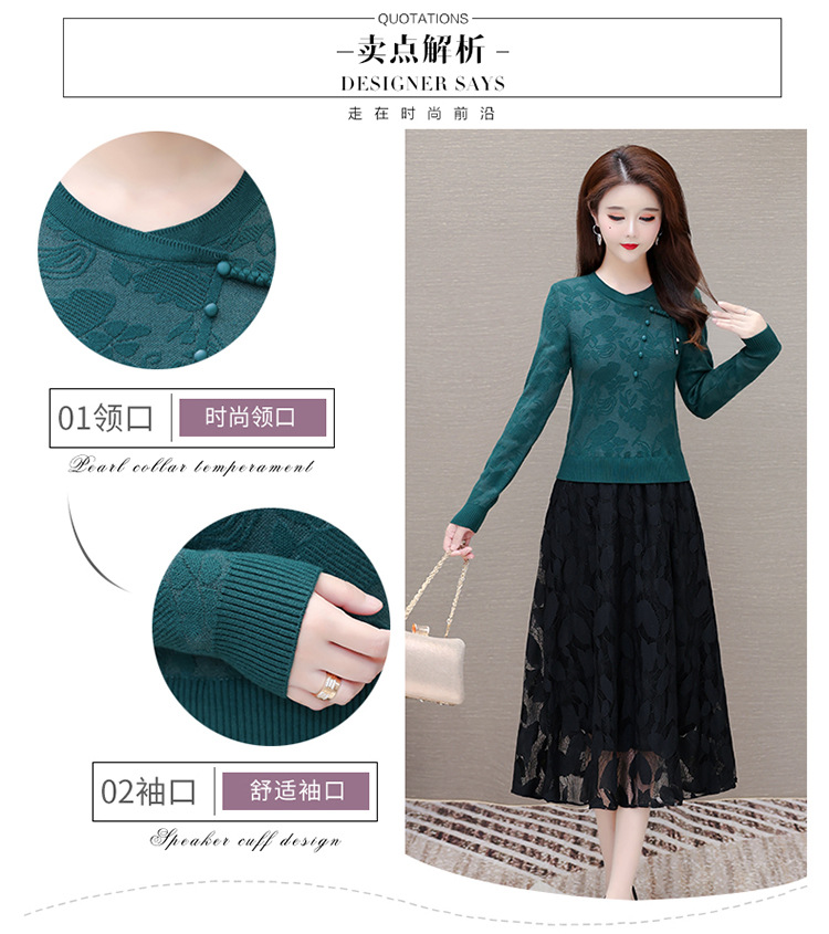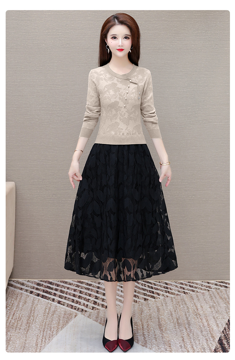 QYMXY-24LXB801-Y针织连衣裙女2024年新款毛衣裙拼结时尚蕾丝网纱裙长袖A字裙 商品图2