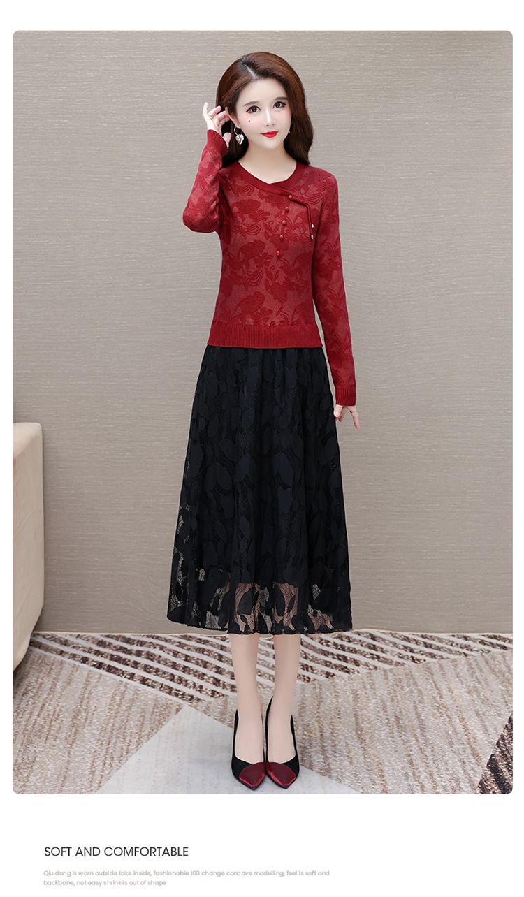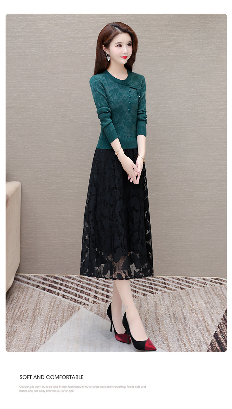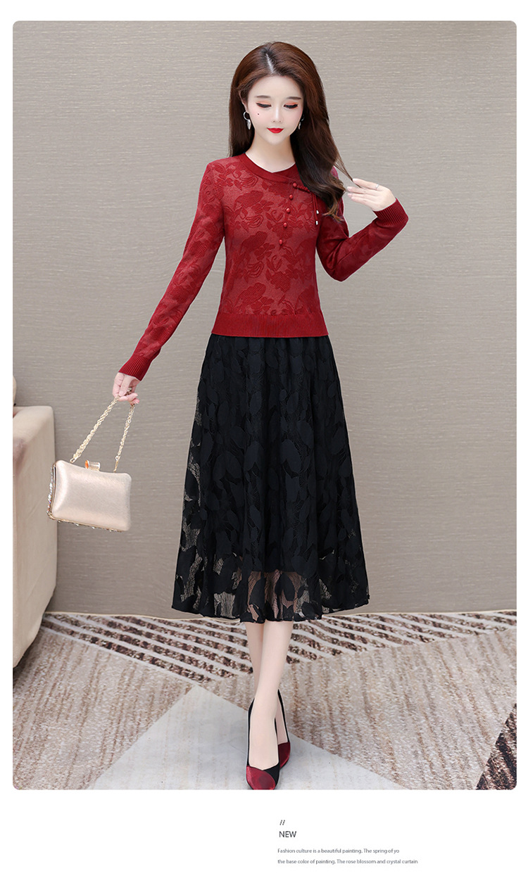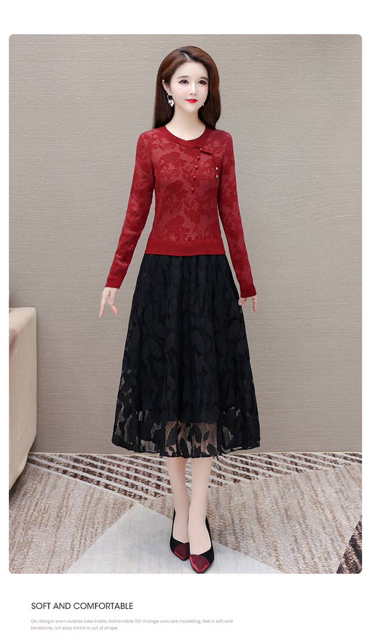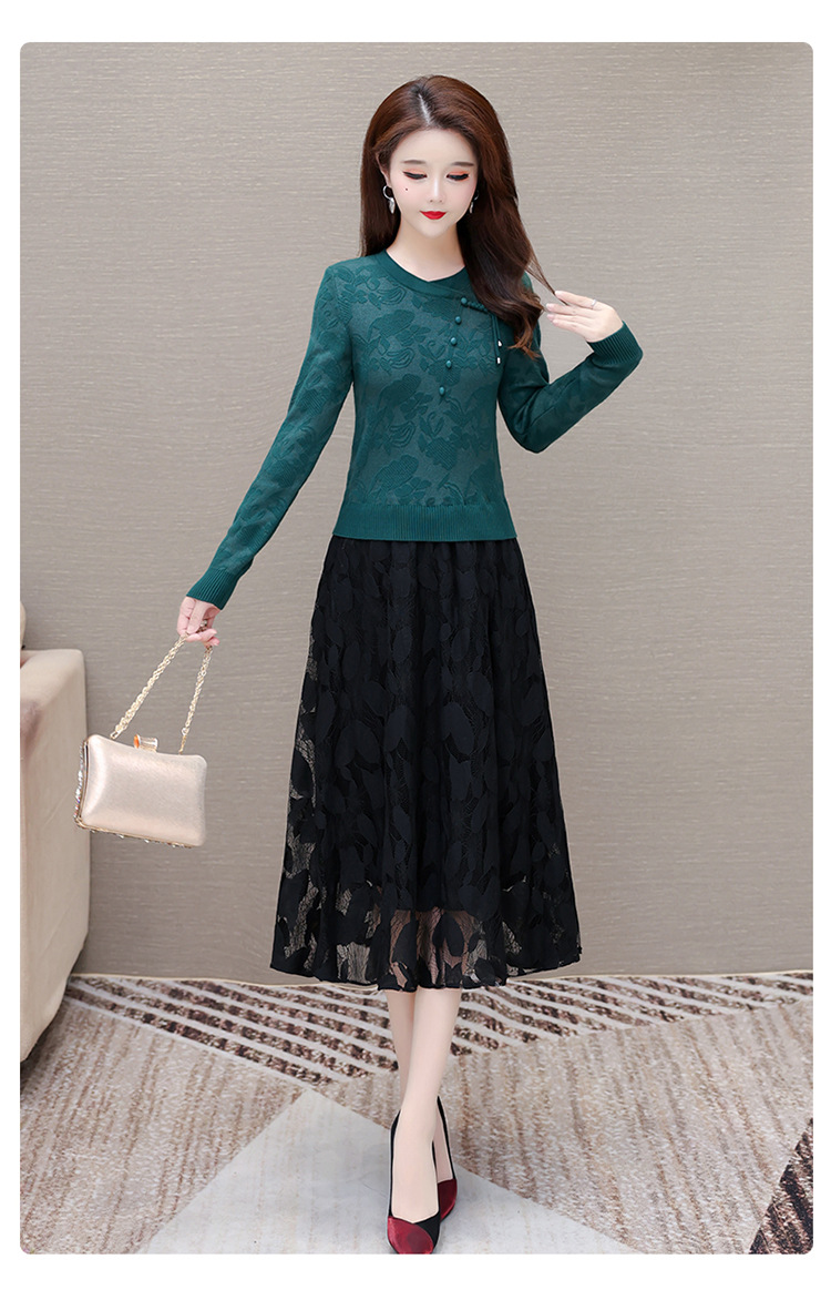 QYMXY-24LXB801-Y针织连衣裙女2024年新款毛衣裙拼结时尚蕾丝网纱裙长袖A字裙 商品图2