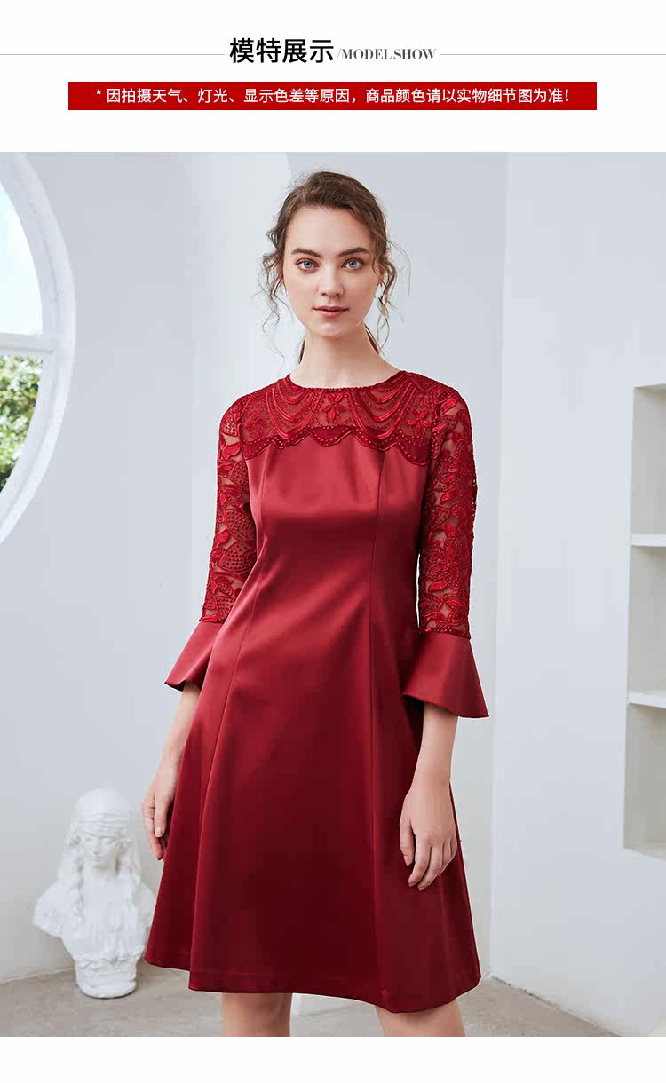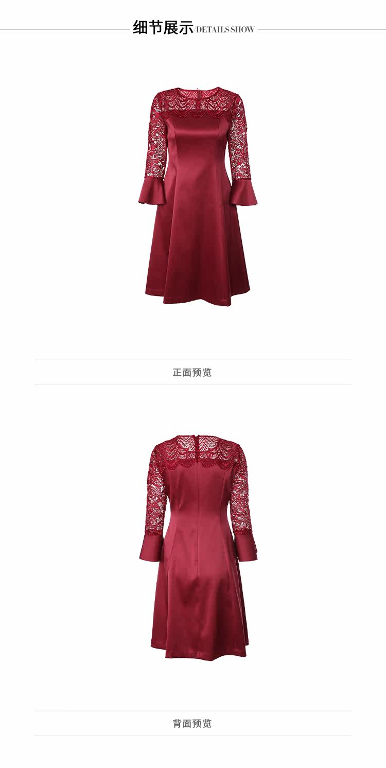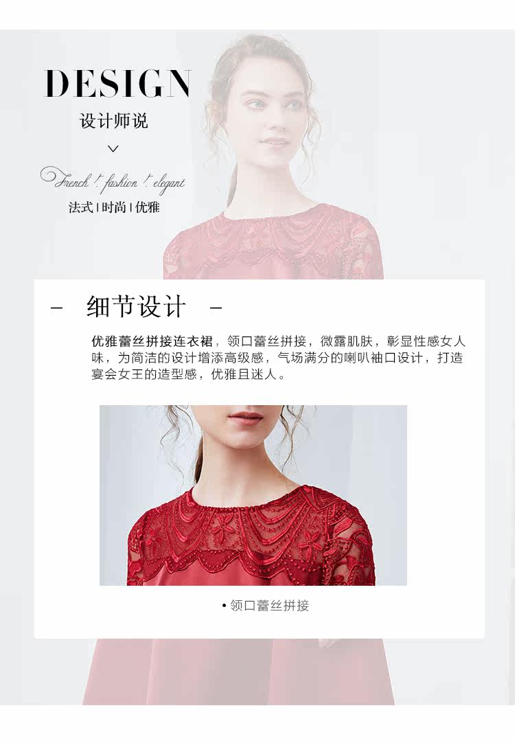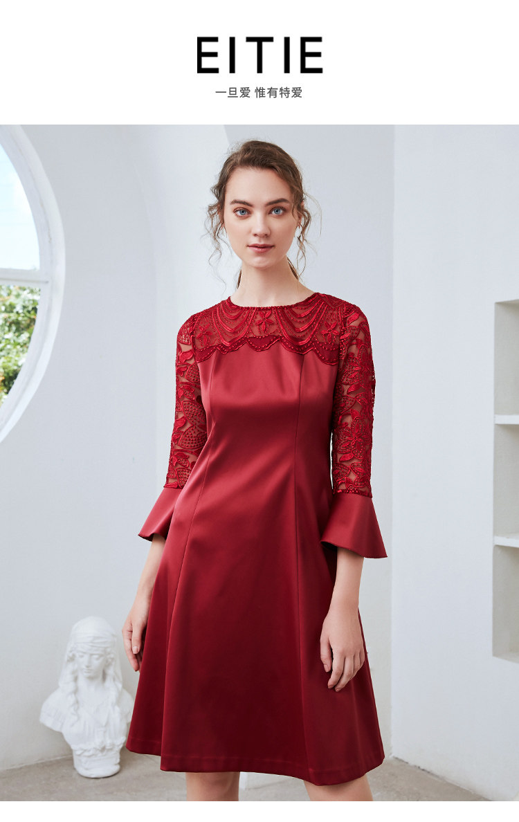 EITIE爱特爱秋季新款洋气复古蕾丝拼接喇叭袖收腰连衣裙女裙C20075124