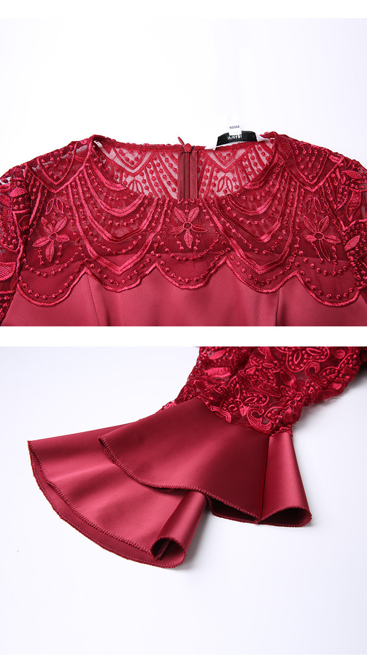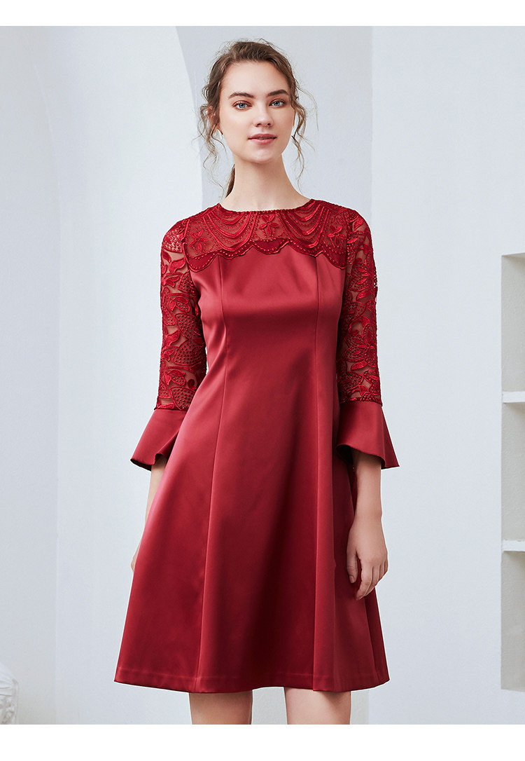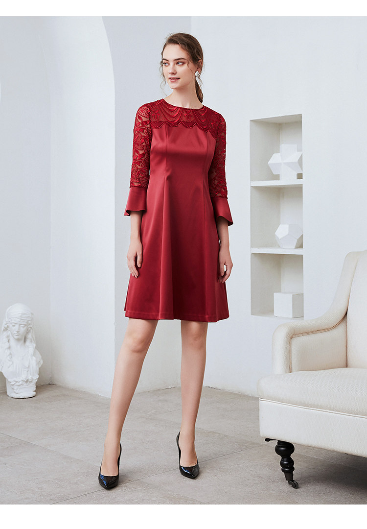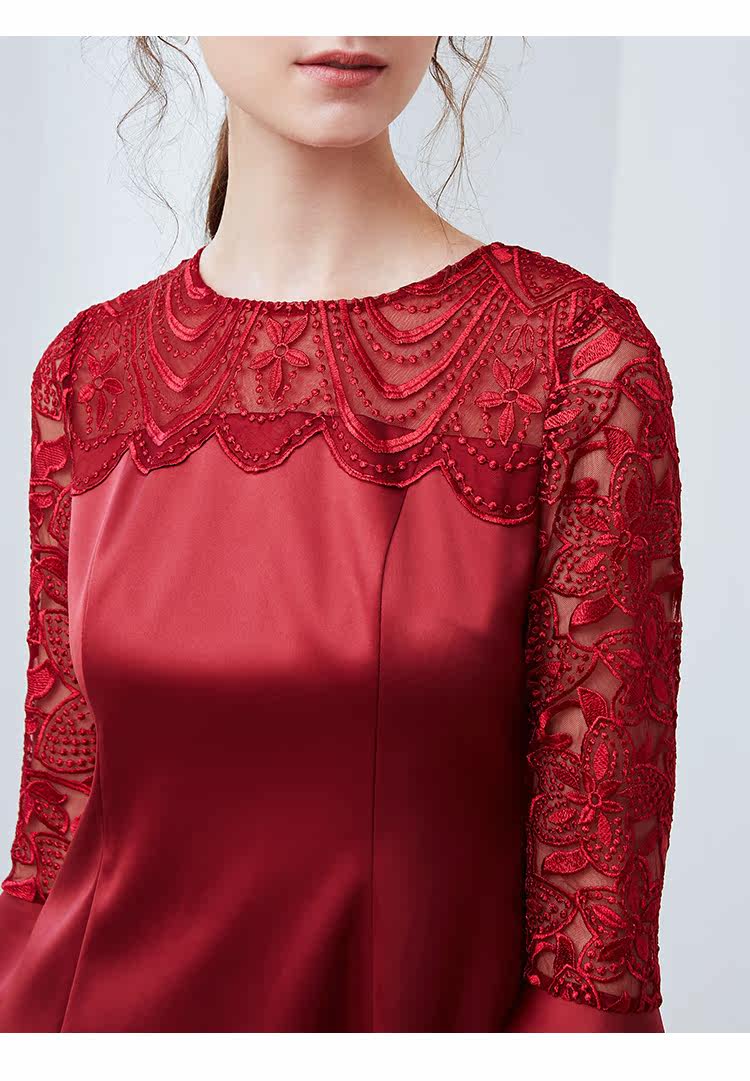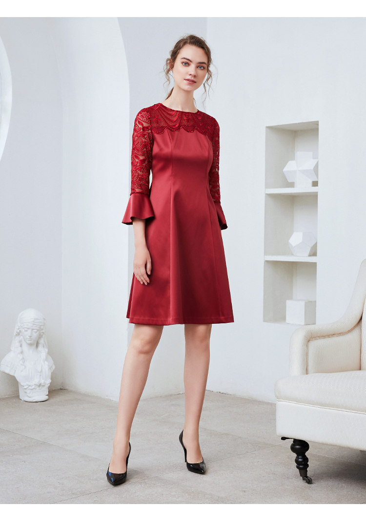 EITIE爱特爱秋季新款洋气复古蕾丝拼接喇叭袖收腰连衣裙女裙C20075124