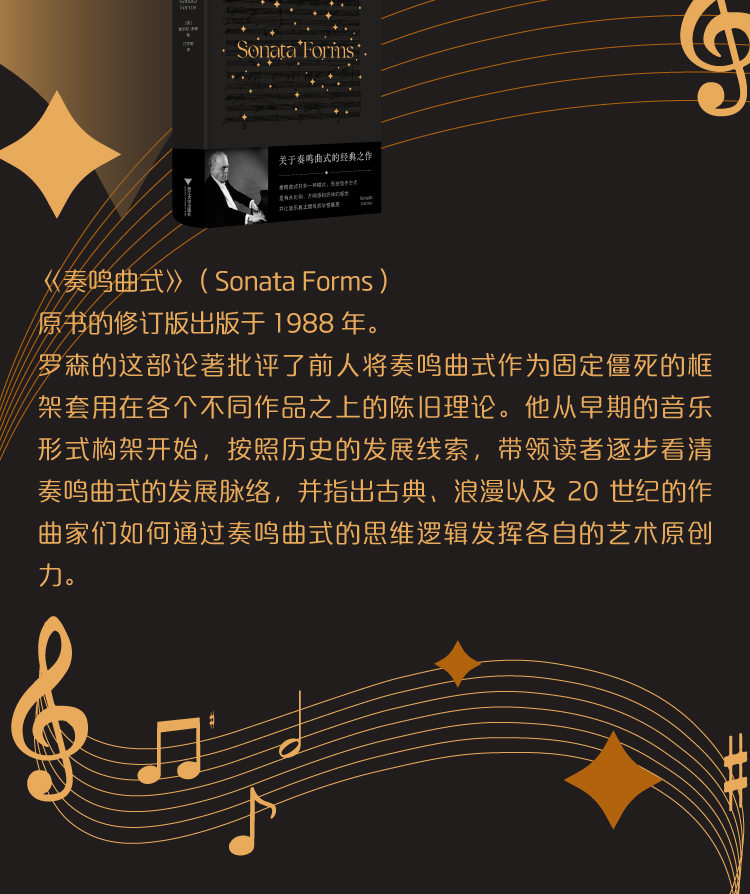 《奏鸣曲式》(Sonata Forms)原书的修订版出版于 1988 年。罗森的这部论著批评了前人将奏鸣曲式作为固定僵死的框架套用在各个不同作品之上的陈旧理论。他从早期的音乐形式构架开始,按照历史的发展线索,带领读者逐步看清奏鸣曲式的发展脉络,并指出古典、浪漫以及 20 世纪的作曲家们如何通过奏鸣曲式的思维逻辑发挥各自的艺术原创力