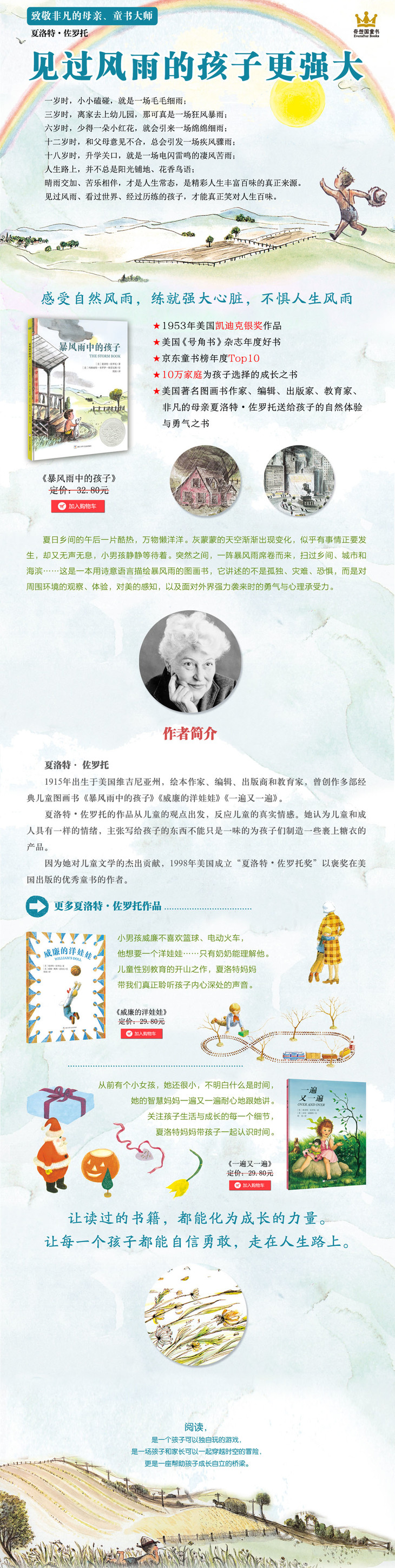 1953年凯迪克银奖作品。作者夏洛特・佐罗托在美国也颇具影响力。她不仅是一位作家,还是一位知名的编辑——曾任哈珀柯林斯童书部门任厄苏拉•诺德斯特姆的助理,后成为编辑、顾问,并创立自己的CZ童书品牌。《暴风雨中的孩子》从一个崭新的视角,描述了孩子观察暴风雨来临前后内心的体验,以及不同的人在经历暴风雨时的感受和心境,真实而美丽,温暖而感人,诗意且灵动。一位美国读者斯诺克这样评价这本书:“我最喜欢的是作者的视觉想象。她能够用词语画出一幅画,而且还能让孩子读得懂。她描写农场周围风景和雨从天瓢泼而下的方式非常迷人。”