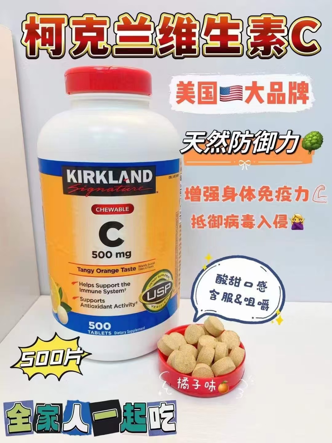 特价179元/瓶 美国kirkland橙味维生素C 500mg*500粒 美国代购,无中文标签,介意慎拍