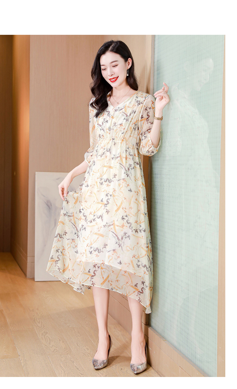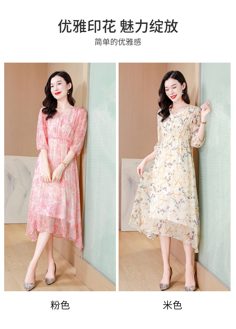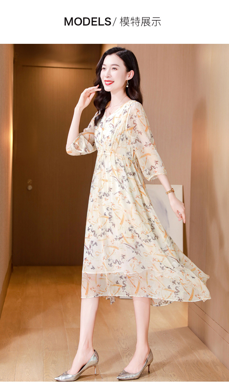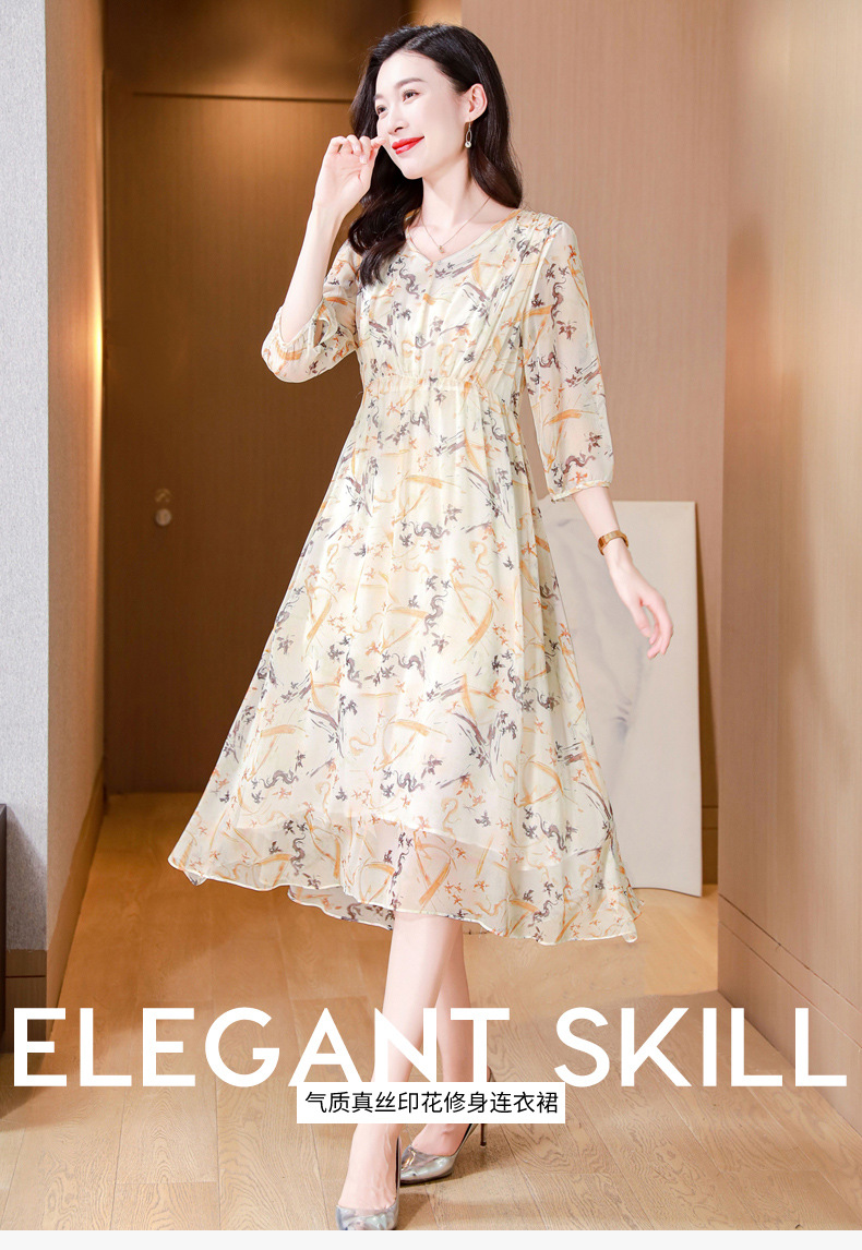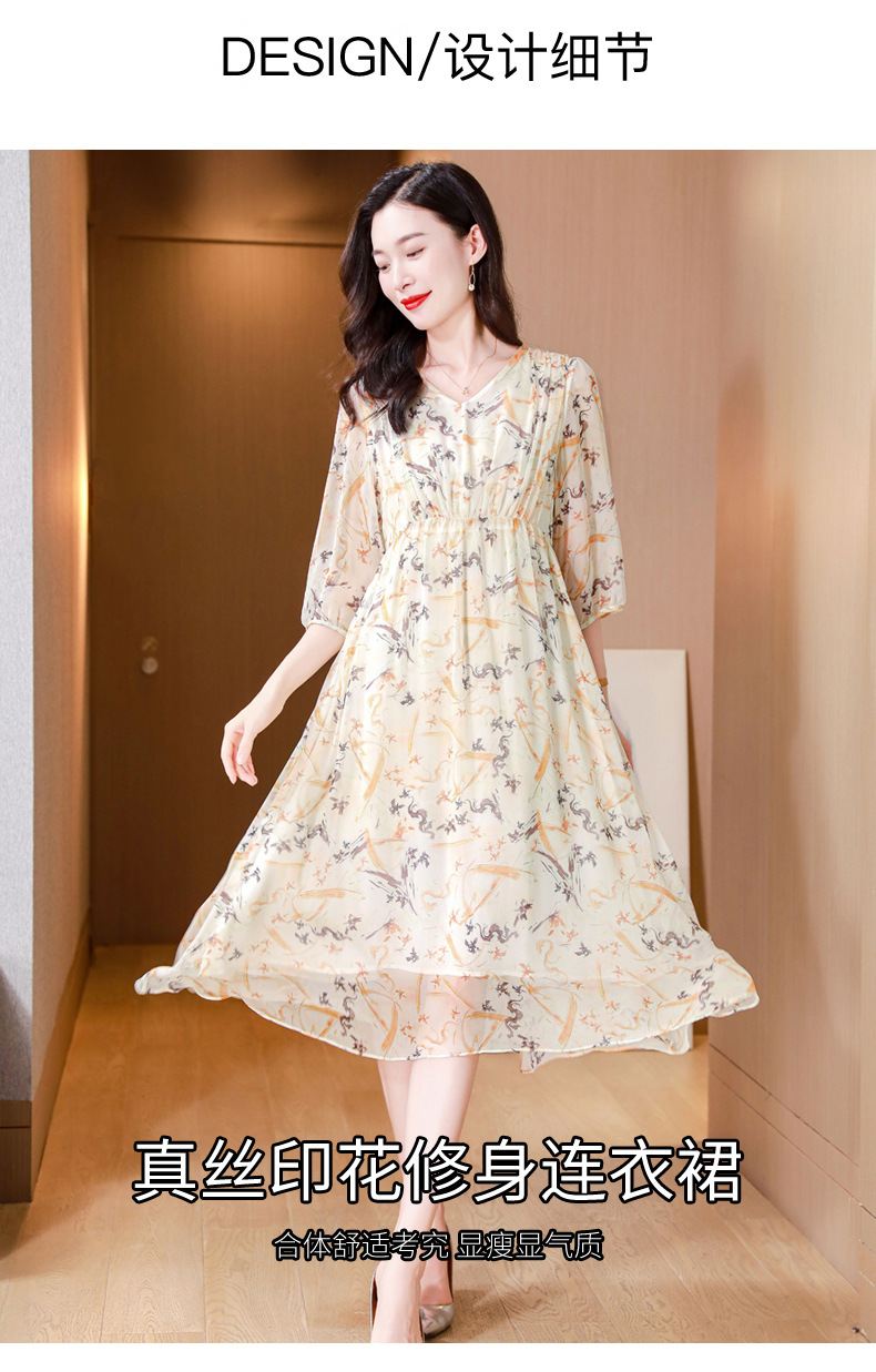 ASE-25012夏季印花V领气质知性百搭真丝连衣裙