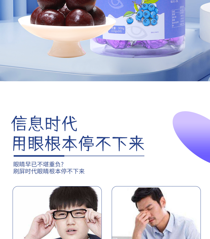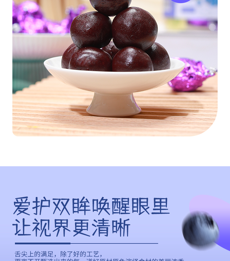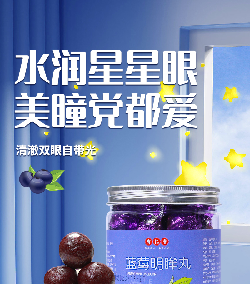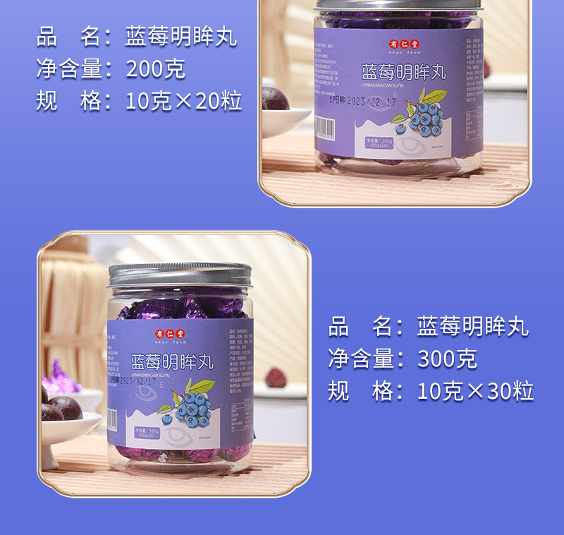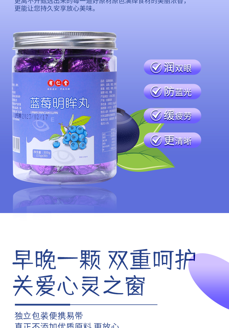 有仁堂蓝莓明眸丸 保护视力明眸善睐 用眼过度视力下降 眼睛酸胀视线模糊 自然营养口感细腻香甜