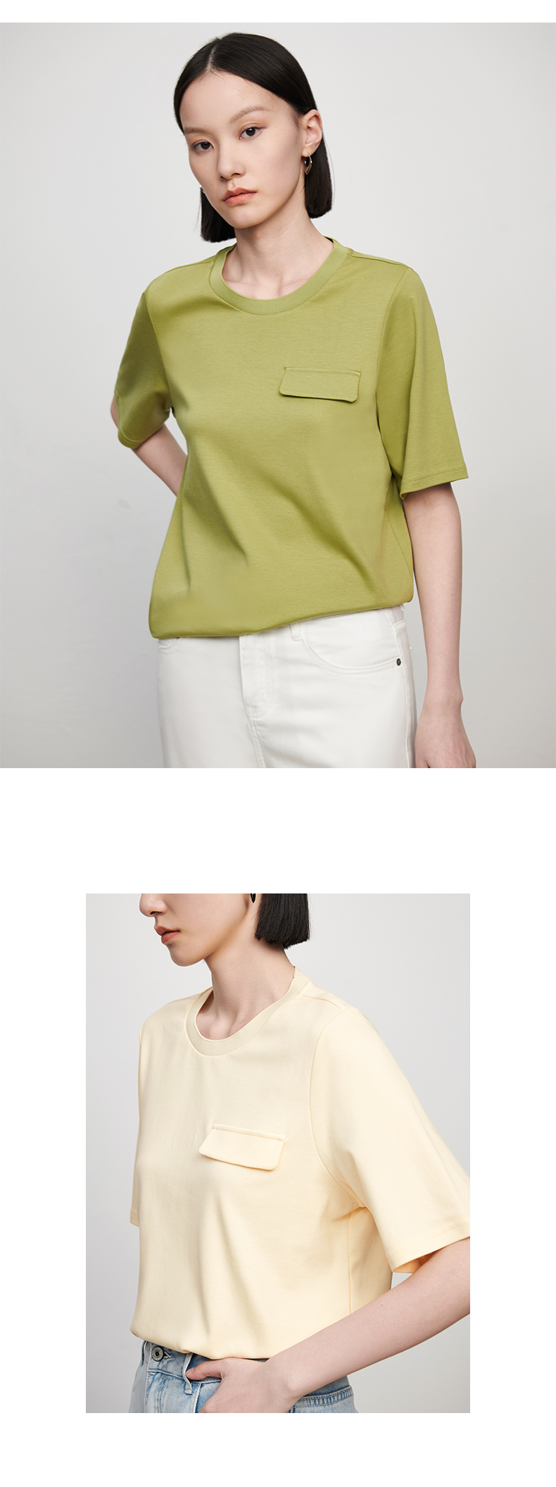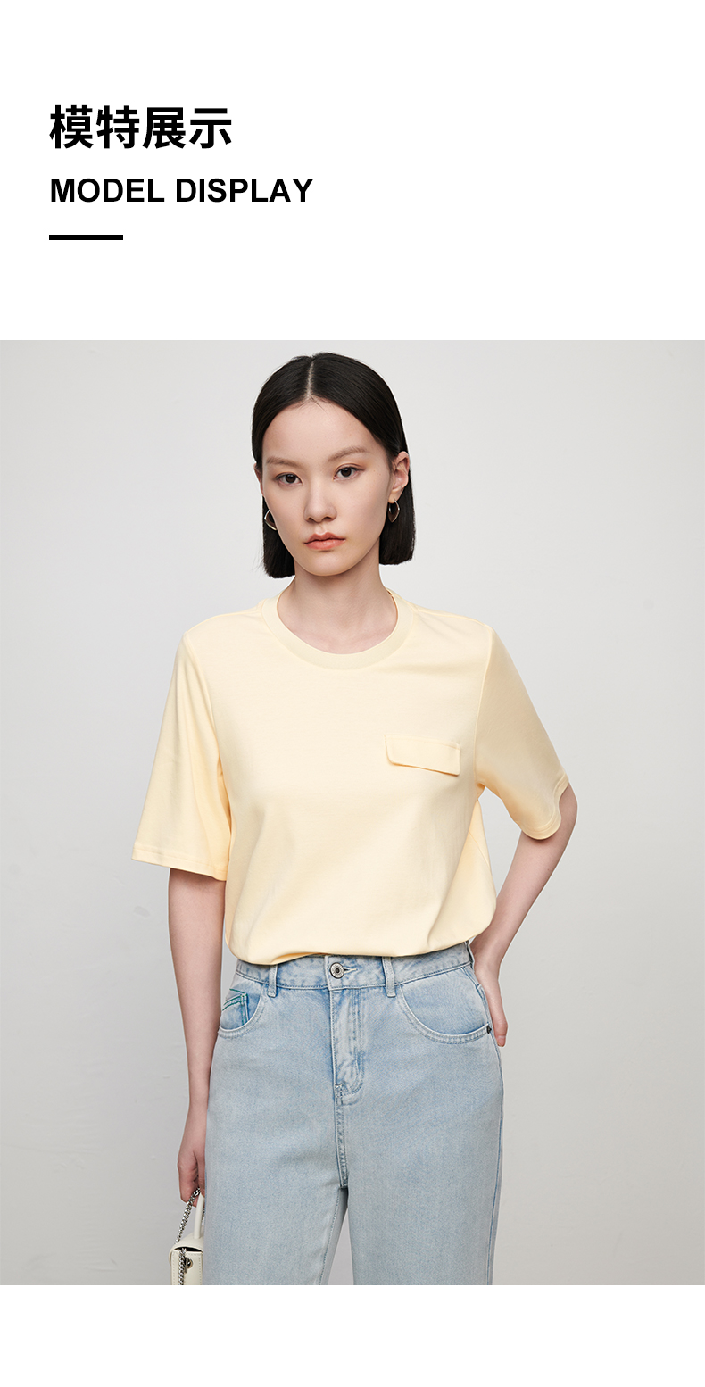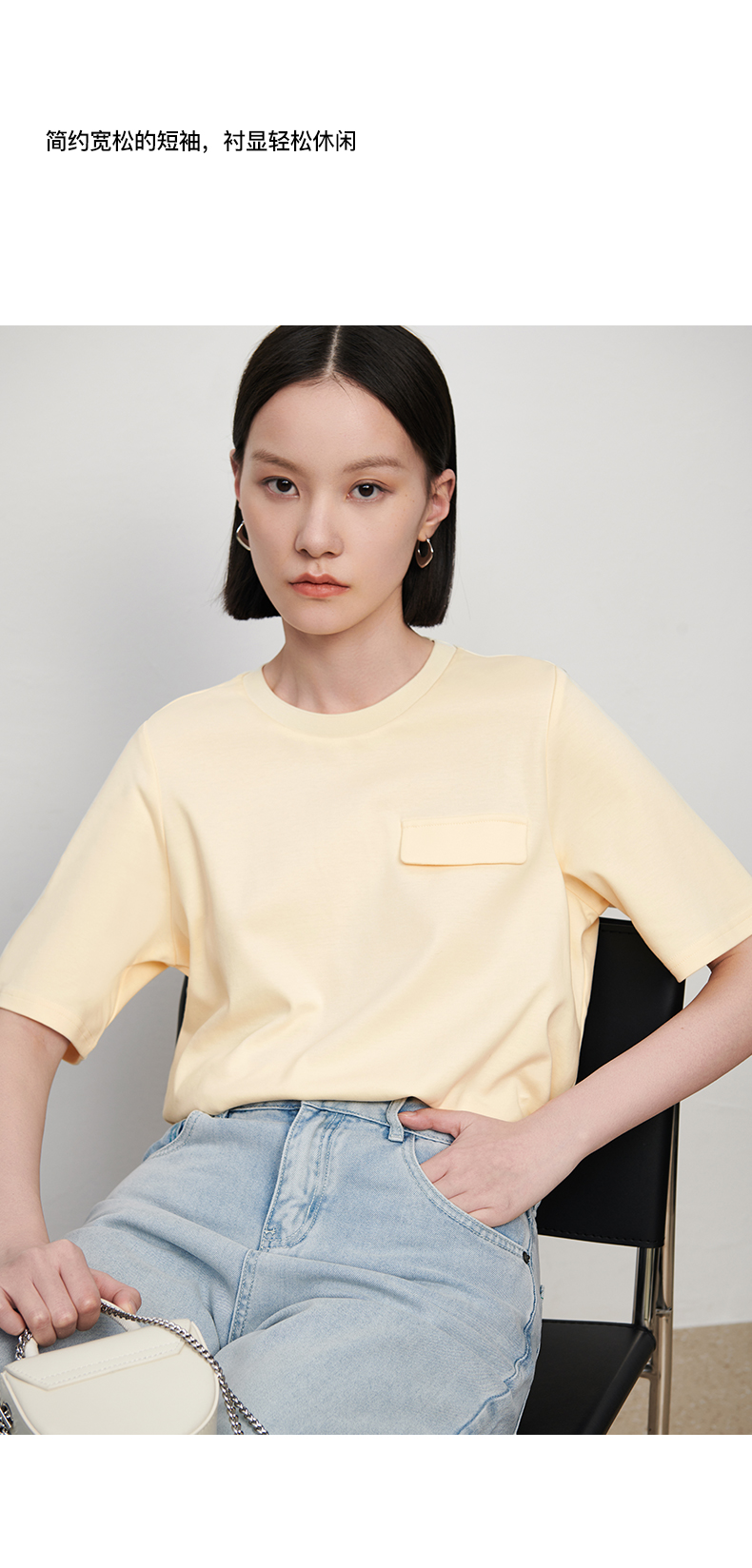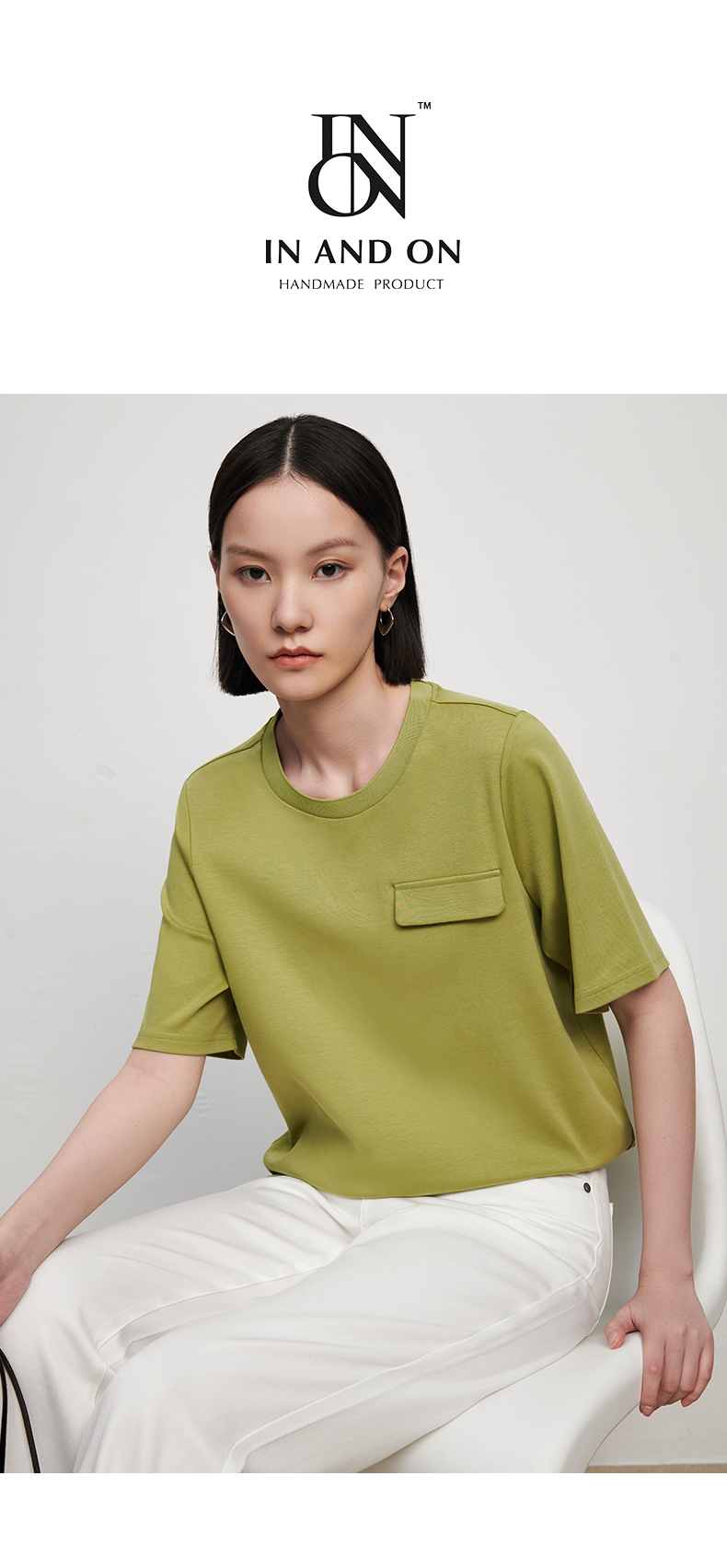 IN AND ON21431夏季新款全棉短袖T恤女短款直筒显瘦口袋纯色上衣