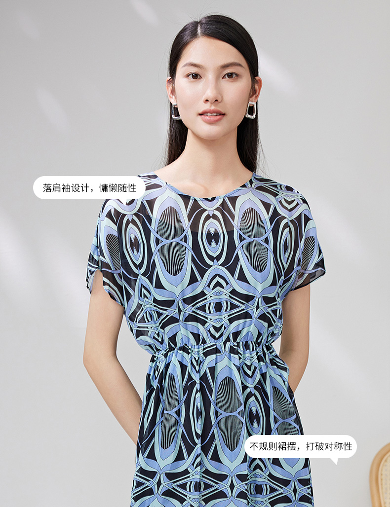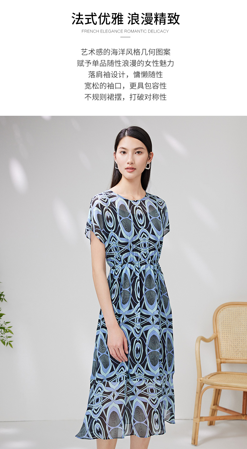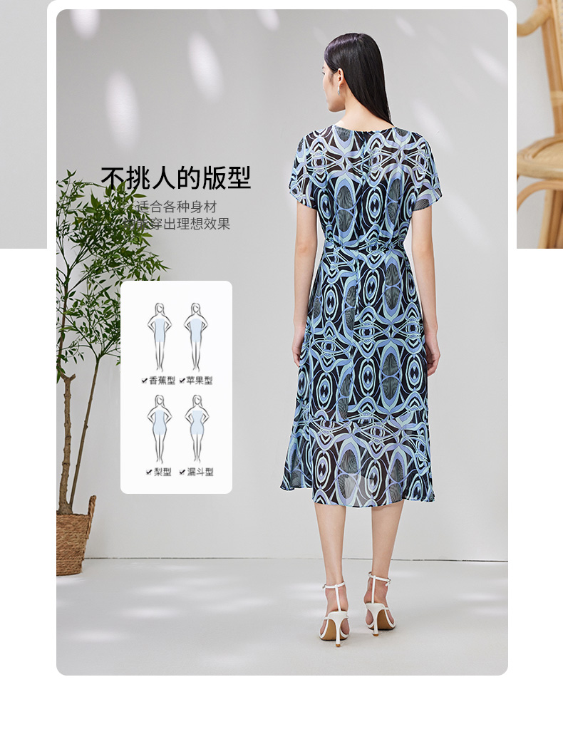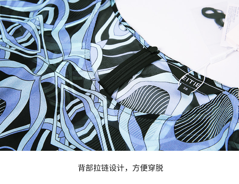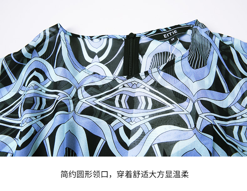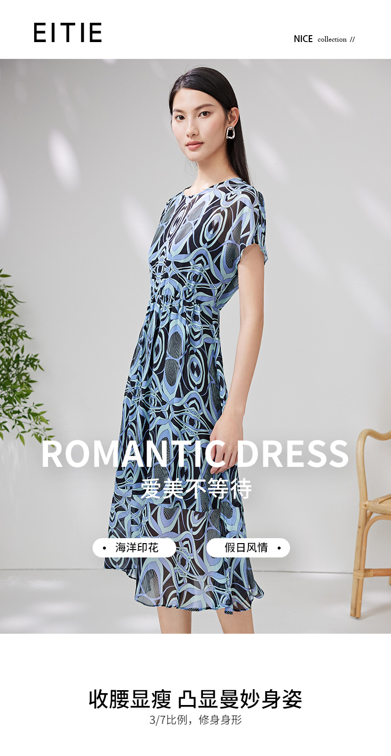 EITIE爱特爱夏款新品100%桑蚕丝优雅显瘦高腰舒适印花连衣裙7007728