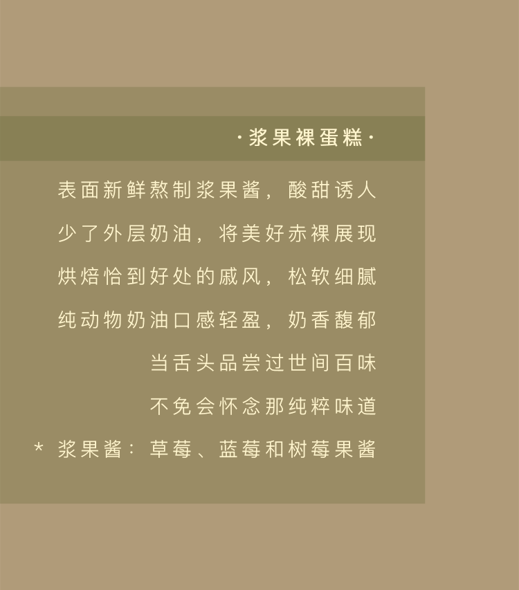 - 裸蛋糕,专注于甜点无添加的健康理念。生日蛋糕、婚礼甜品桌、茶歇宴会及私人定制。裸蛋糕的初念,源于对身边人的爱;简单,不失真诚;不乏奢华。