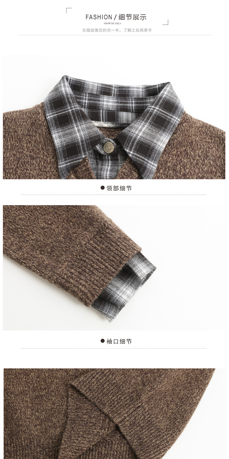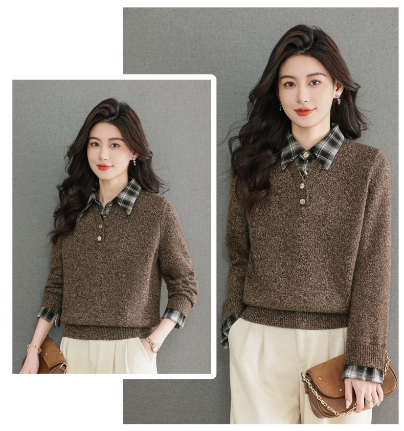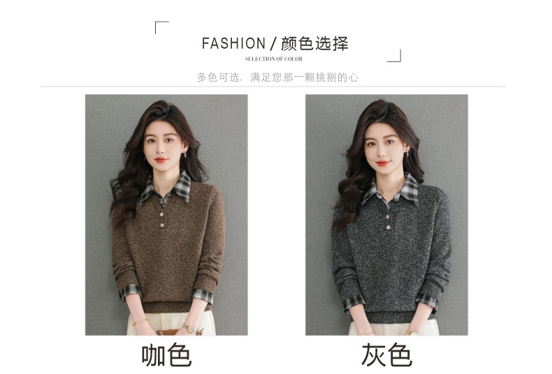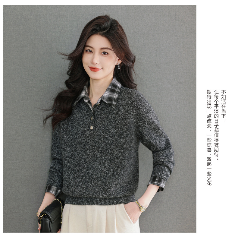 CC 88812优雅通勤格纹领拼接Polo毛衣毛绒质感宽松显瘦针织上衣