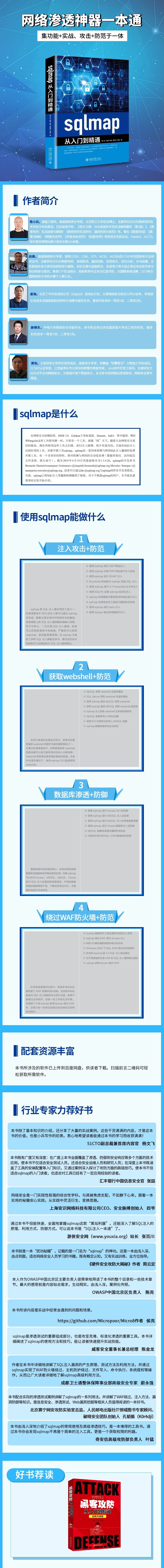 本书从实战的角度,介绍如何利用sqlmap渗透Web服务器,对sqlmap进行深入的研究和分析,是一本全面、系统地介绍sqlmap的书籍。本书共8章,以sqlmap渗透必备基础开始,由浅入深地介绍利用sqlmap进行渗透攻击的各个维度,主要内容包括sqlmap安装及使用、使用sqlmap进行注入攻击、使用sqlmap获取webshell、使用sqlmap进行数据库渗透及防御、使用sqlmap进行渗透实战、使用sqlmap绕过WAF防火墙、安全防范及日志检查等。结合作者十多年的网络安全实践经验,本书对各种SQL注入漏洞给出了相应的安全防范措施,书中还对一些典型漏洞防护进行了实战解说。