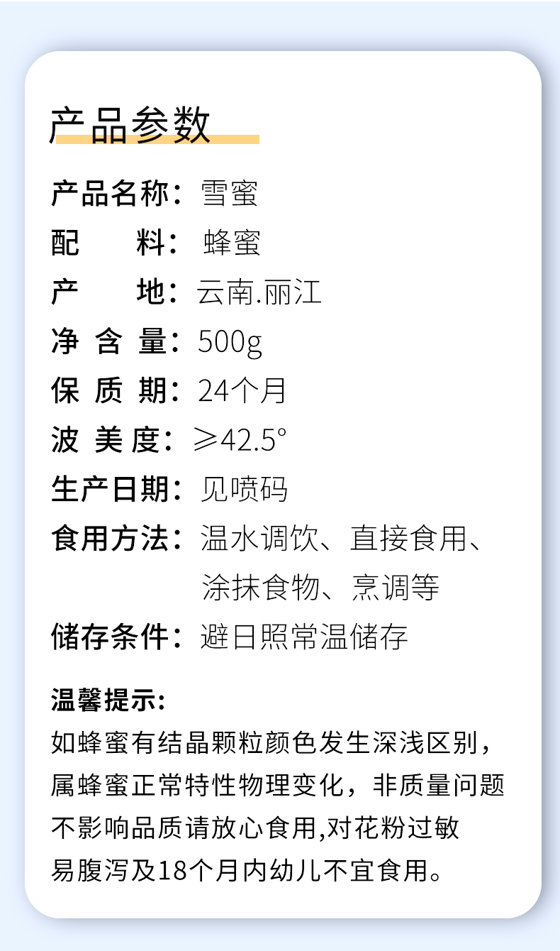 【云蜜典范 云南雪蜜】500G一瓶,天然蜜源,雪山气候独特,质地稠厚,晶莹润泽,口感绵柔丝滑,甜而不腻,香气四溢~