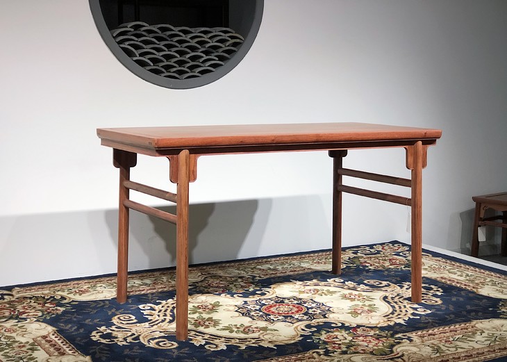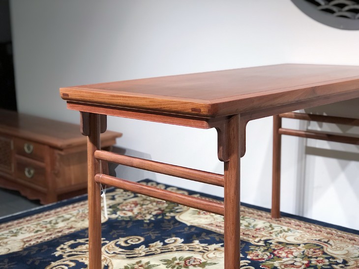 此款精仿的刀牙书案四圆柱腿,带明显的侧脚收分,全身除冰盘沿线脚略带造型,其余皆无纹,连牙板牙条也不似平常延边缘起阳线,而是任其光素,将明式的简练质朴表现的淋漓尽致,整体造型美观大方,极具稳定感,且周身光素无雕饰,体现了明式家具十六品中的简练、朴素之美。