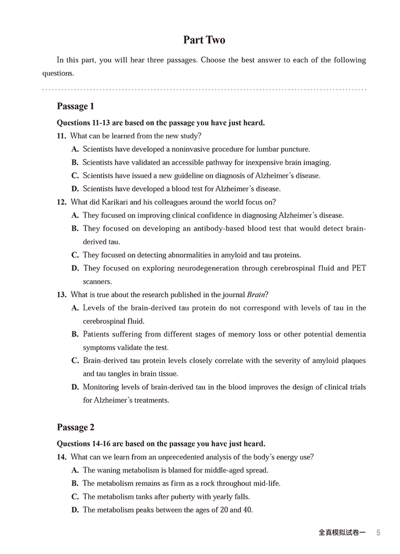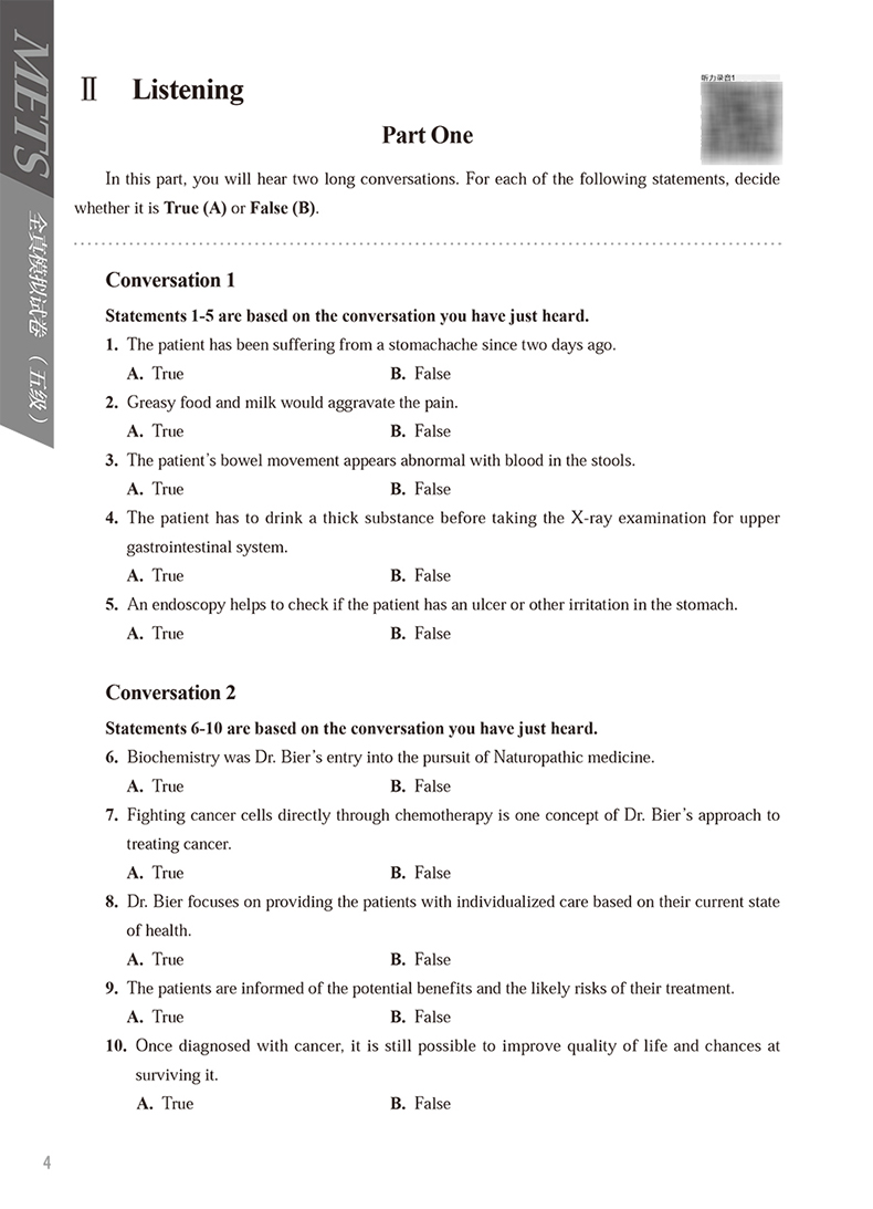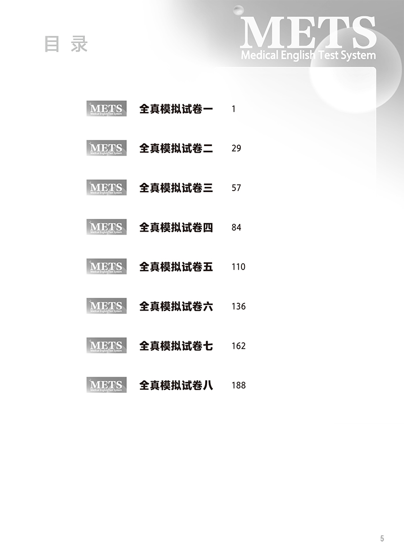 全真模拟试卷的定位是考前复习资料,方便考生熟悉考试题型,了解考试难度,为考生做好考前自测。各试卷结合医学英语水平考试的考试大纲,参考真实考试的深度、广度和难度组卷,共包括八套试卷。本书具有突出职业针对性、强调应用能力、考查综合能力、兼顾不同层次四大特点,重点考查应试人员在医疗环境下熟练运用专业语言学习和工作的能力,是院校医学英语教学水平的测评标准,是医疗机构人员招聘、员工考核、职称评定和人才选拔的参考标准和评价工具。