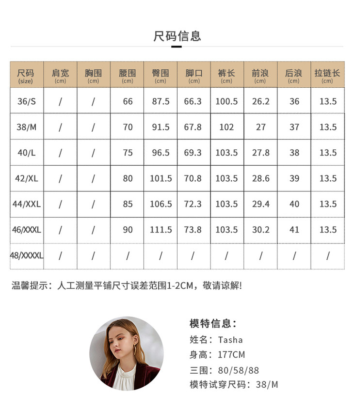| 号型 | 裤长/cm | 腰围/cm | 臀围/cm | 前浪/cm | 后浪/cm | 拉链长/cm | 脚口/cm |