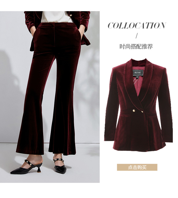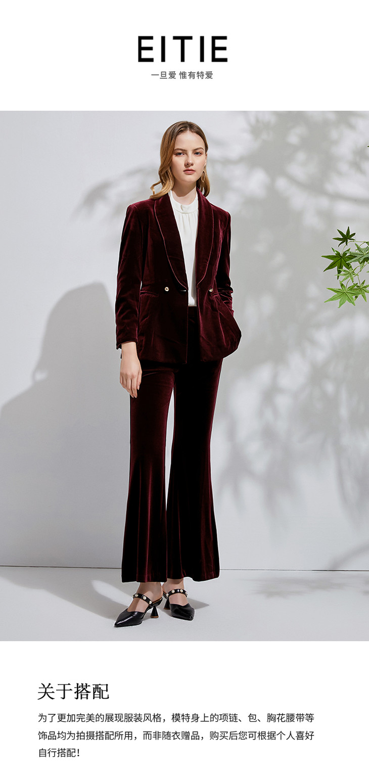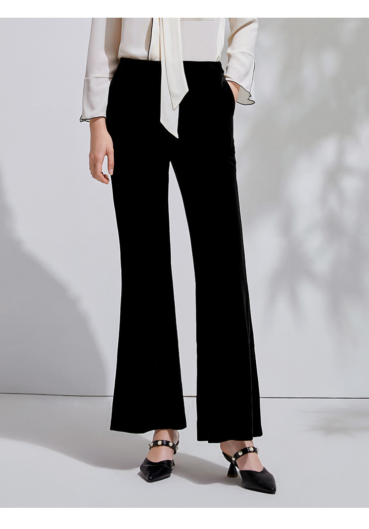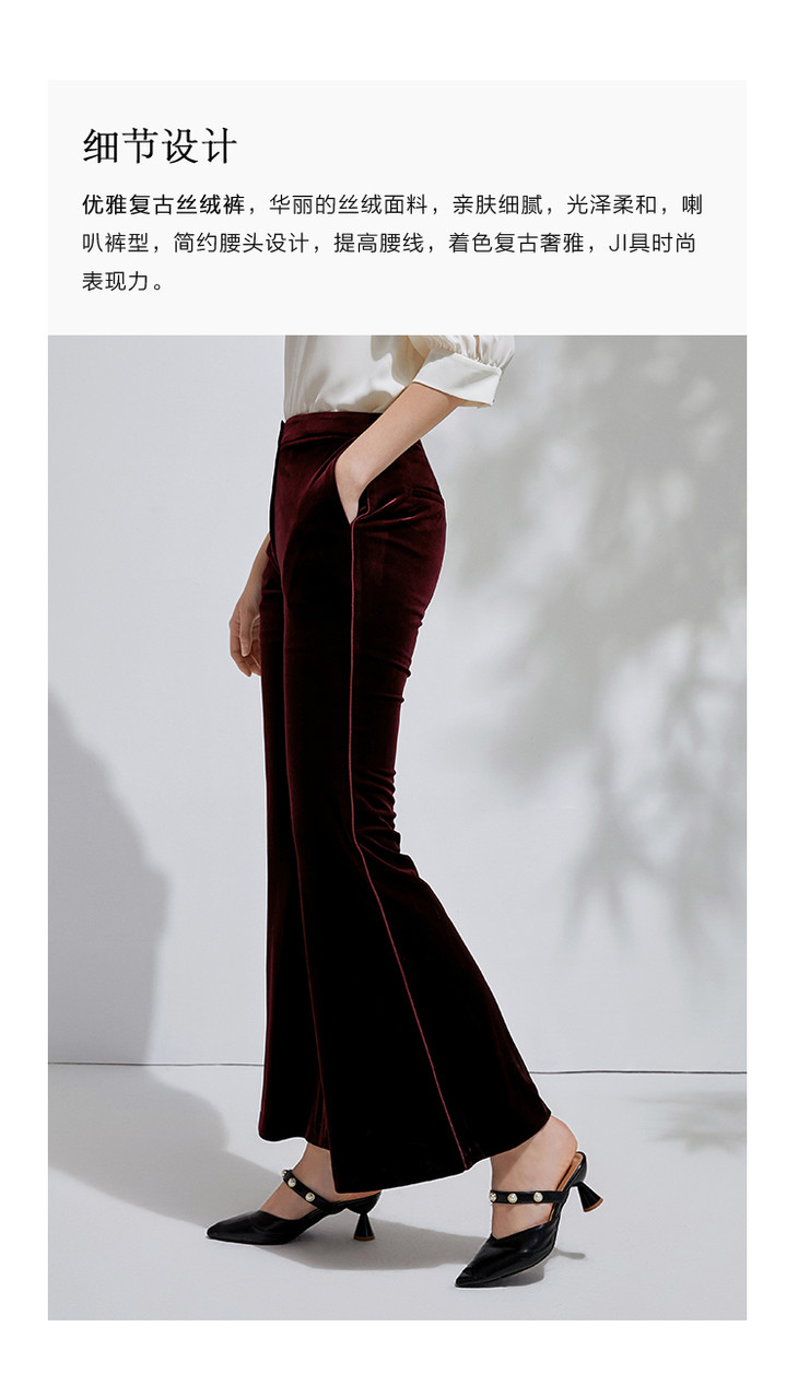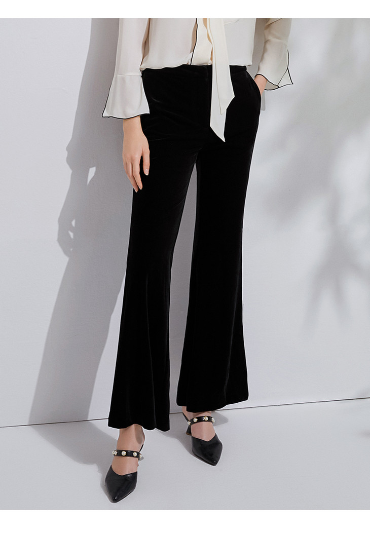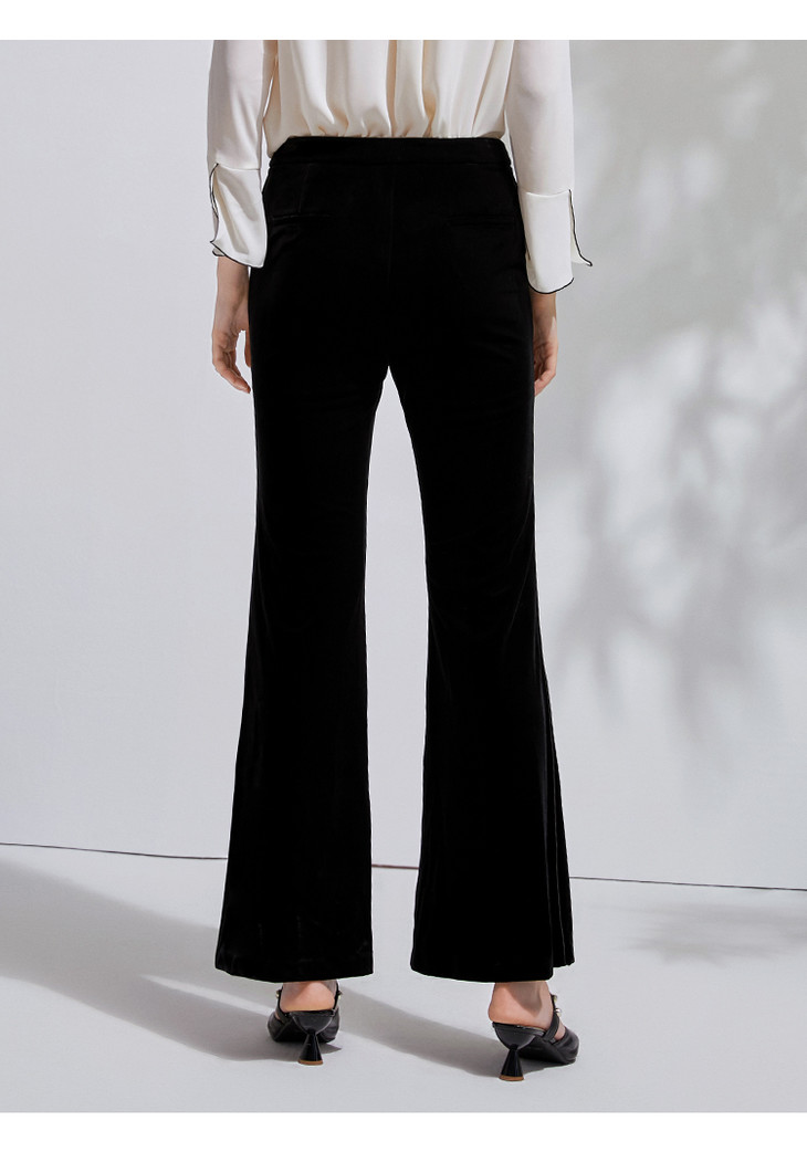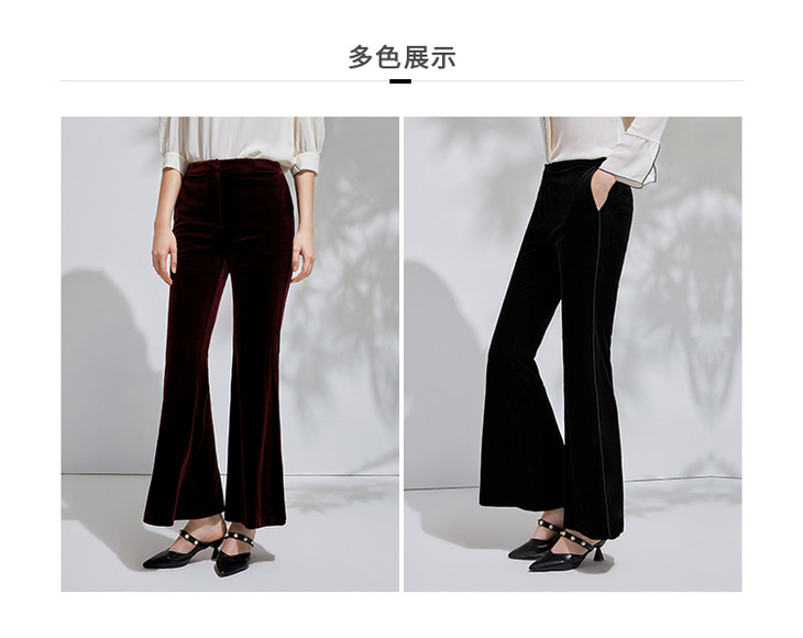 EITIE爱特爱春季新款时尚通勤复古洋气中腰丝绒喇叭长裤女裤6305010