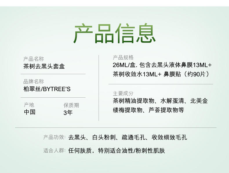 BYTREE'S柏翠丝 小绿瓶去黑头套盒 13ml *13ml(鼻膜+鼻贴+收敛水) 温和去黑头 平衡水油肌 去粉刺闭口 我是大美人精选
