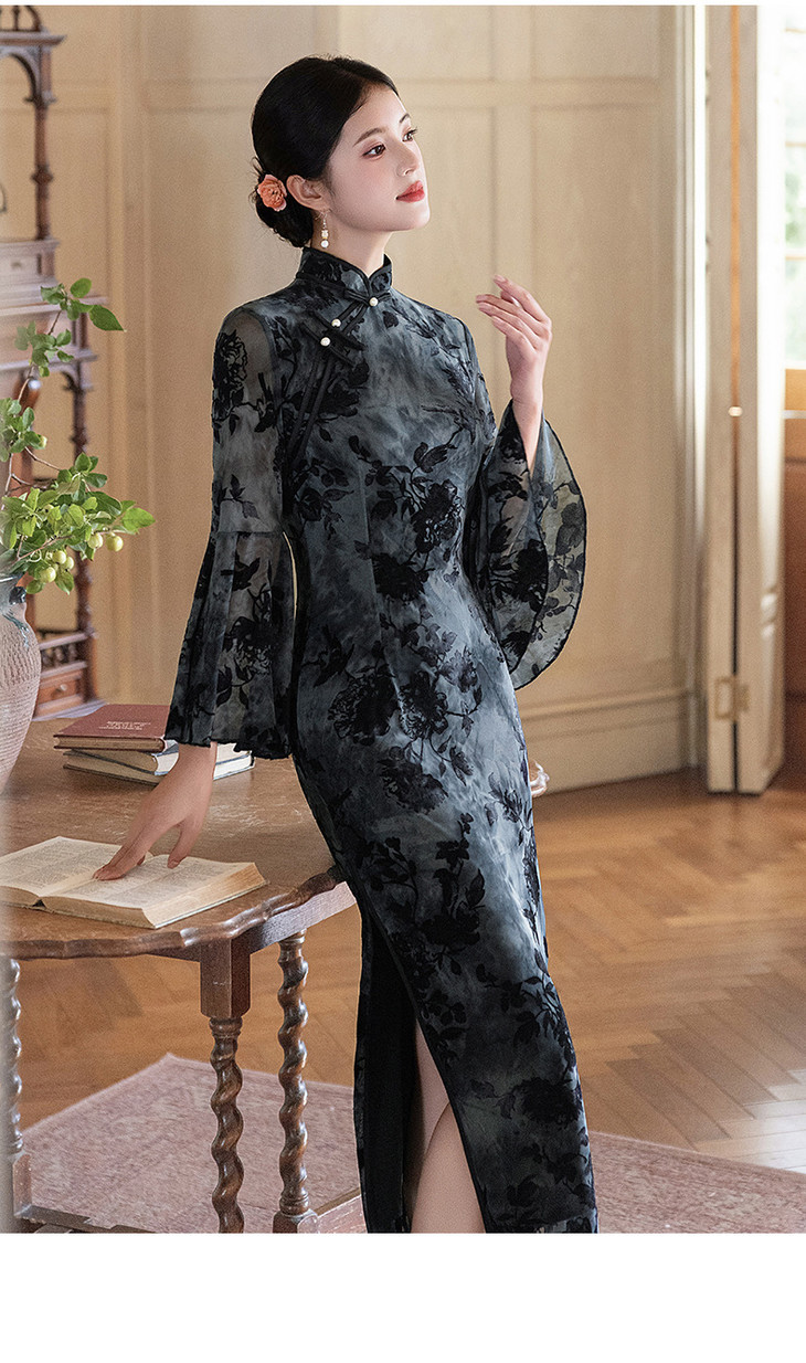 【雁归来】黑色旗袍改良复古喇叭袖,新中式连衣裙优雅气质LSB4038
