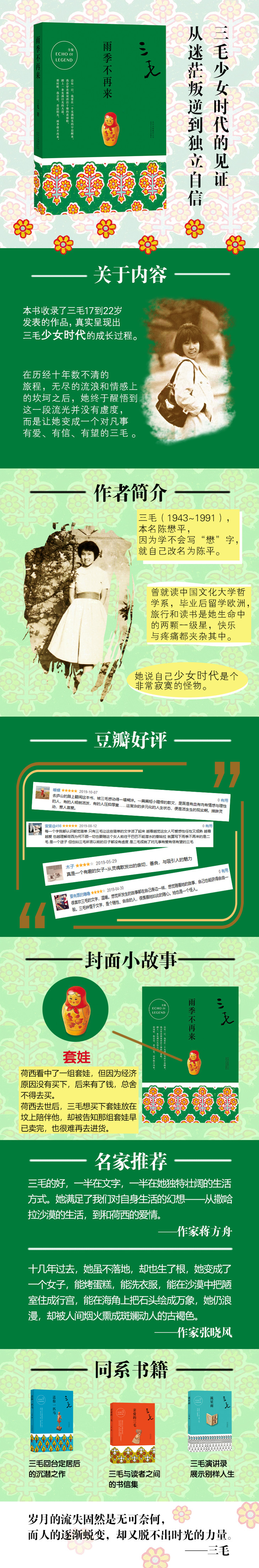 《雨季不再来》收录了三毛17~22岁发表的作品。当三毛还是二毛的时候,她是一个逆子,追求每一个年轻人自己也说不清的那份情怀,用文字记录下思想上的迷惘与感伤。然而历经十年数不清的旅程,无尽的流浪和情感上的坎坷之后,她终于醒悟到了这一段日子并虚度,而是让她成为了一个对凡事有爱、有信、有望的三毛,造就了她的浪漫与真性情。那交错着甜蜜伤感少年心事的雨季虽然漫长,却总有一日,可以穿着干燥的黄球鞋踏上充满阳光的大道。