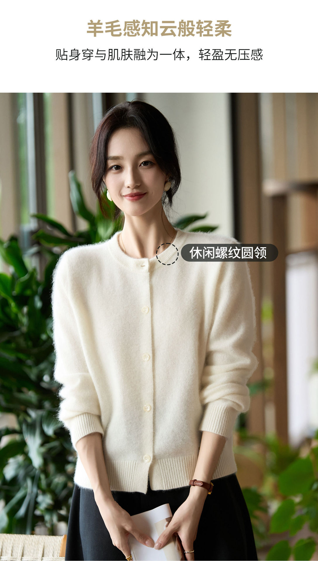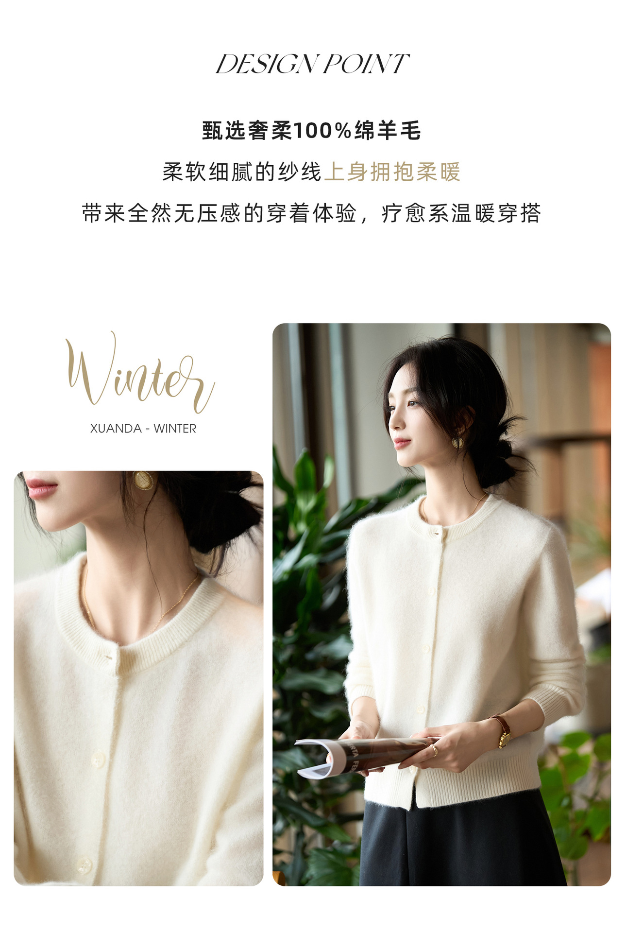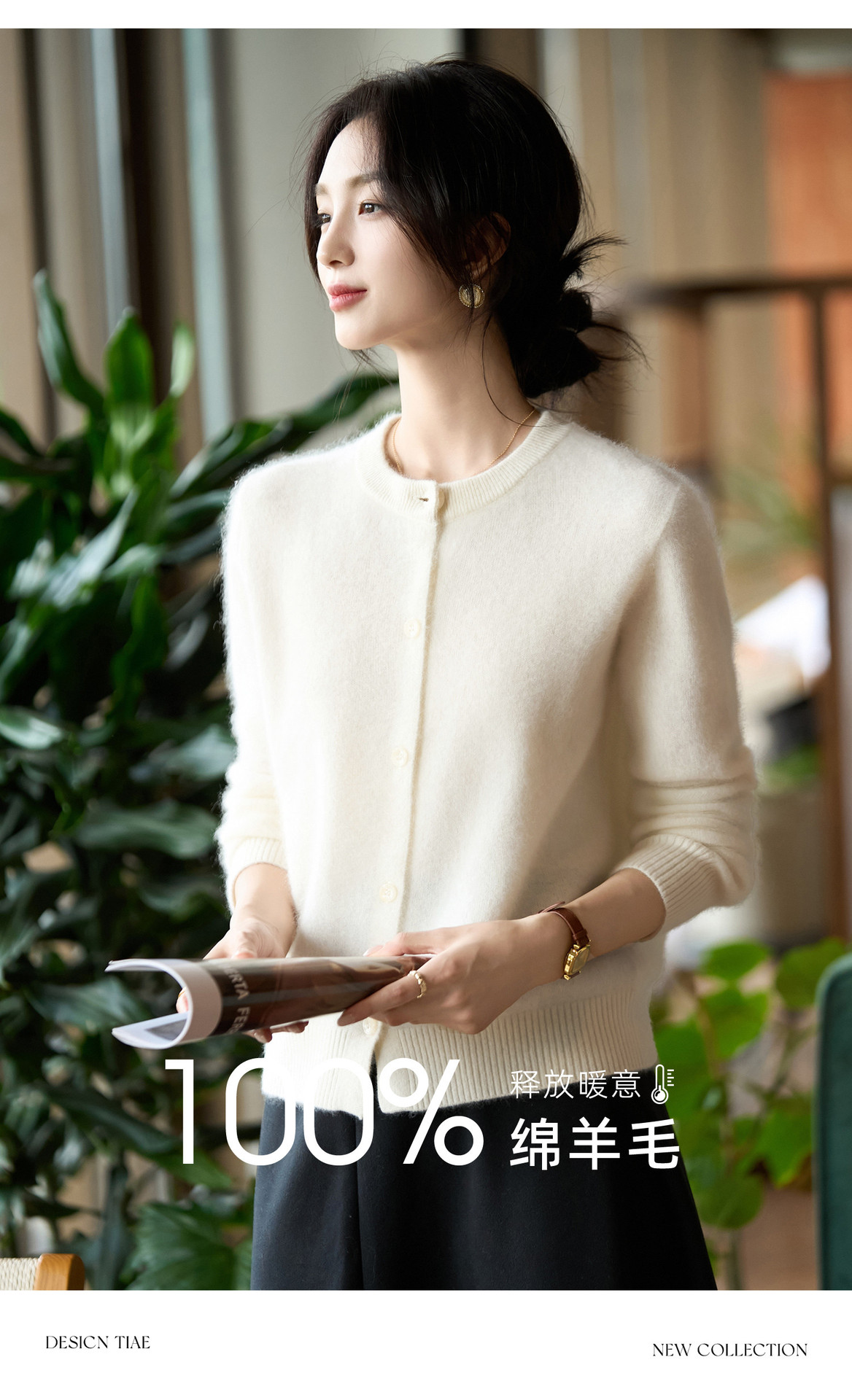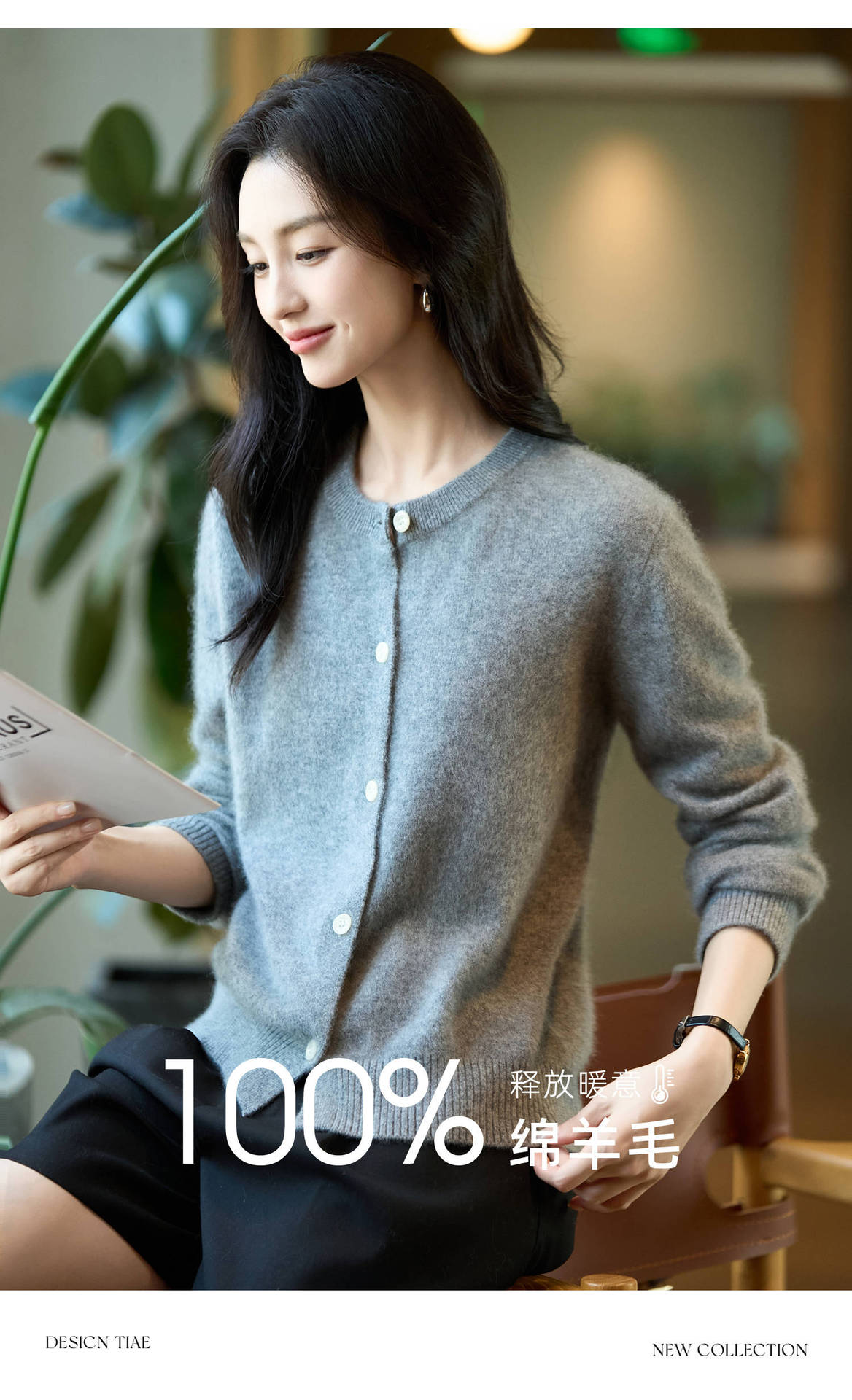 丁摩 100%纯羊毛针织开衫女圆领纯色毛衣外套NS-5178