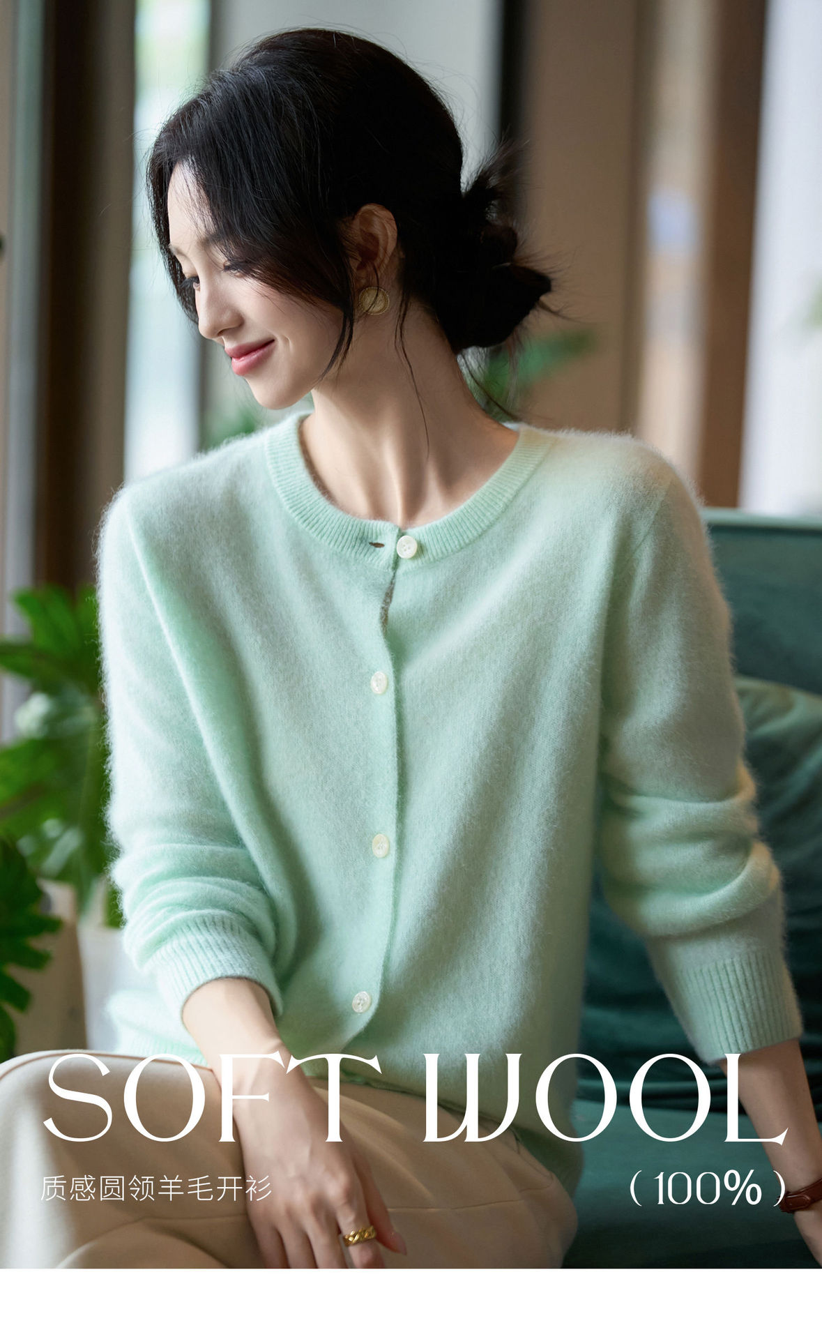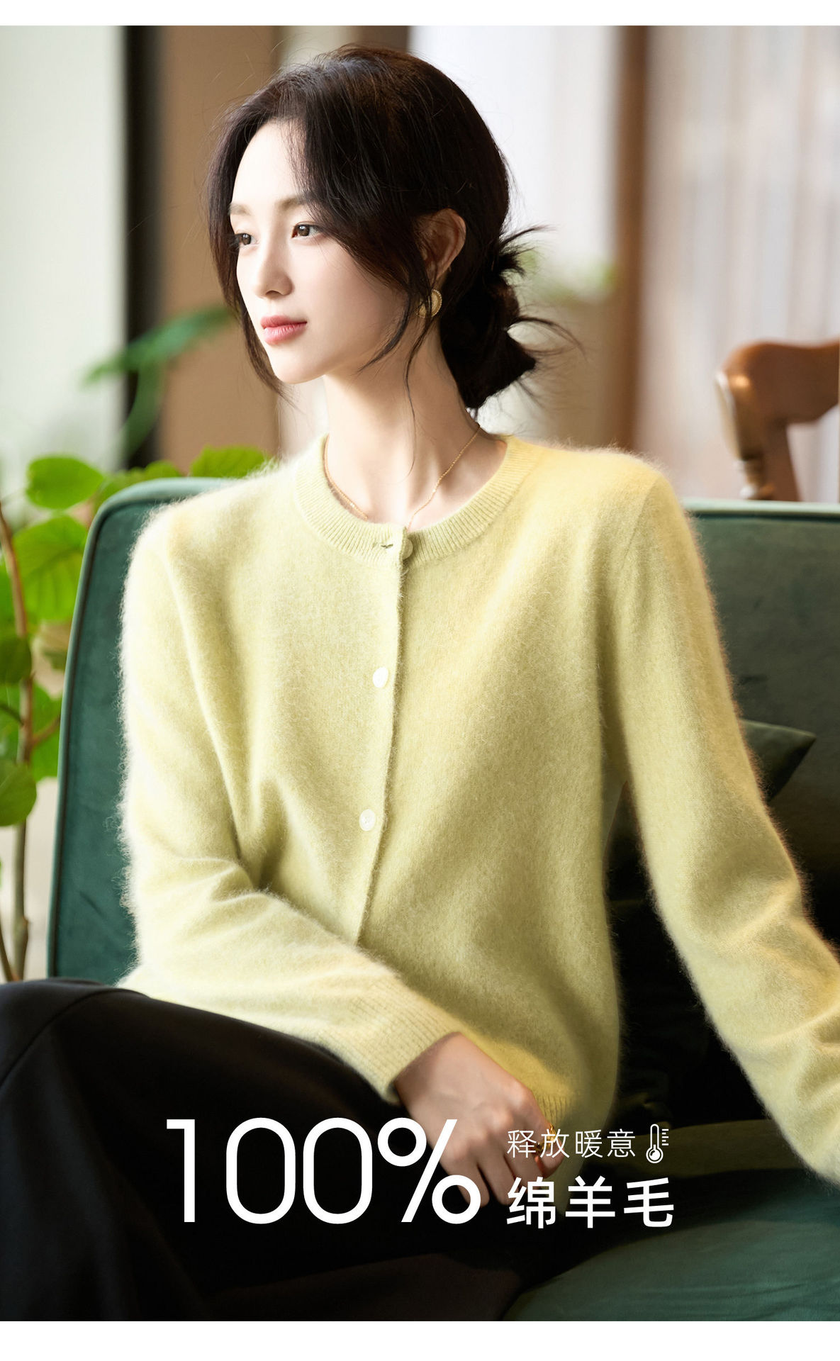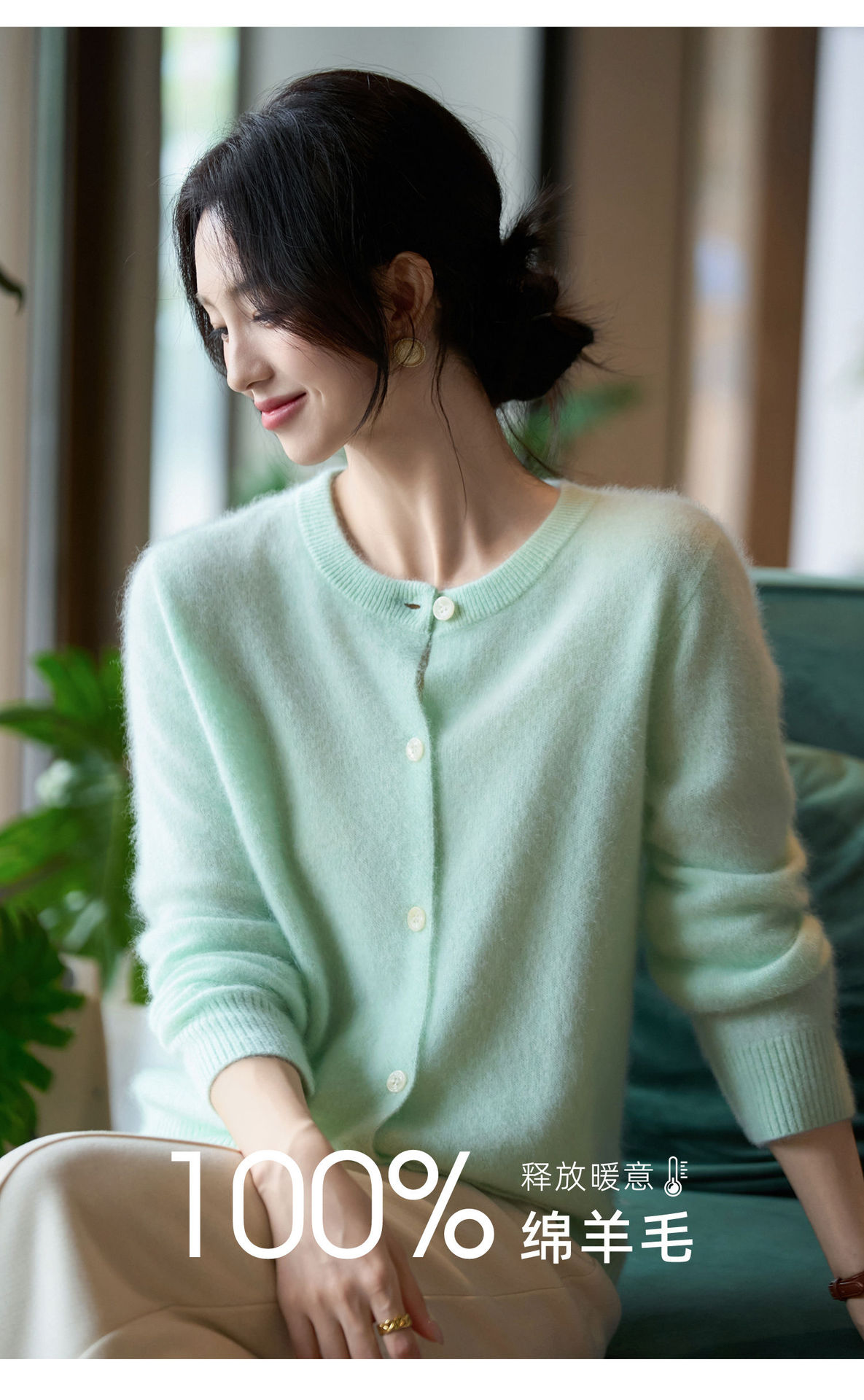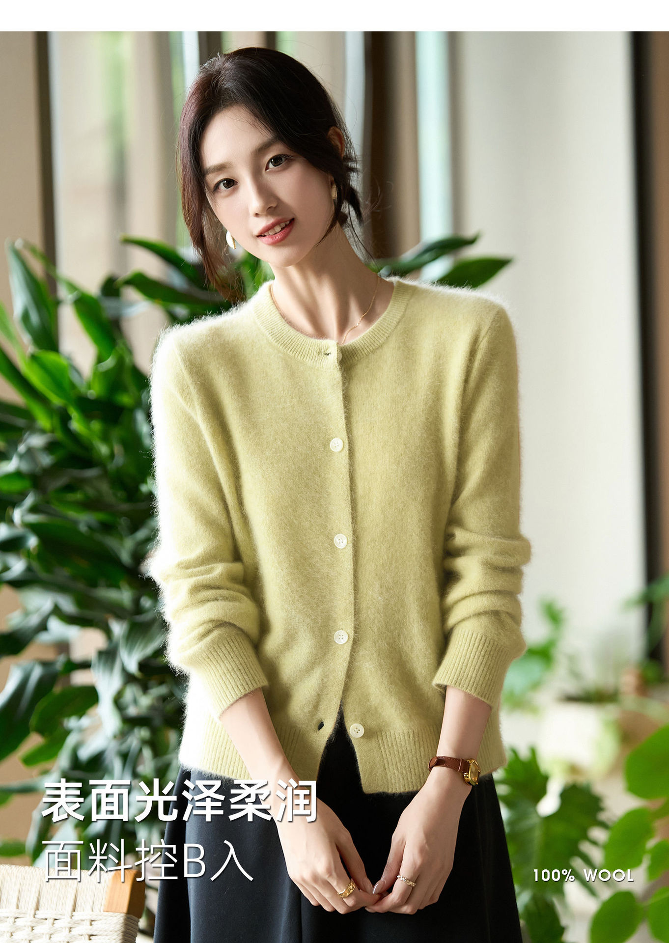 丁摩 100%纯羊毛针织开衫女圆领纯色毛衣外套NS-5178