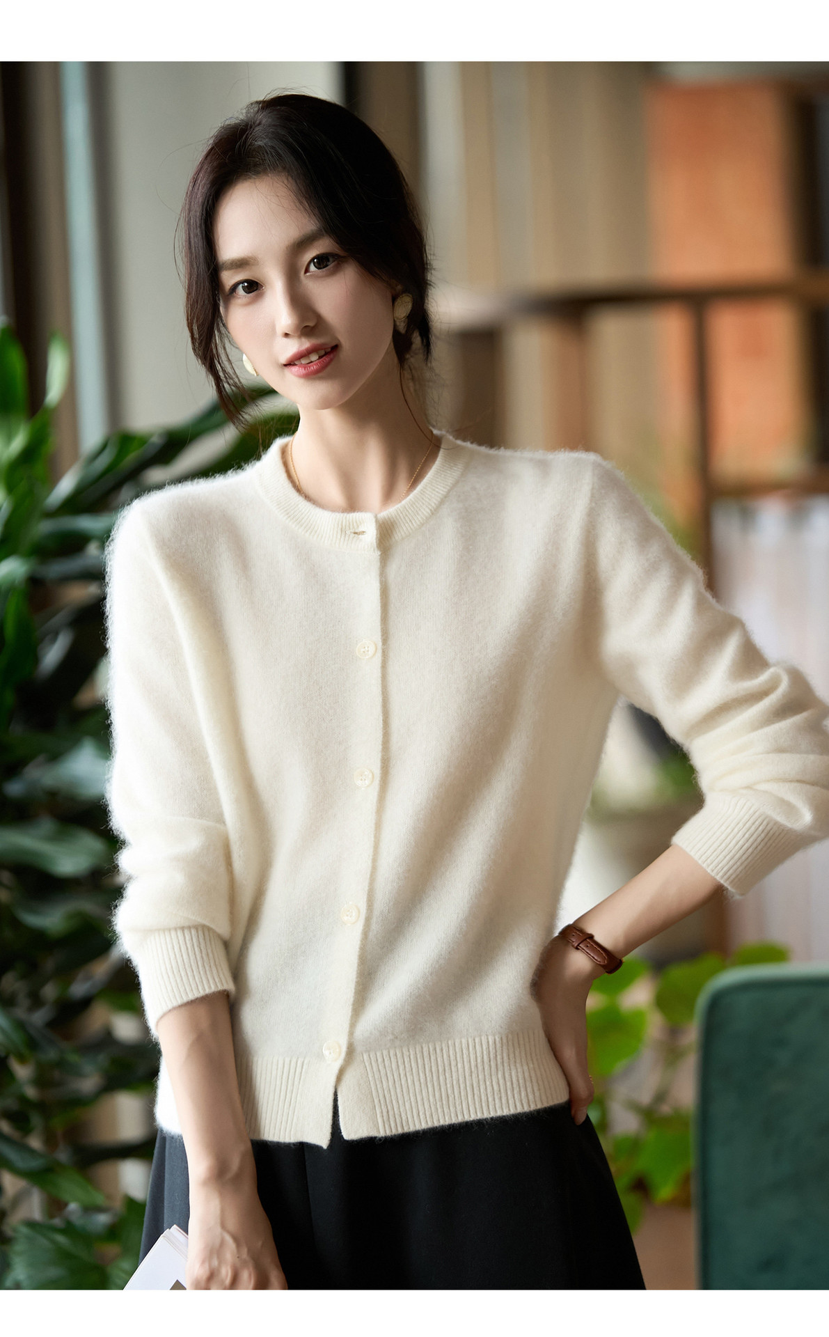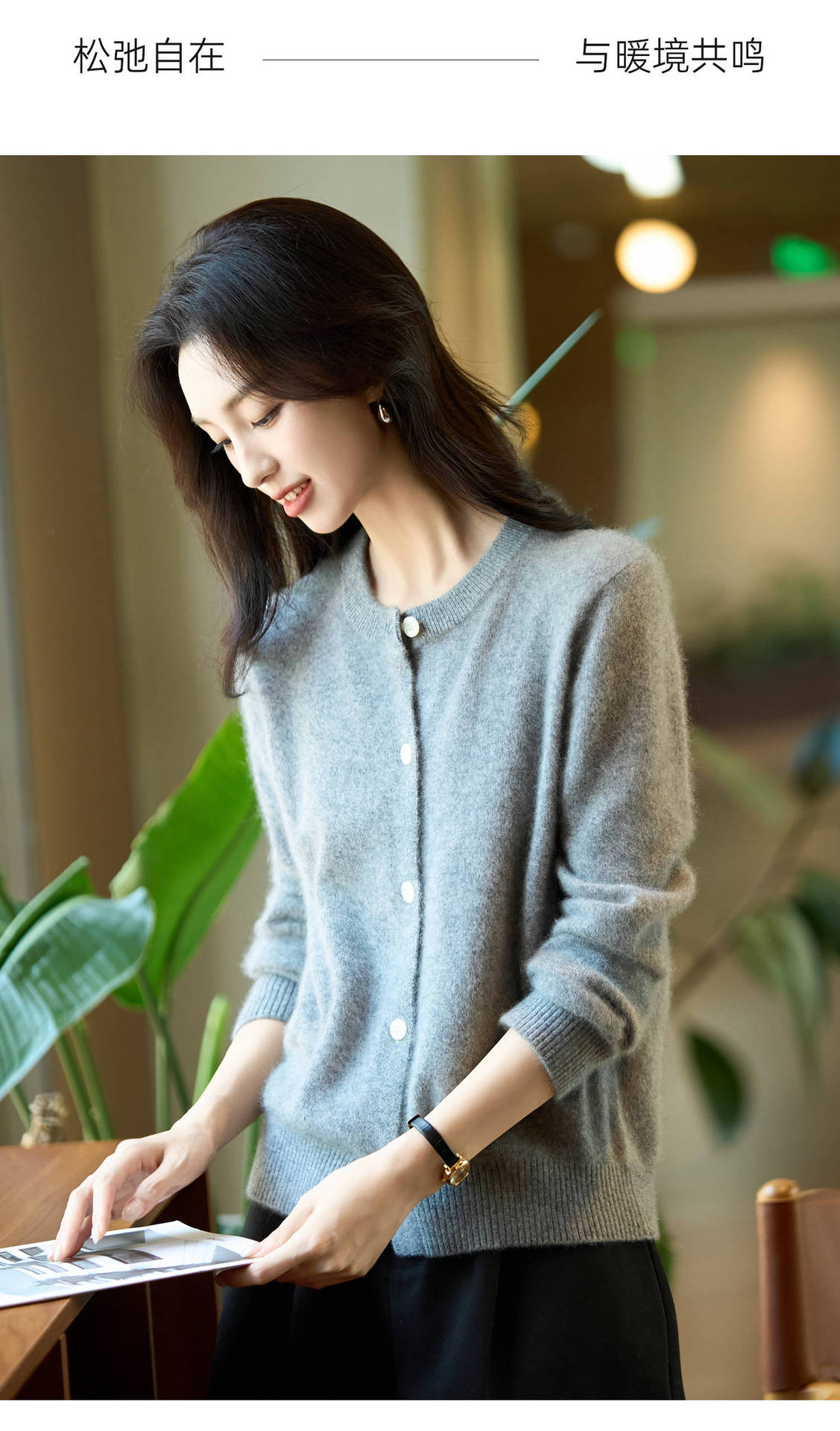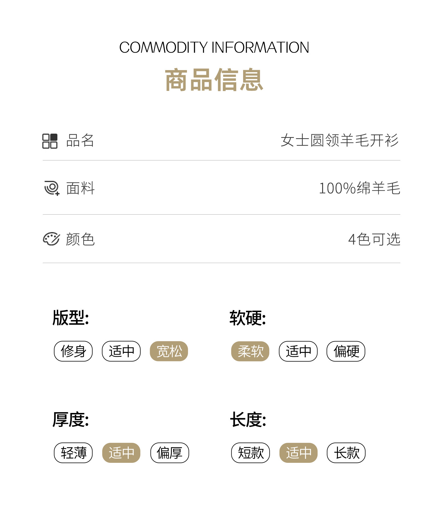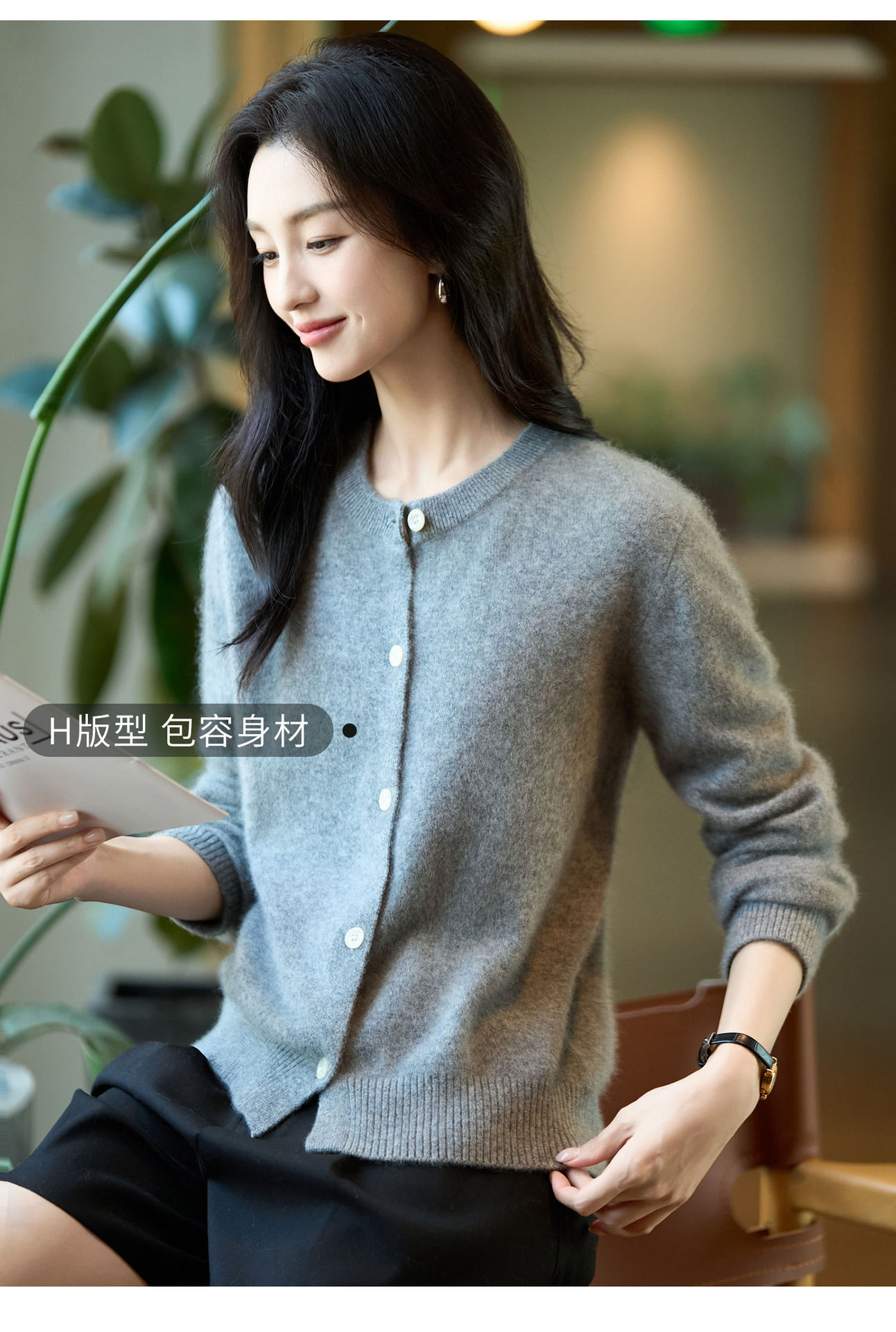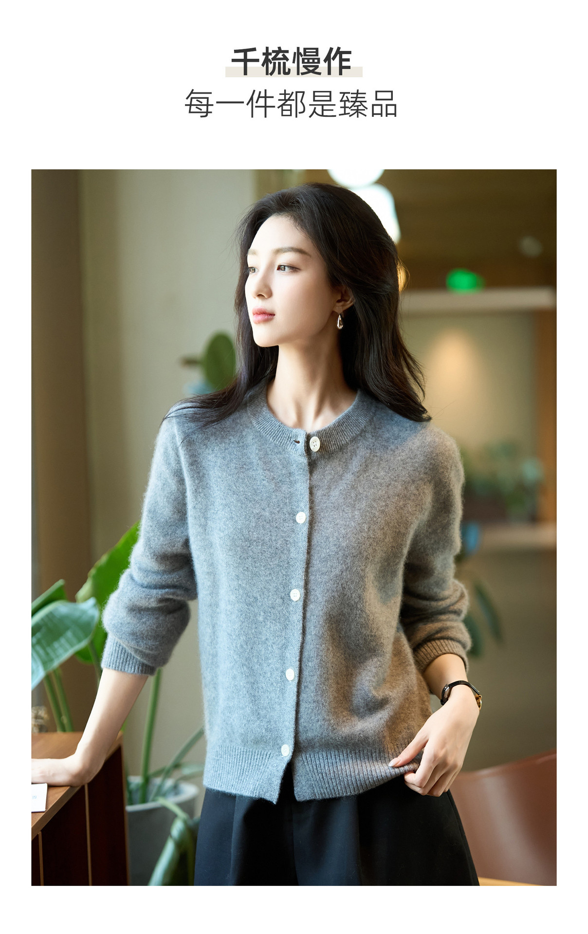丁摩 100%纯羊毛针织开衫女圆领纯色毛衣外套NS-5178