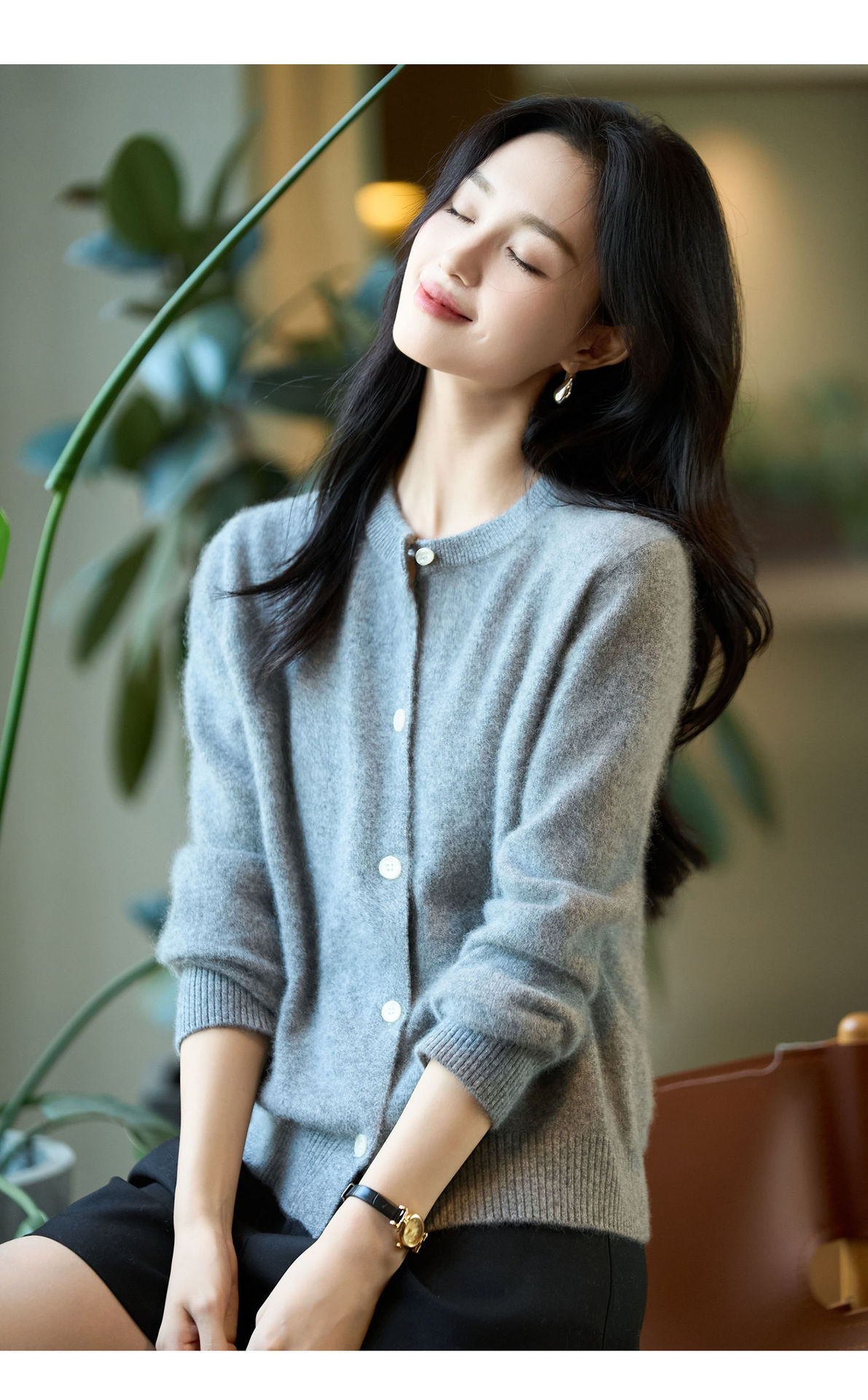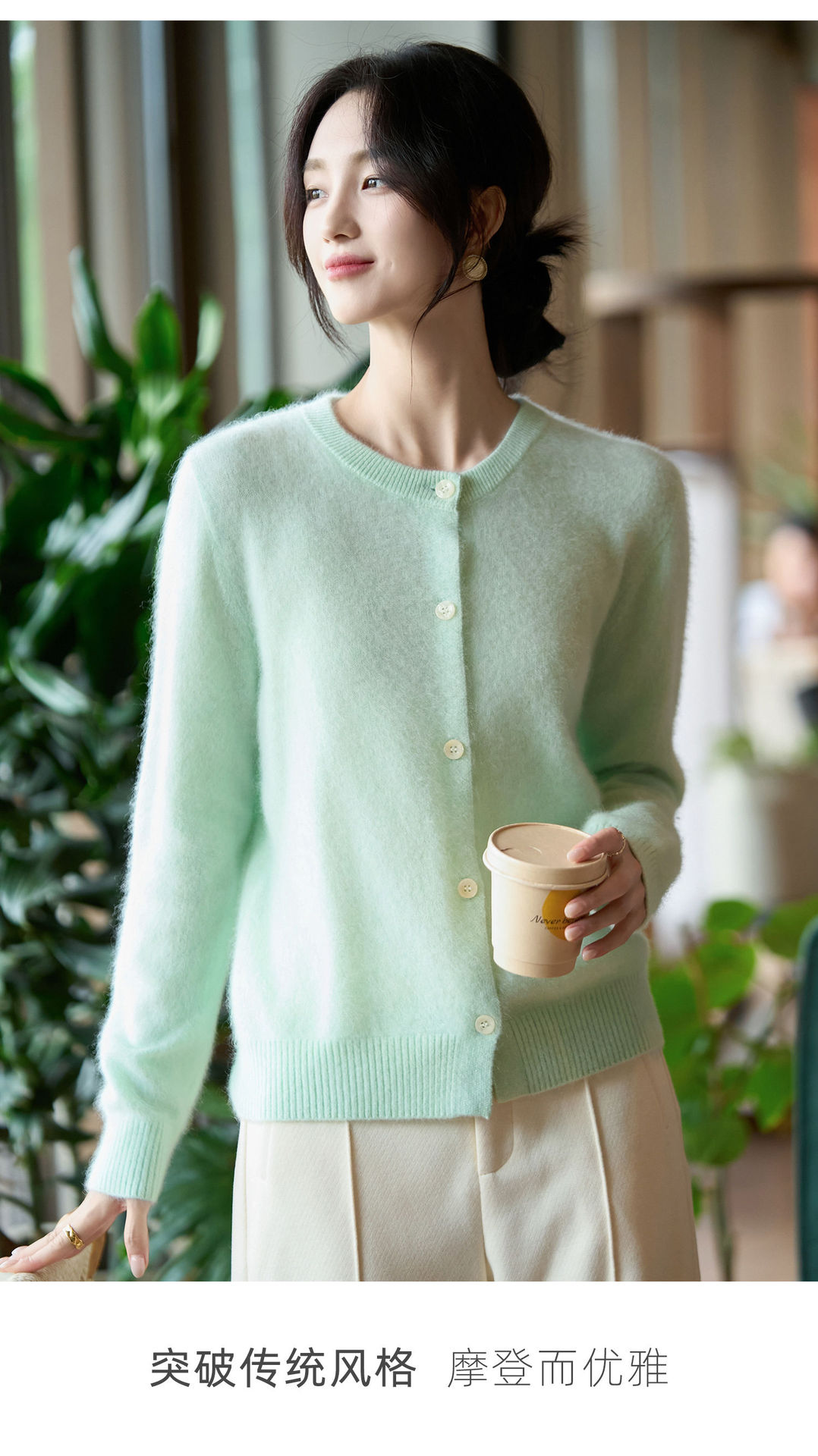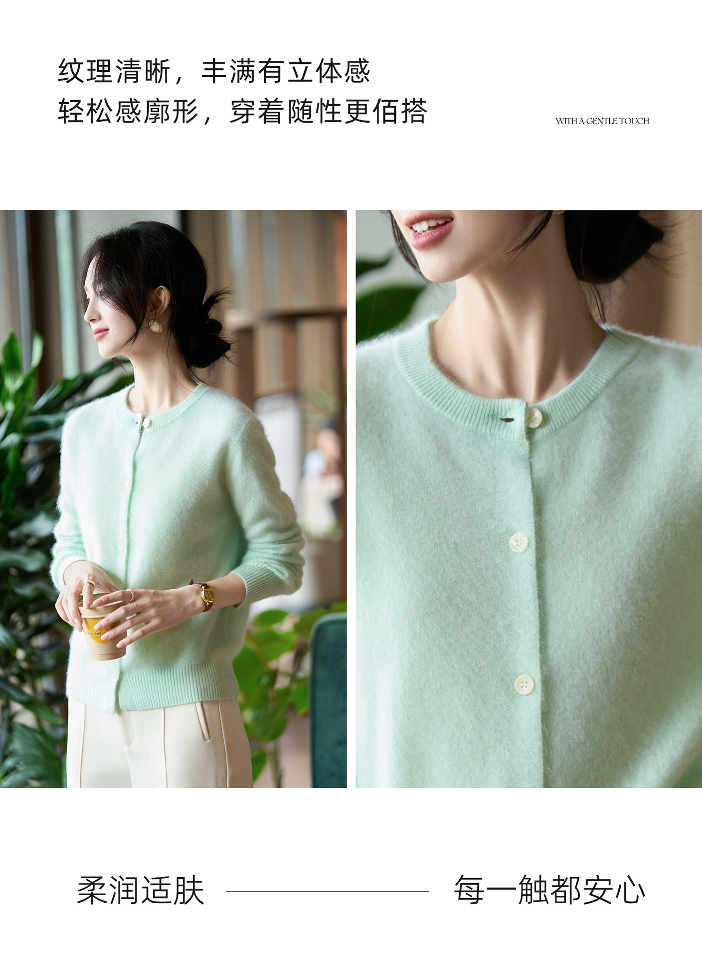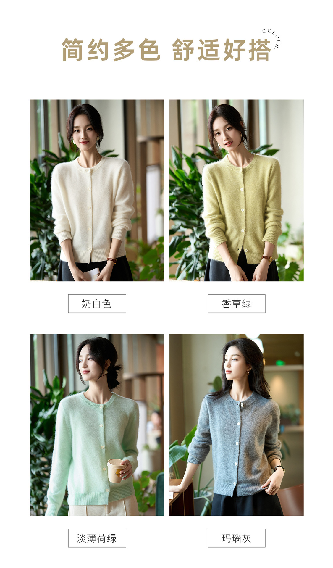 丁摩 100%纯羊毛针织开衫女圆领纯色毛衣外套NS-5178