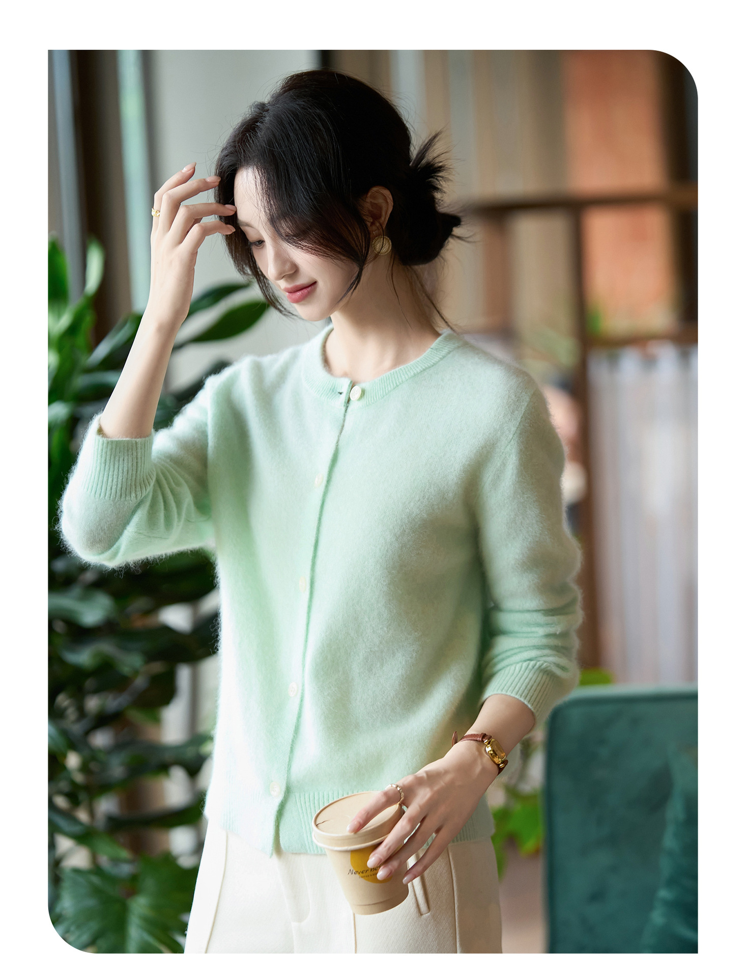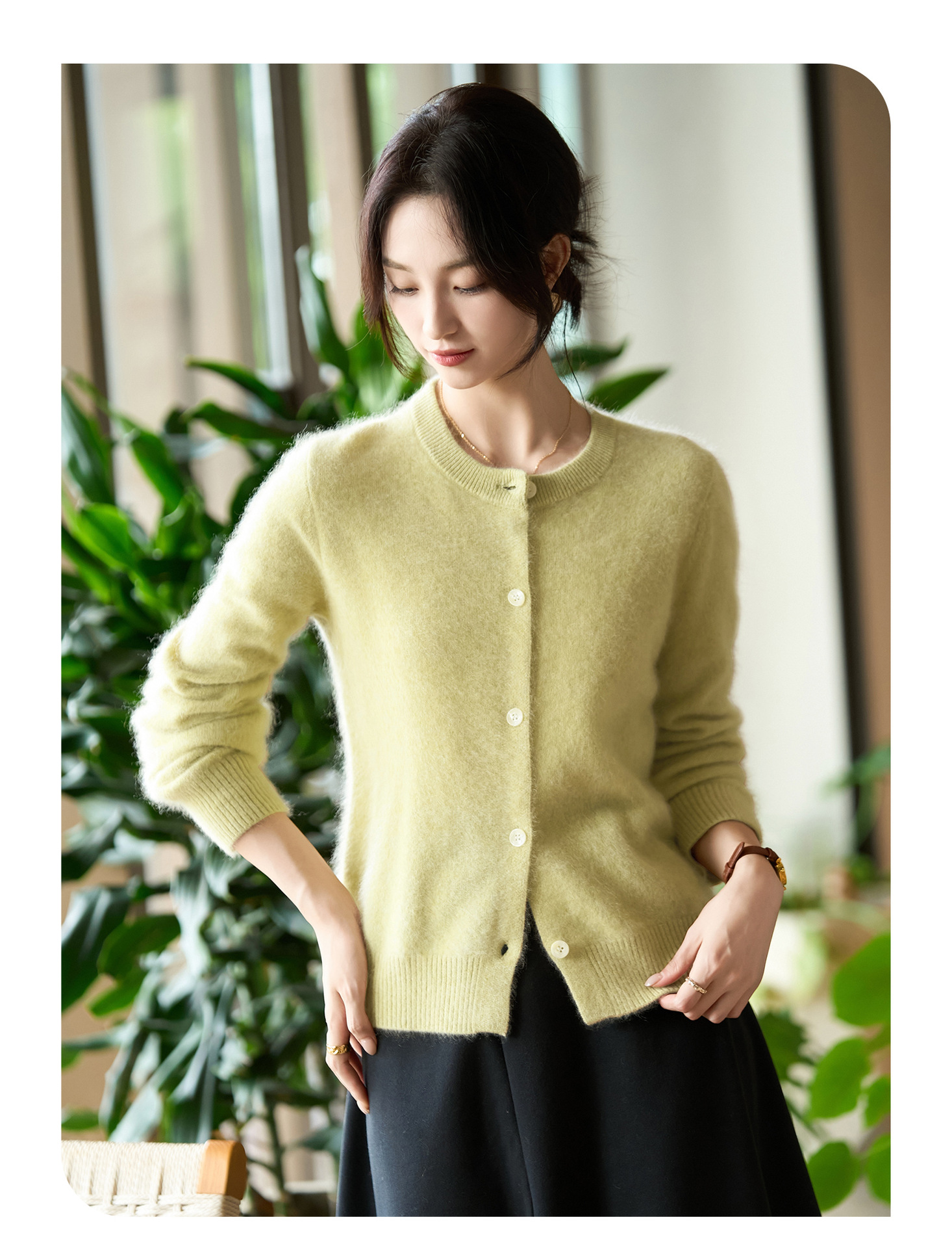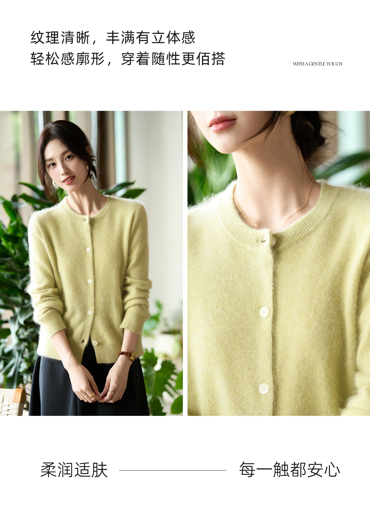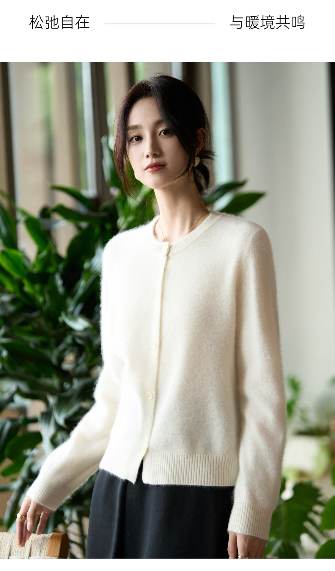 丁摩 100%纯羊毛针织开衫女圆领纯色毛衣外套NS-5178