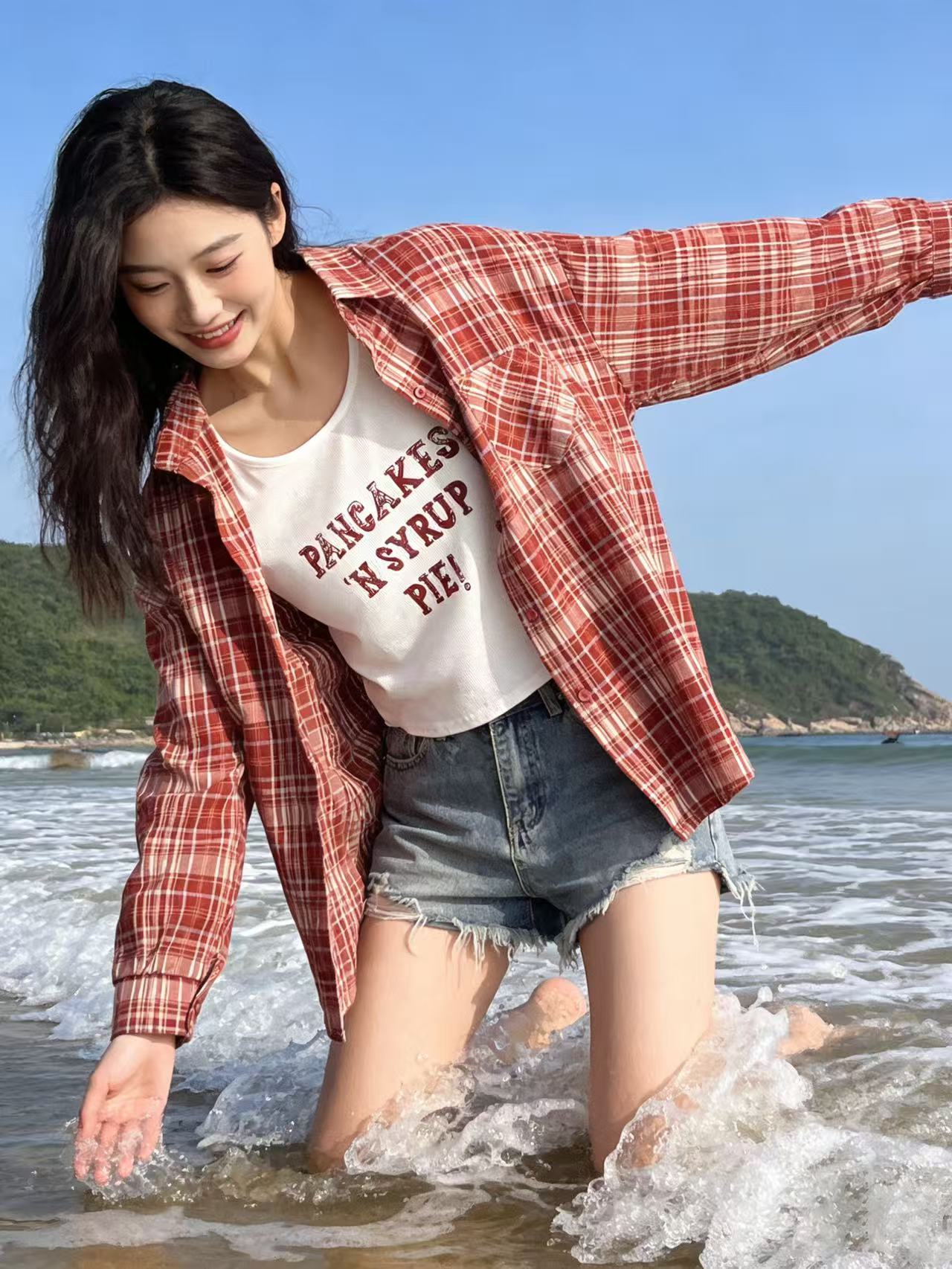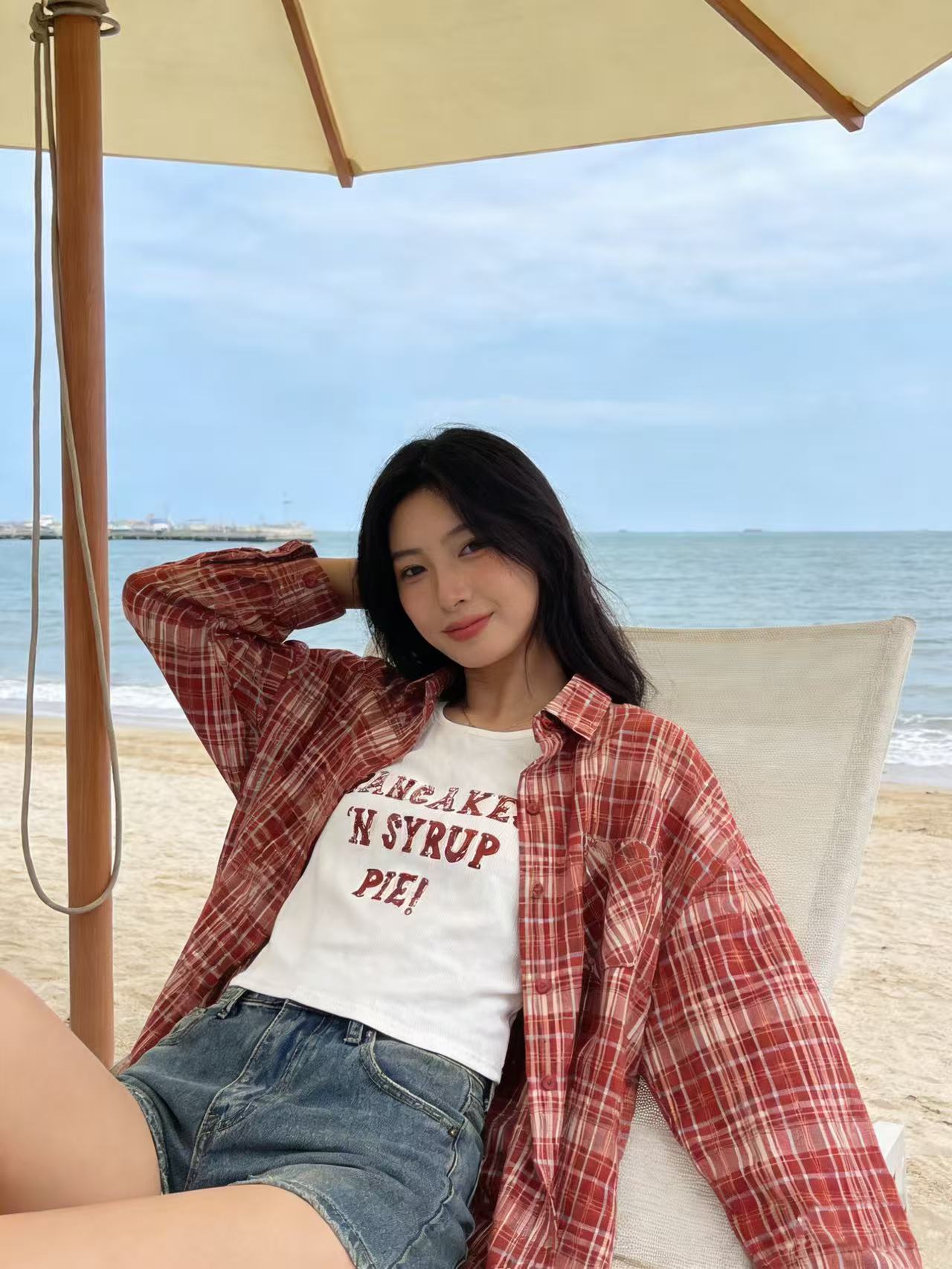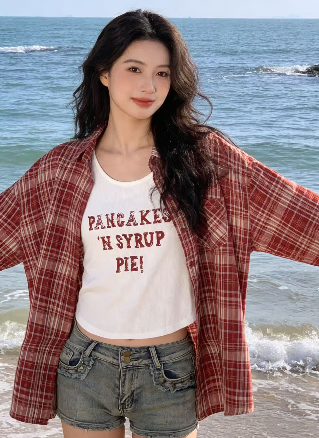 418良粉节|2026 活动爆款 品牌促【自营】衣周期 (两件套)春夏薄款~90%棉7396红格衬衫➕背心套装上衣-喜出