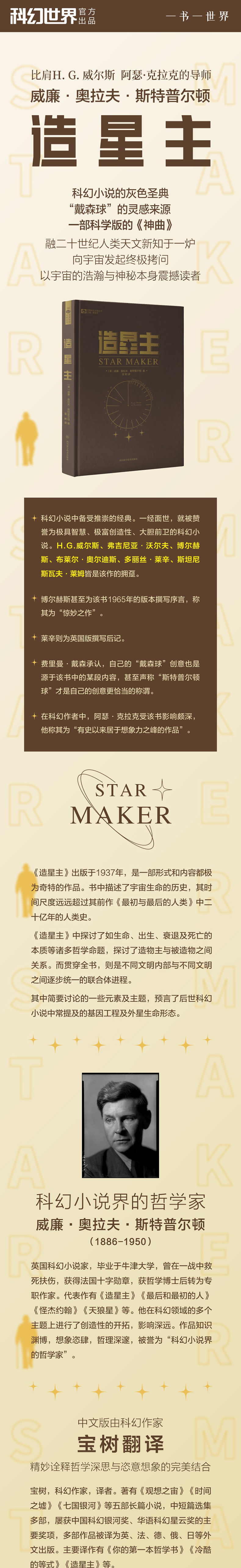 《造星主》出版于1937年,是一部形式和内容都极为奇特的作品。书中描述了宇宙生命的历史,其时间尺度远远超过其前作《*初与*后的人类》中二十亿年的人类史。《造星主》中探讨了如生命、出生、衰退及死亡的本质等诸多哲学命题,探讨了造物主与被造物之间关系。而贯穿全书,则是不同文明内部与不同文明之间逐步统一的联合体进程。其中简要讨论的一些元素及主题,预言了后世科幻小说中常提及的基因工程及外星生命形态。