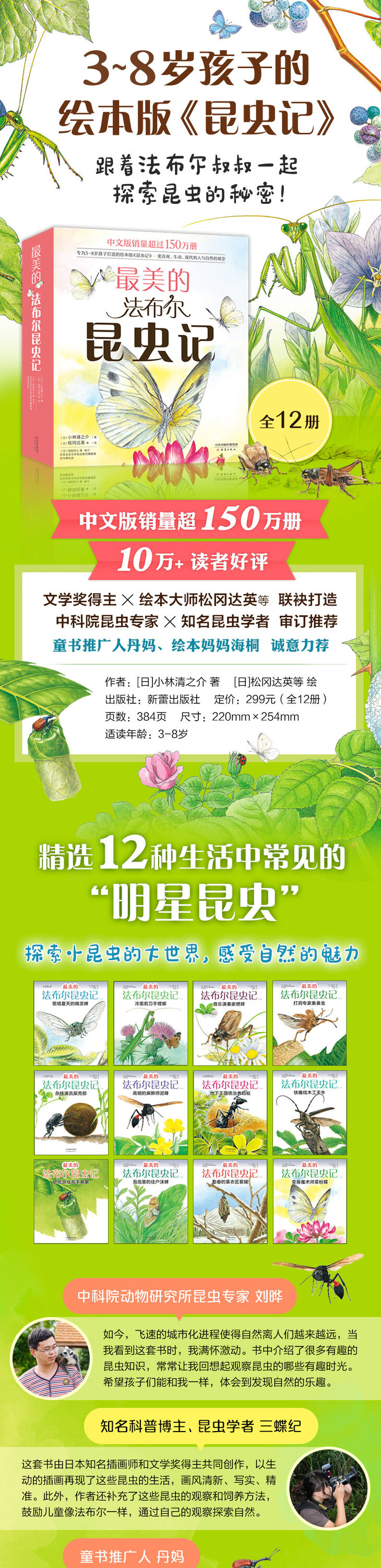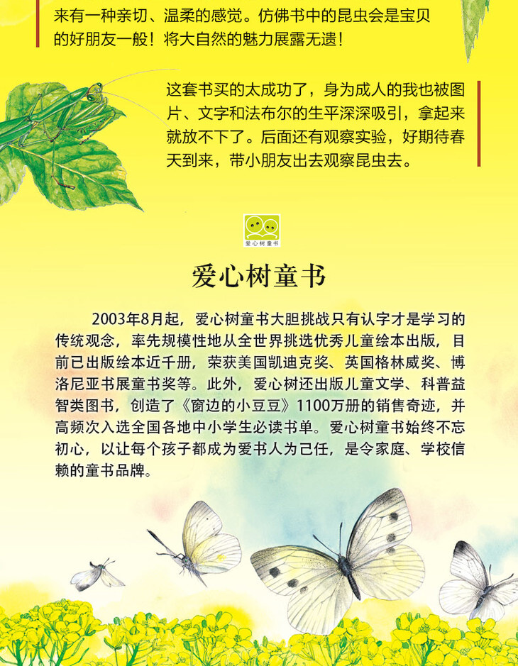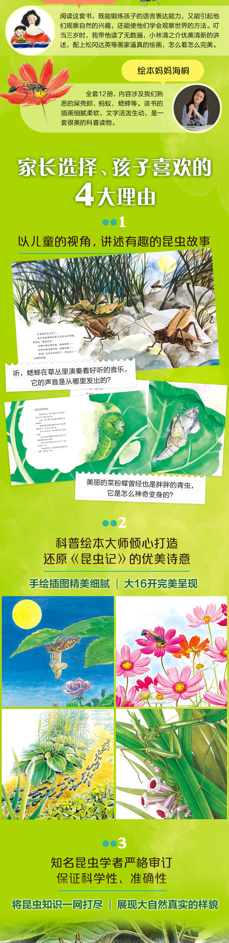 阅读《ZUI美的法布尔昆虫记》这套书,既能锻炼孩子的语言表达能力,又能引起他们观察自然的兴趣,还能使他们学会观察世界的方法。叮当3岁时,这套书我带他读了无数遍,日本文学大师小林清之介优美清新的讲述,配上松冈达英等生态画家逼真的绘画,怎么看怎么WAN美。——童书推广人 丹妈