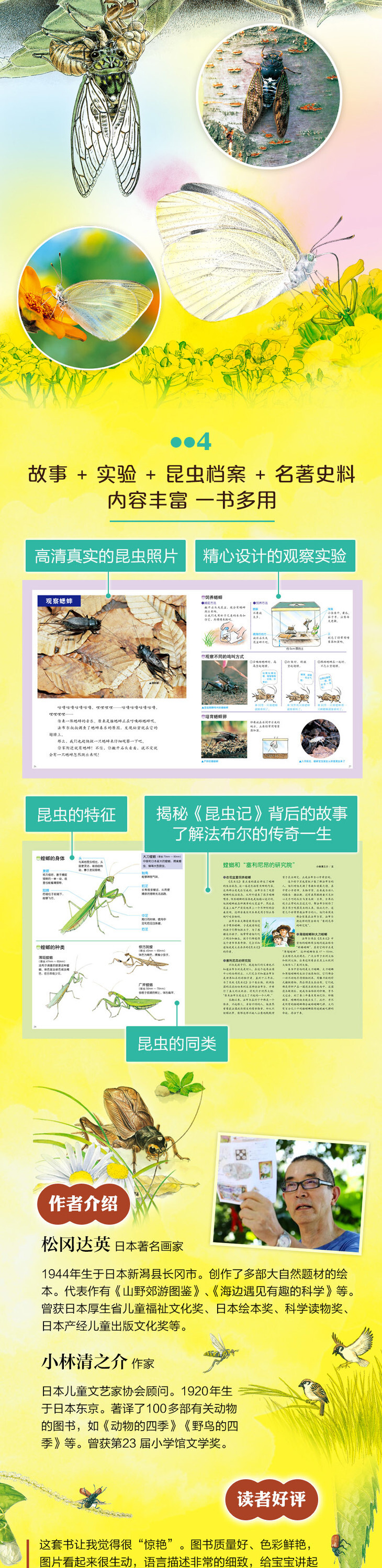 小林清之介文笔优美清新,保留了昆虫记中的知识点,而用亲切的语言讲述,更加适合孩子阅读。绘画十分逼真,活灵活现,色彩艳丽,如同多姿多彩的大自然,翻阅起来,有亲临大自然的美感。而为了让读者了解真实的昆虫,画家还用心地为读者绘制了与现实中一般大小的虫子。 ——《中国科学报》