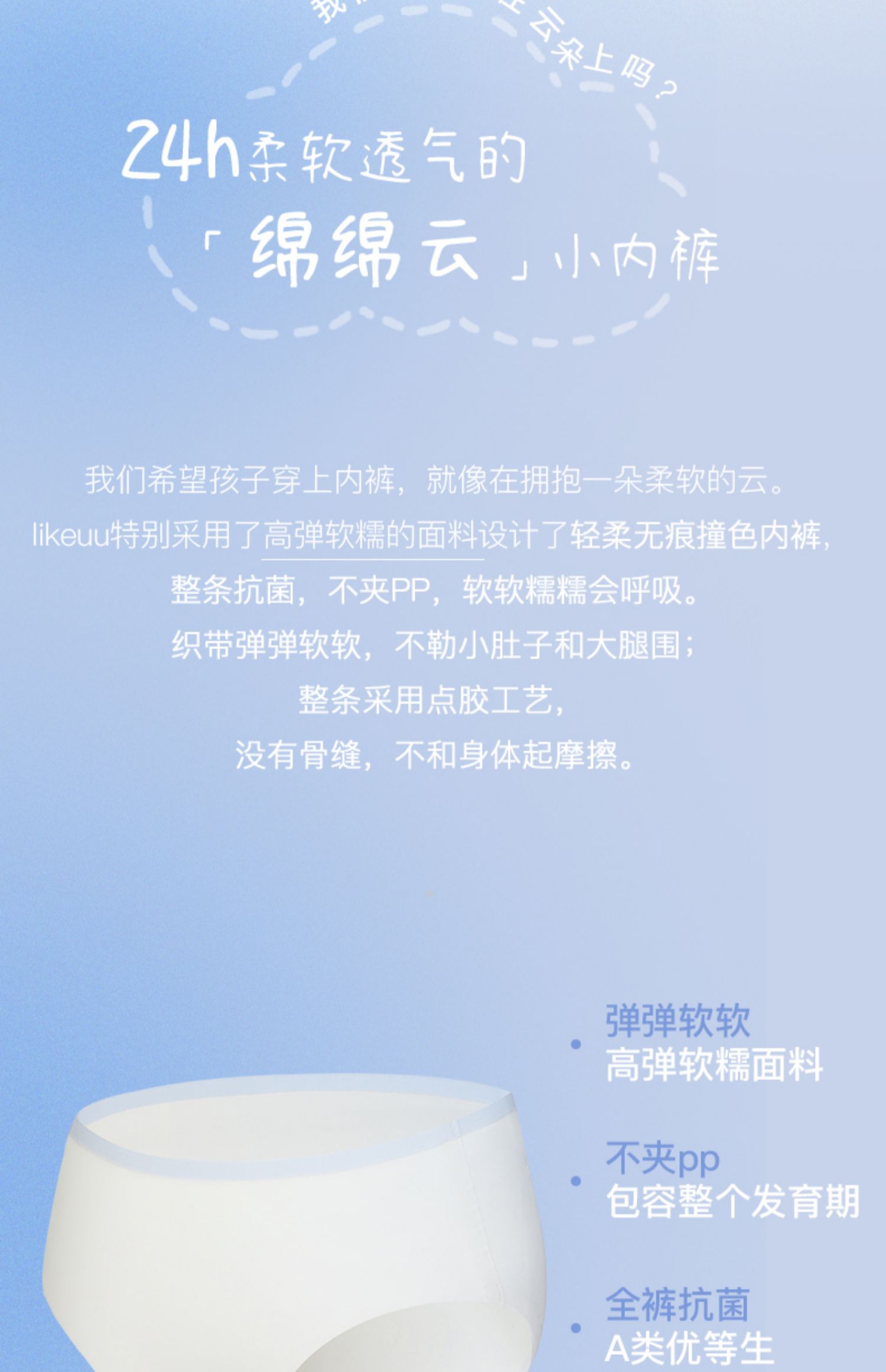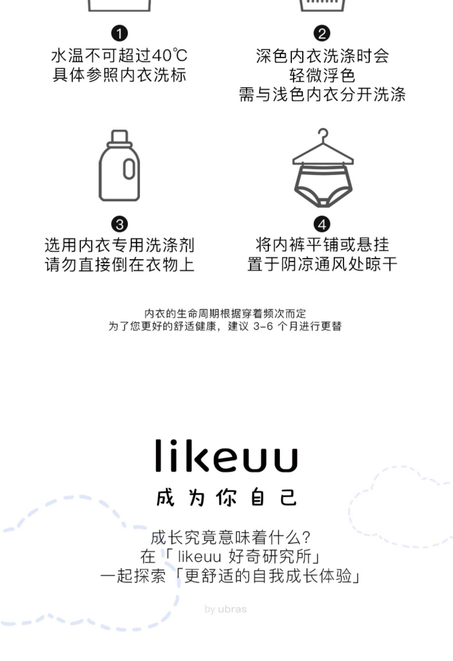 - likeuu是专注于为6~15岁的青少年创造柔软、无束缚的成长体验,以好奇心为灵感的成长发育期贴身衣物品牌。likeuu的产品覆盖内衣、内裤、保暖衣、家居服、运动等品类。