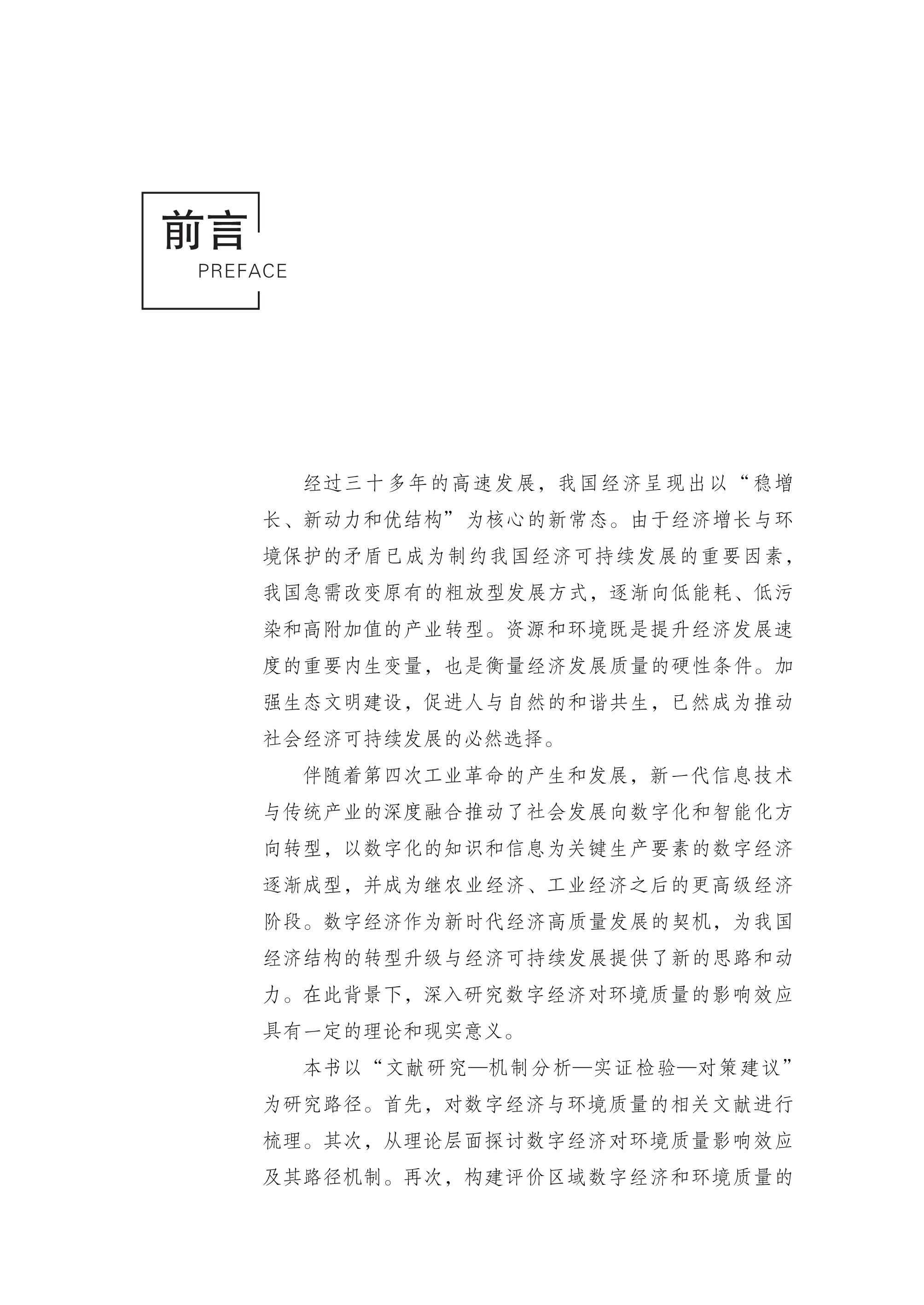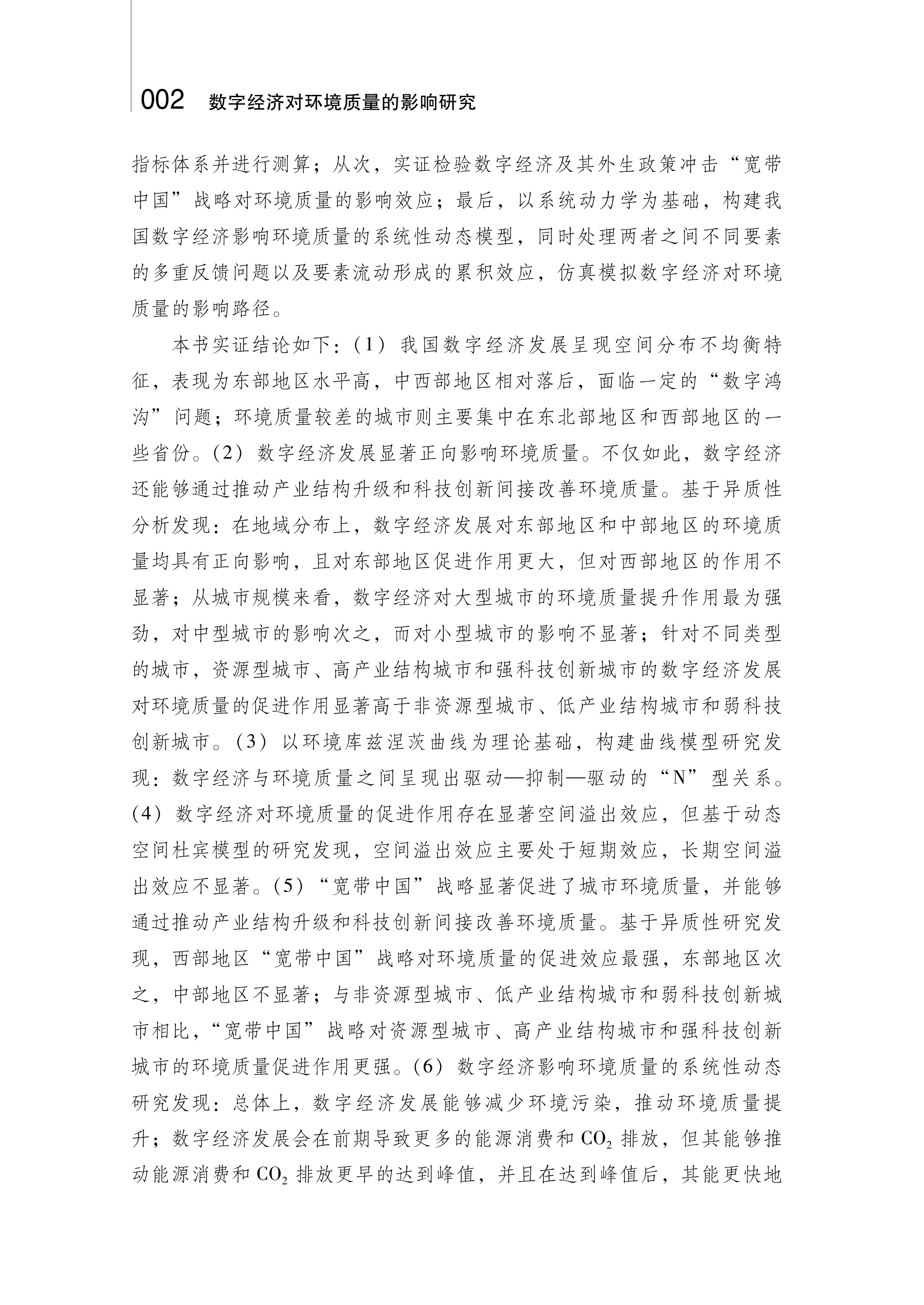 本书以“文献研究一机制分析一实证检验一对策建议”为研究路径。首先,对数字经济与环境质量的相关文献进行梳理。其次,从理论层面探讨数字经济对环境质量影响效应及其路径机制。再次,构建评价城市数字经济和环境质量的指标体系并进行测算。从次,实证检验数字经济及其外生政策冲击“宽带中国”战略对环境质量的影响效应。最后,以系统动力学为基础,构建我国数字经济影响环境质量的系统性动态模型,同时处理两者之间不同要素的多重反馈问题以及要素流动形成的累积效应,仿真模拟数字经济对环境质量的影响路径。