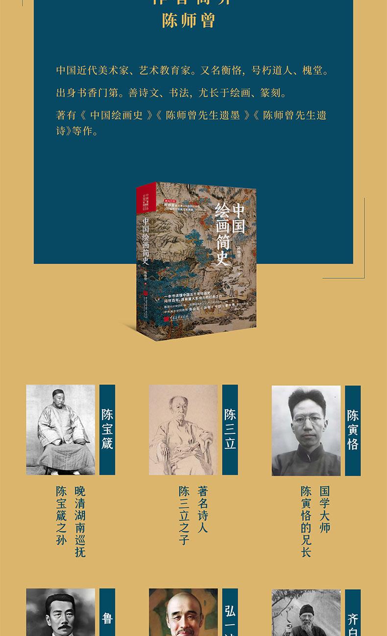 本书为陈师曾在艺校讲授中国绘画史的授课讲义编辑而成。全书共分三编:第一编上古史,分六章,叙述三代至隋的绘画;第二编中古史,分四章,叙述唐至元的绘画;第三编近世史,分两章,叙述明清两代绘画。全书约4万字,梳理历代画史脉络、技法沿革、题材变迁以及重要的画派、画家等,内容提纲挈领,文字简明扼要,是一本极好的美术史普及读物。本书还附有他还撰写的数篇有关画史的专题论文。