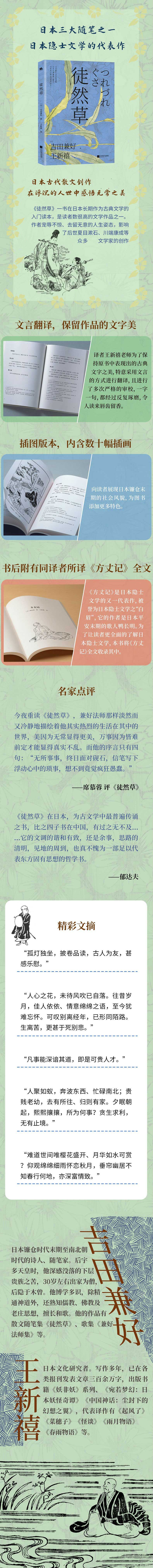 1.《徒然草》是日本隐士文学的滥觞。它与《枕草子》合称日本随笔双壁,也与《枕草子》《方丈记》合称日本随笔三壁,是日本文学史上影响很高的随笔之一。 2.这本书代表了日本近古代散文创作很高的成就,在日本文学史上有重要地位,夏目漱石、川端康成等日本文学家的创作,都深受《徒然草》影响。 3.全文经过精心修订,译者王新禧老师为了保持原书中表现出的古典文字之美,特意采用文言的方式进行翻译,且进行了多次严格的审校,一字一句,都经过反复琢磨,令人读来唇齿留香。 4.内有数十幅插画,向读者展现日本镰仓末期的社会风貌。 5.书后附有同译者所译《方丈记》([日]鸭长明 著)全文,这是日本隐士文学又一代表作,让读者更全面的了解日本隐士文学。