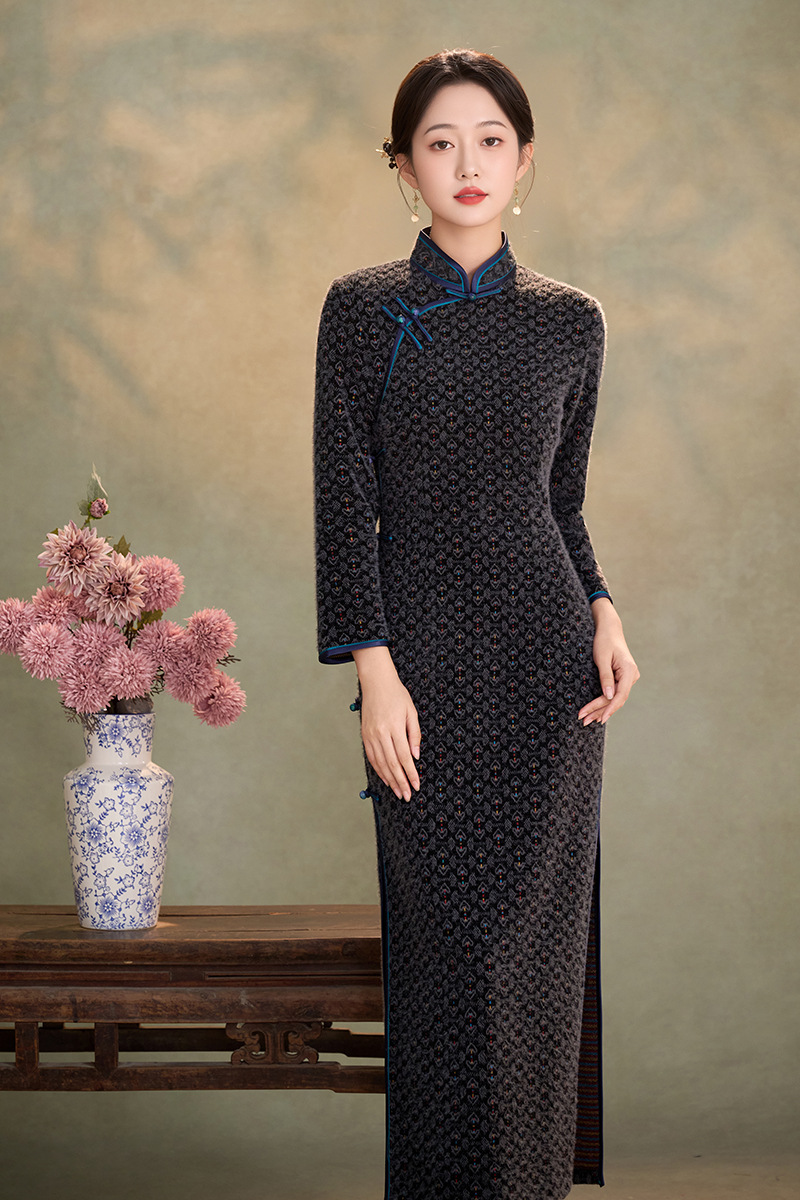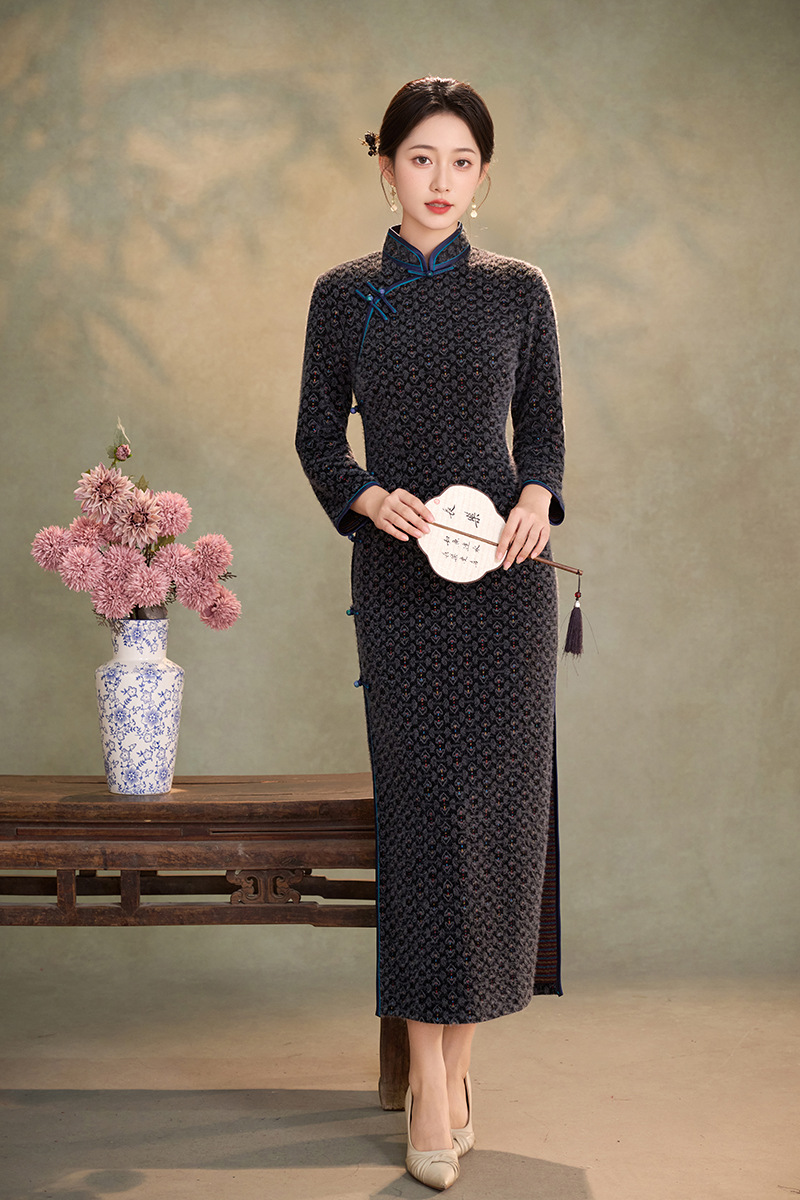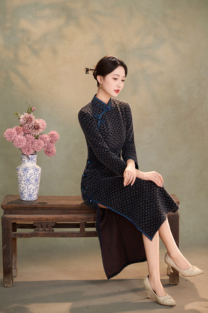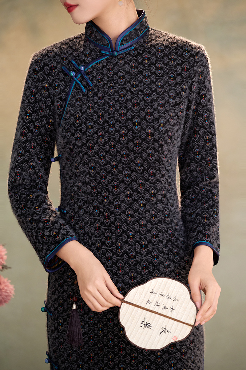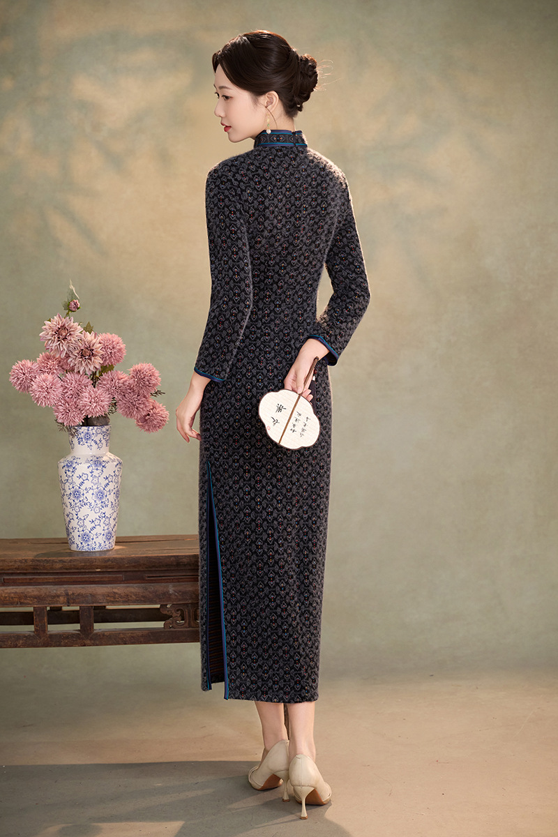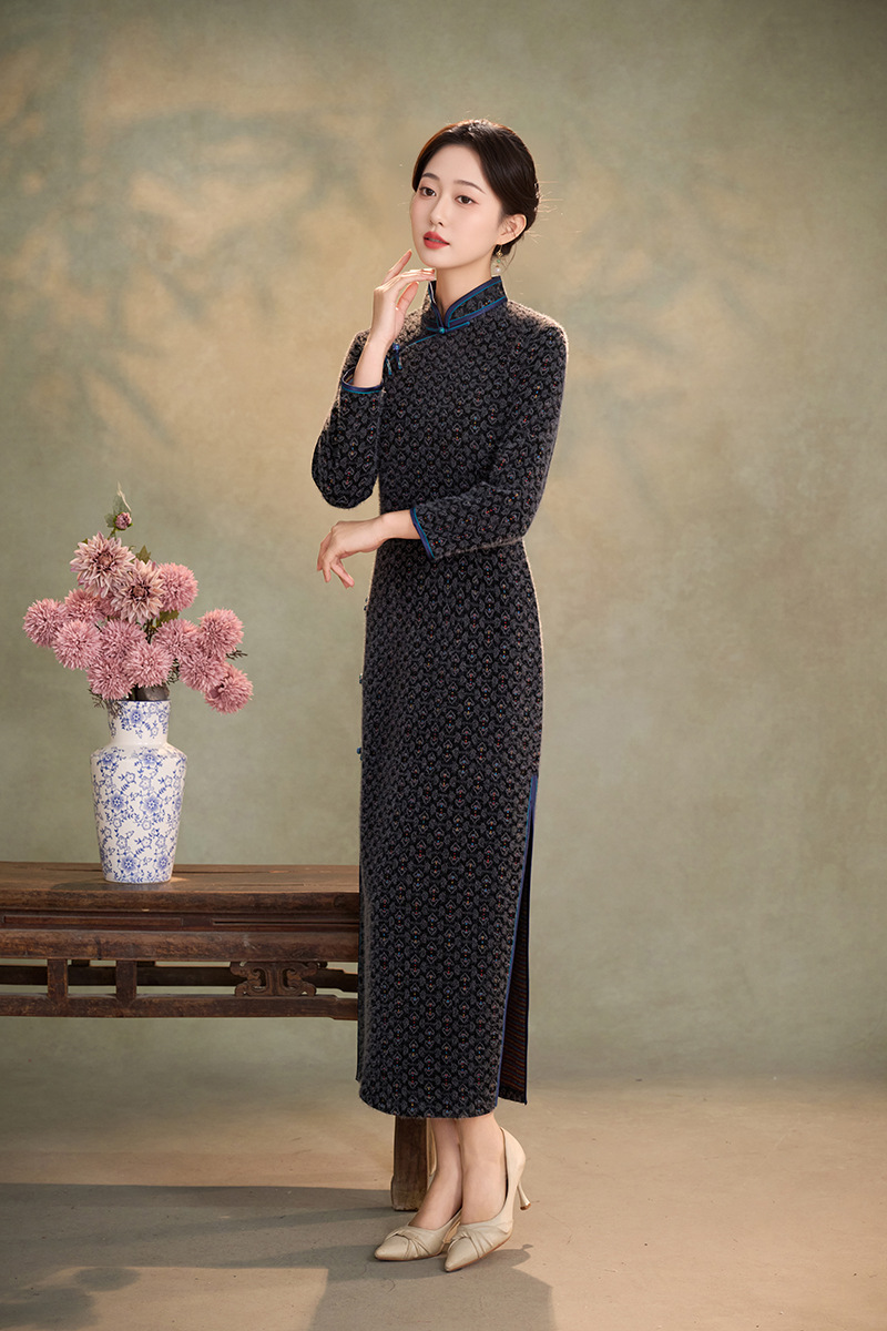 WC9593 新式旗袍2025秋冬款中国风优雅气质长款金貂绒加绒显瘦修身连衣裙