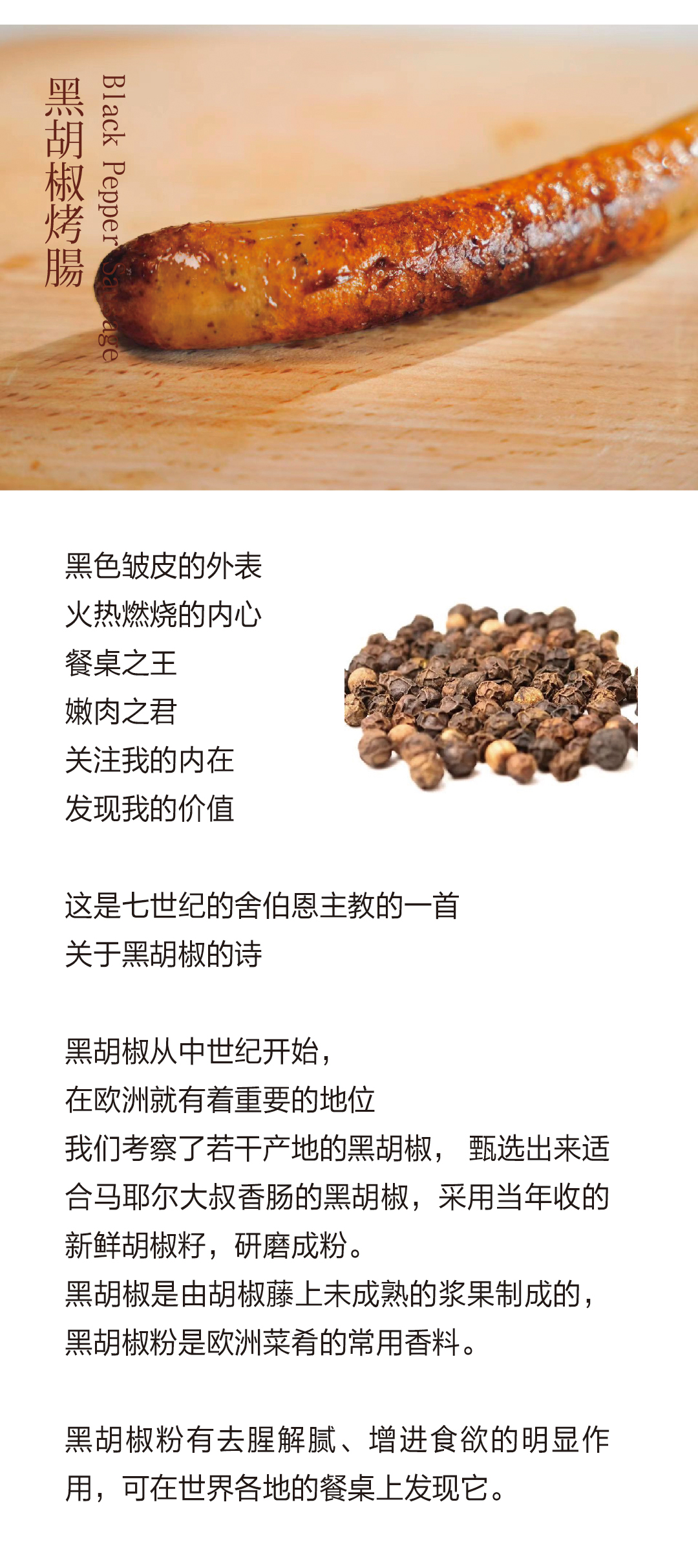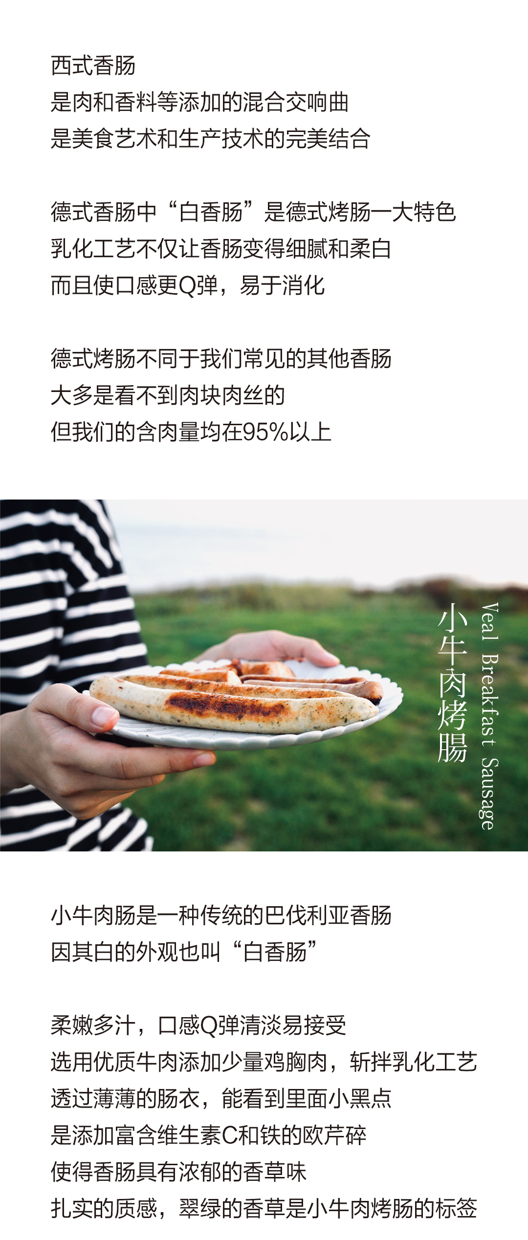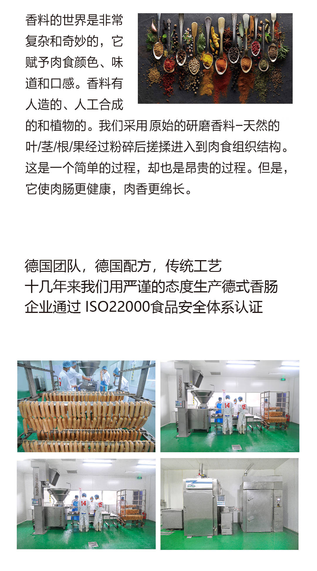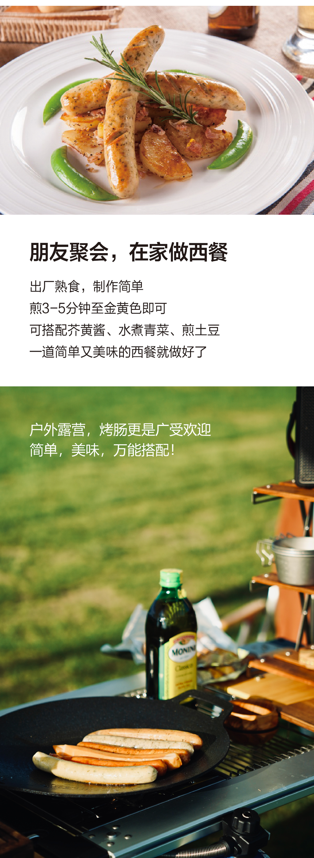 选用优质牛肉,斩拌乳化工艺,灌入天然羊肠衣内。添加富含维生素C和铁的欧芹碎,使得香肠具有浓郁的香草味,适宜烧烤或煎食,柔嫩多汁,风味别具一格。