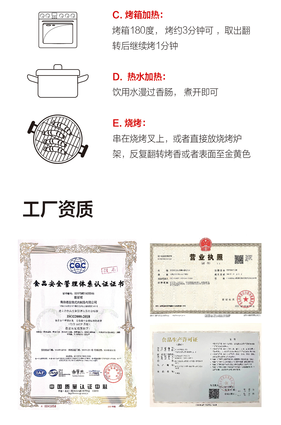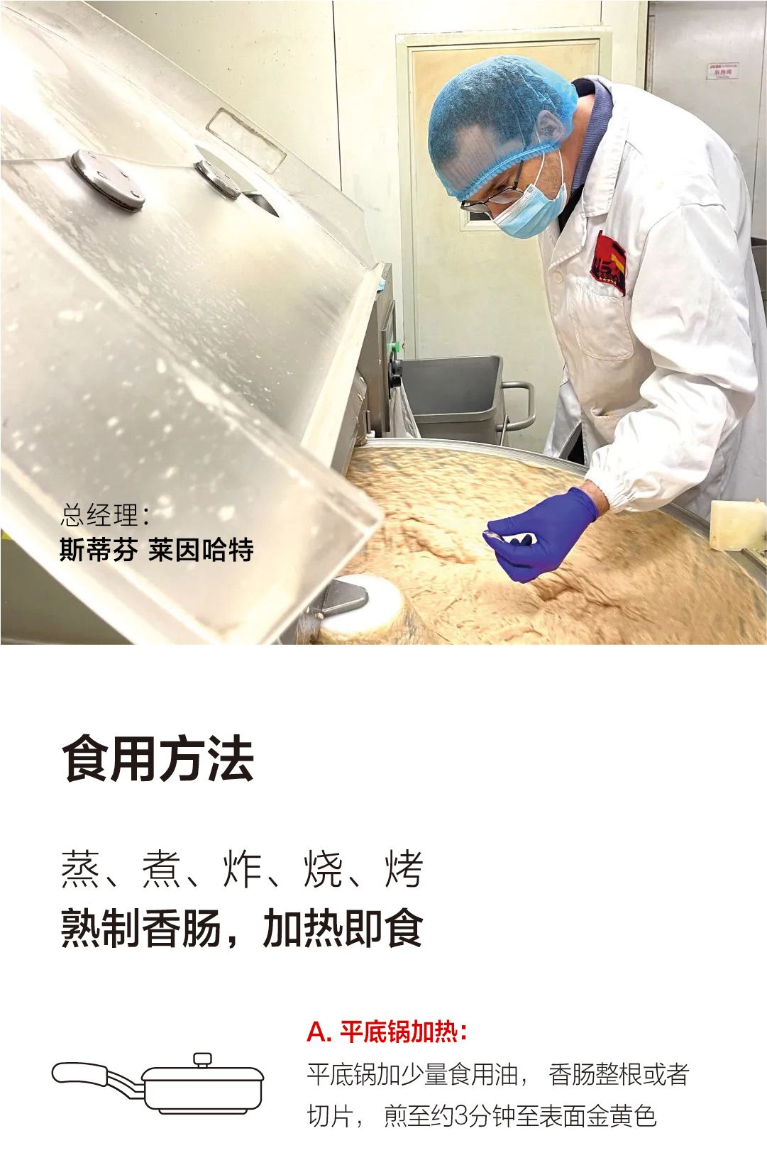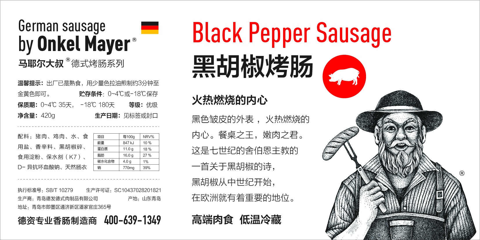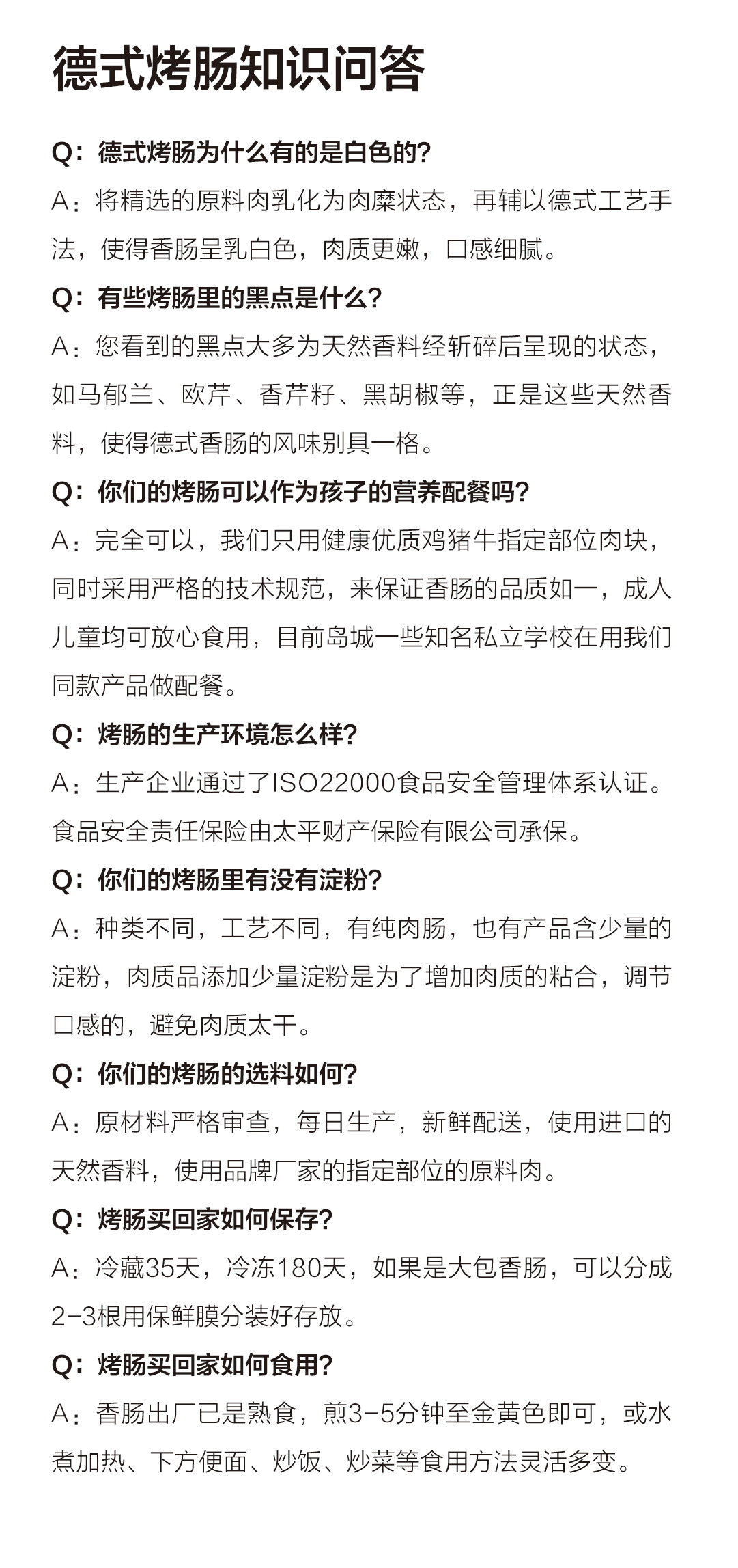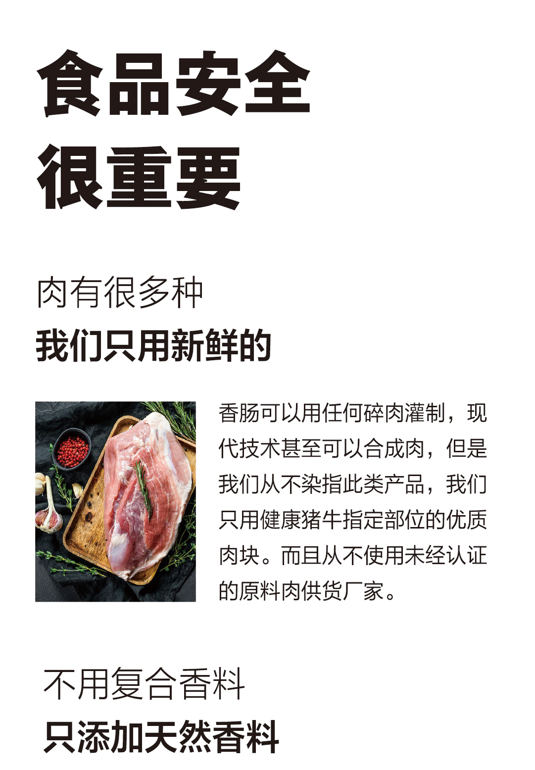 选用优质牛肉,斩拌乳化工艺,灌入天然羊肠衣内。添加富含维生素C和铁的欧芹碎,使得香肠具有浓郁的香草味,适宜烧烤或煎食,柔嫩多汁,风味别具一格。