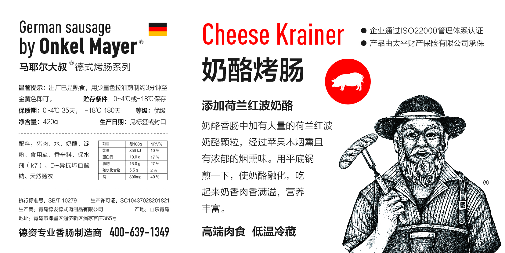 奶酪香肠中加有大量的荷兰红波奶酪颗粒,经过苹果木烟熏且有浓郁的烟熏味。用平底锅煎一下,使奶酪融化,吃起来奶香肉香满溢,营养丰富。