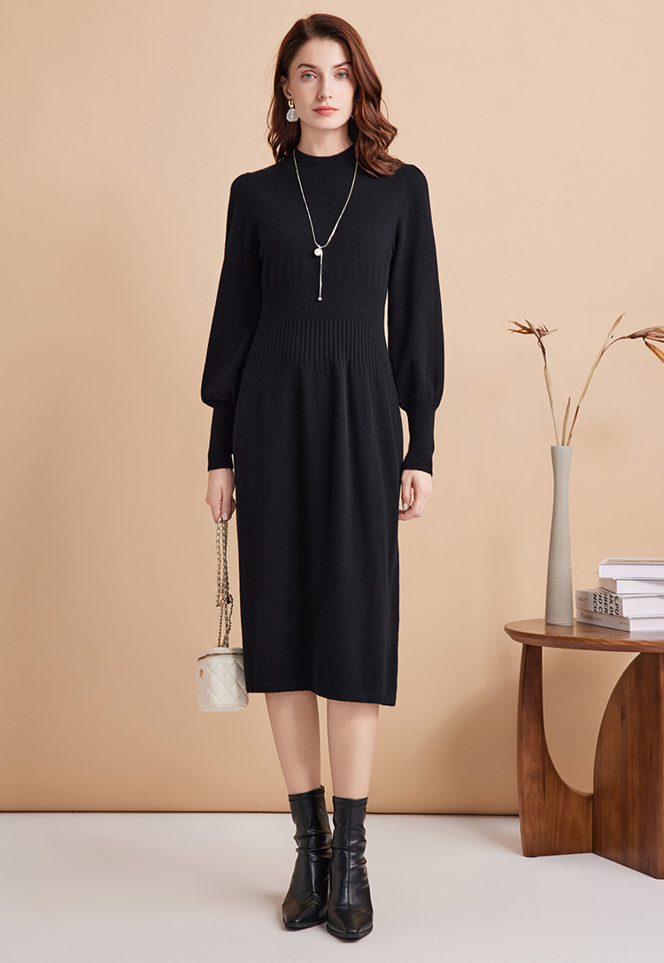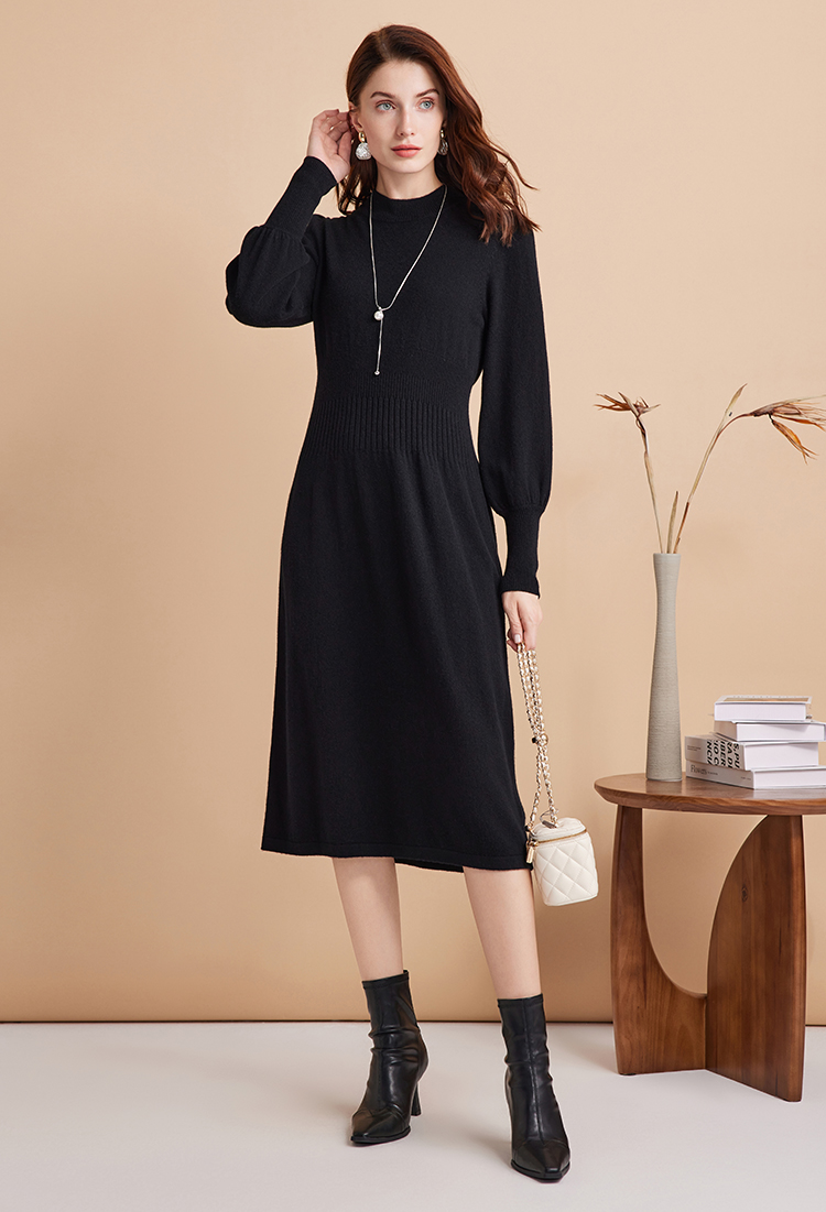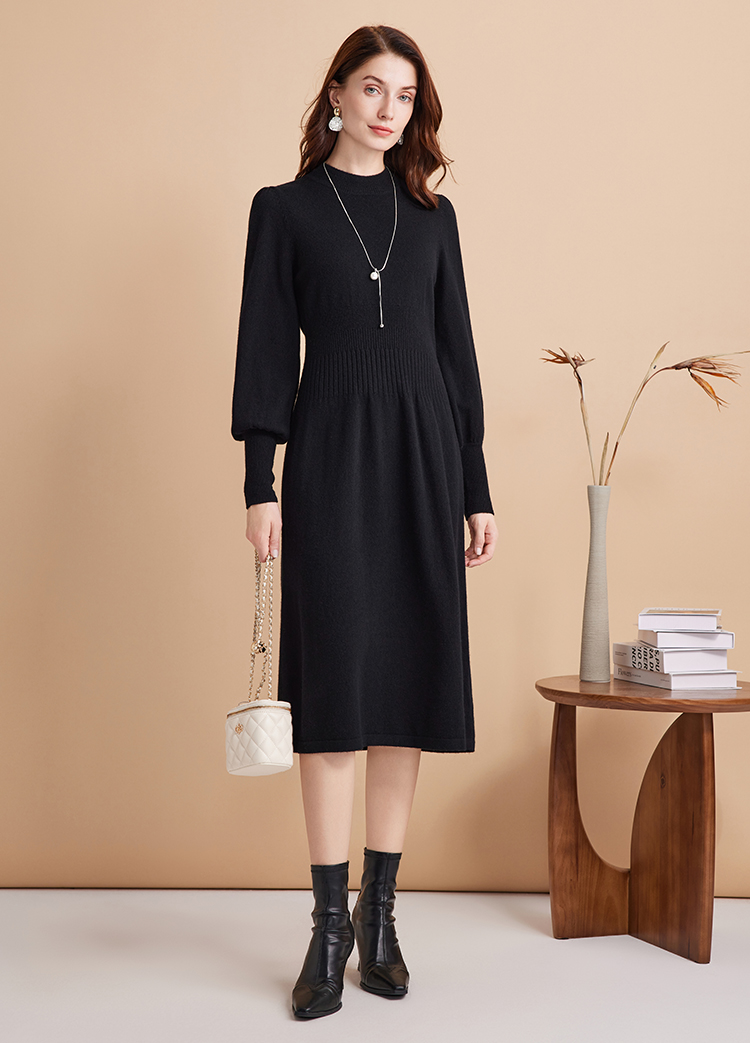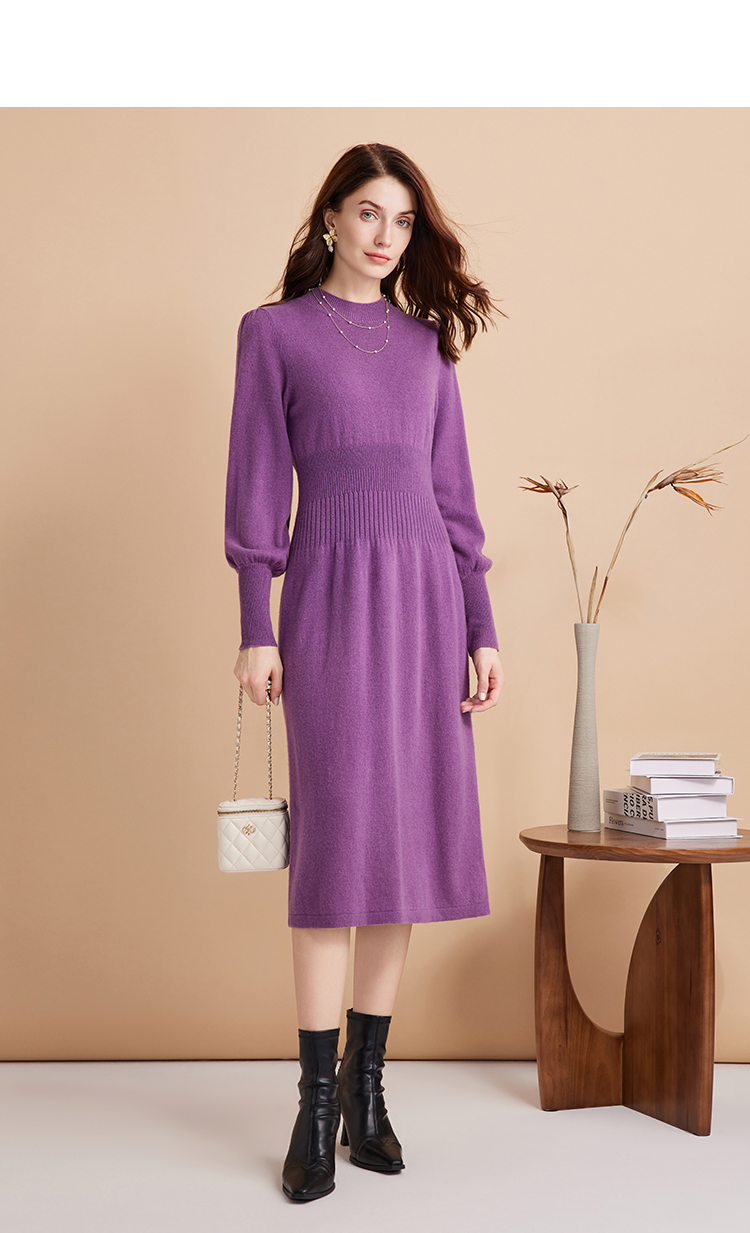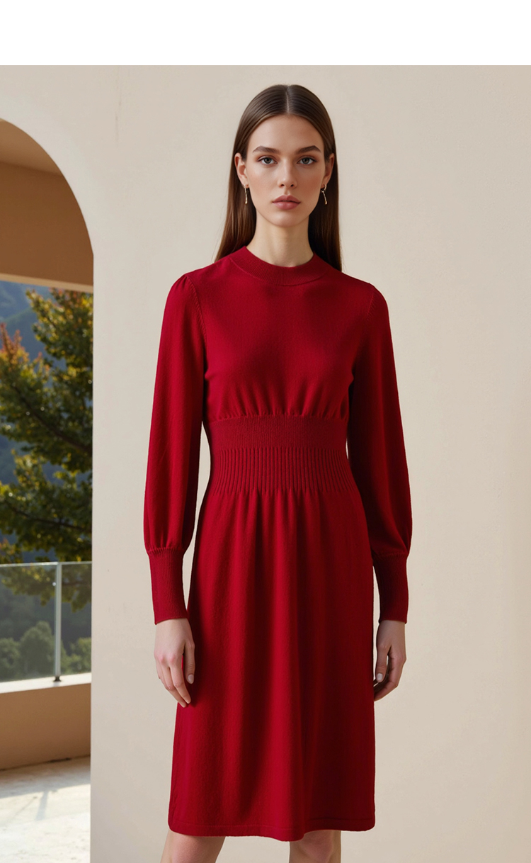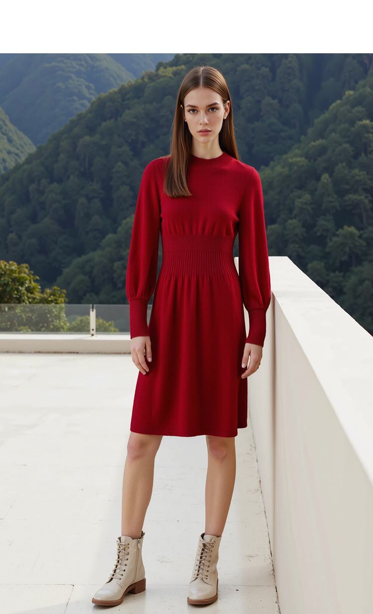 EITIE爱特爱冬季新款100%绵羊毛时尚气质收腰显瘦长袖针织连衣裙7601307