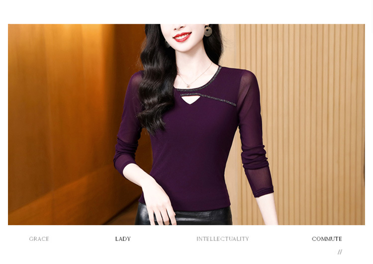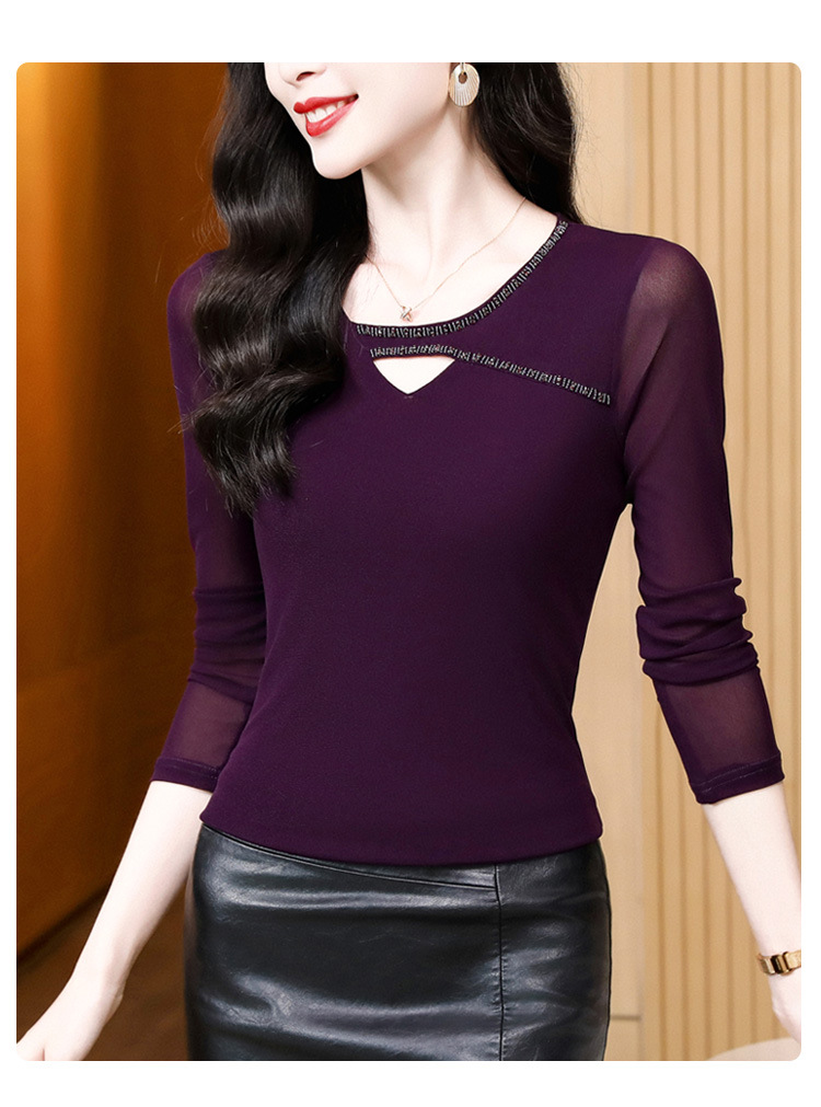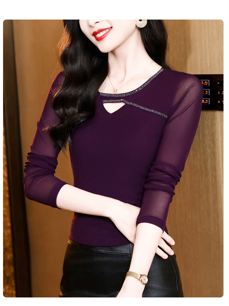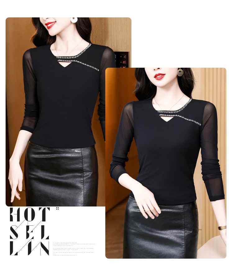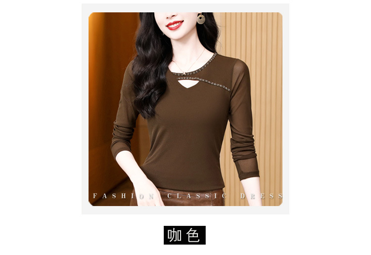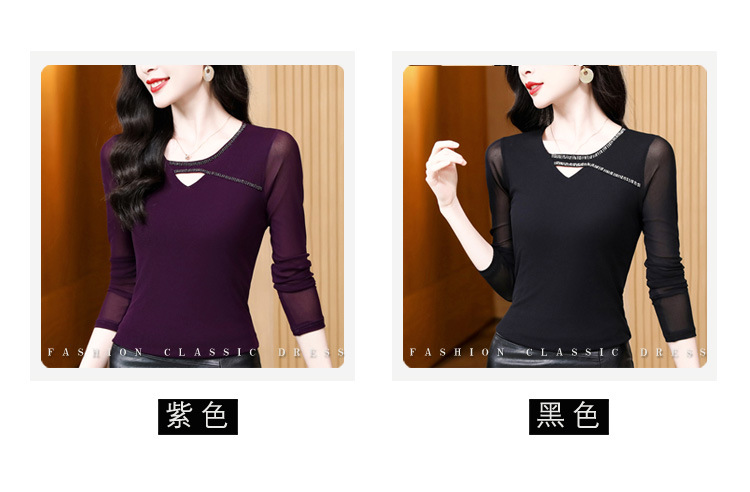 洋气百搭钉珠纯色长袖网纱打底衫,修身显瘦T恤K-E37M2839