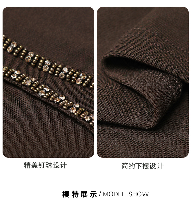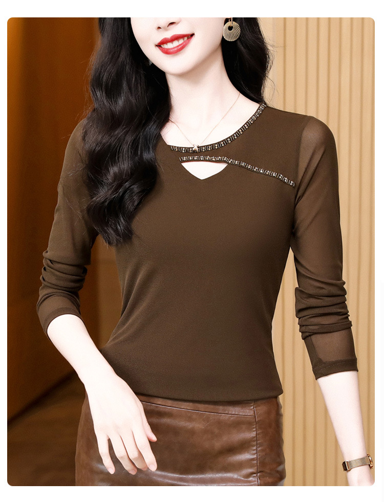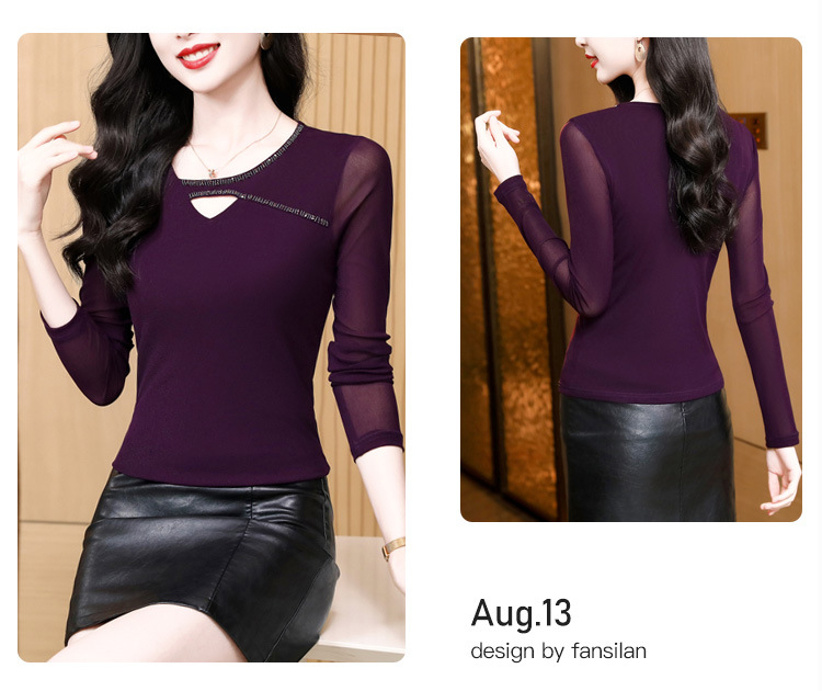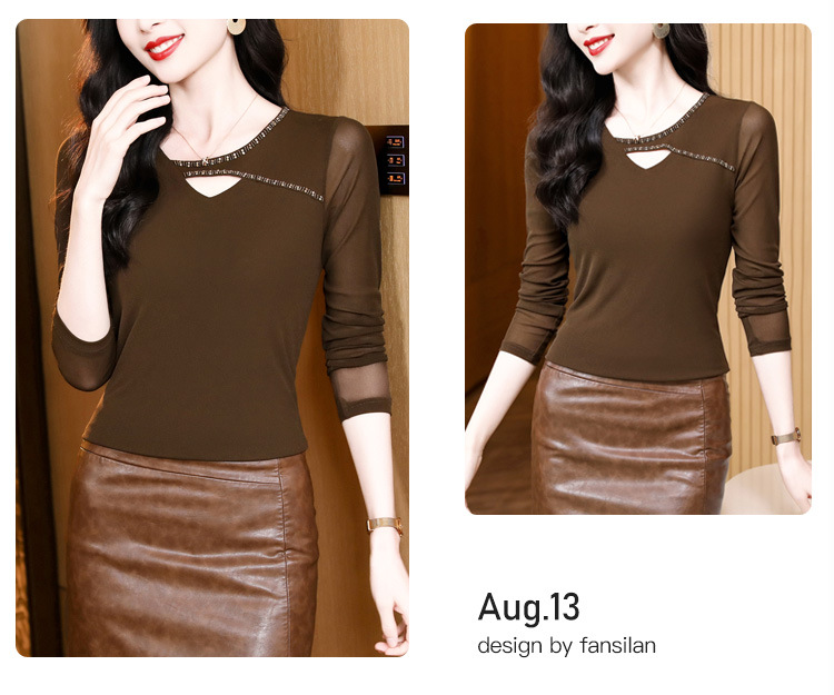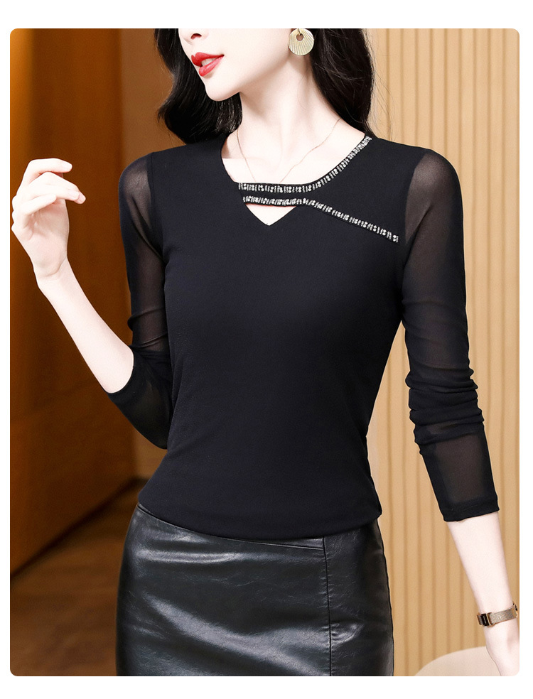 洋气百搭钉珠纯色长袖网纱打底衫,修身显瘦T恤K-E37M2839