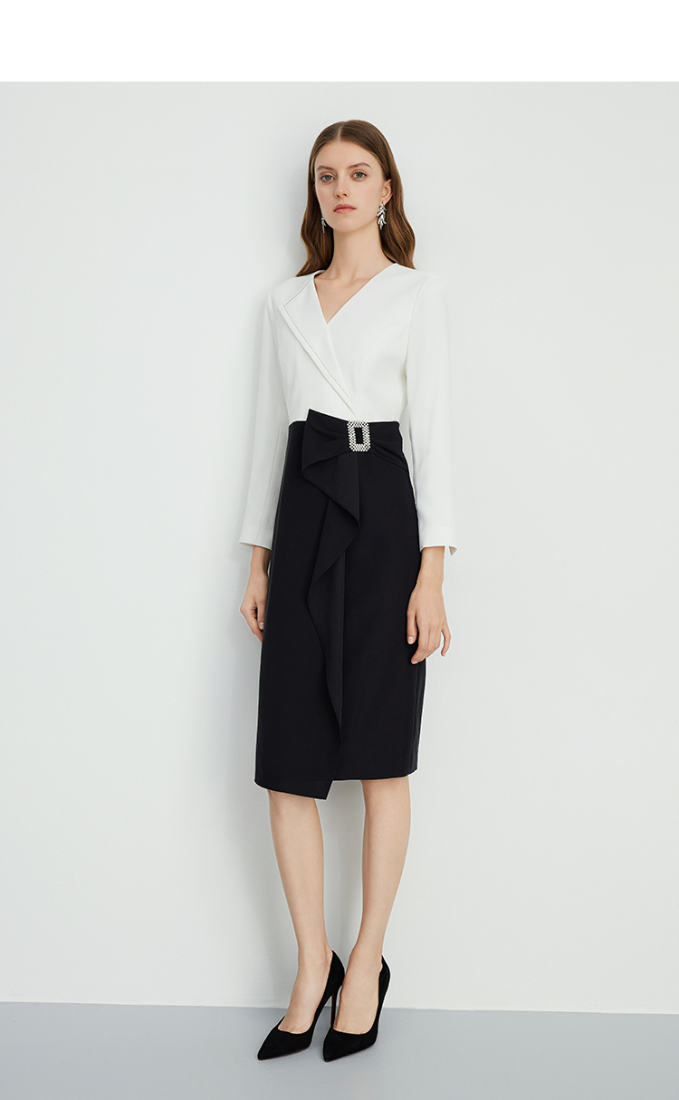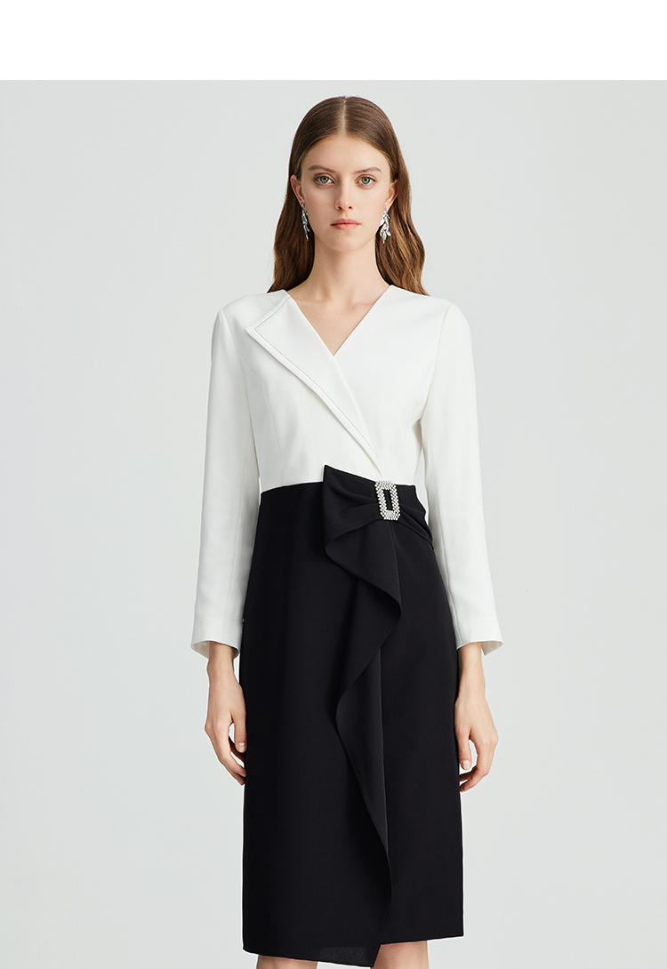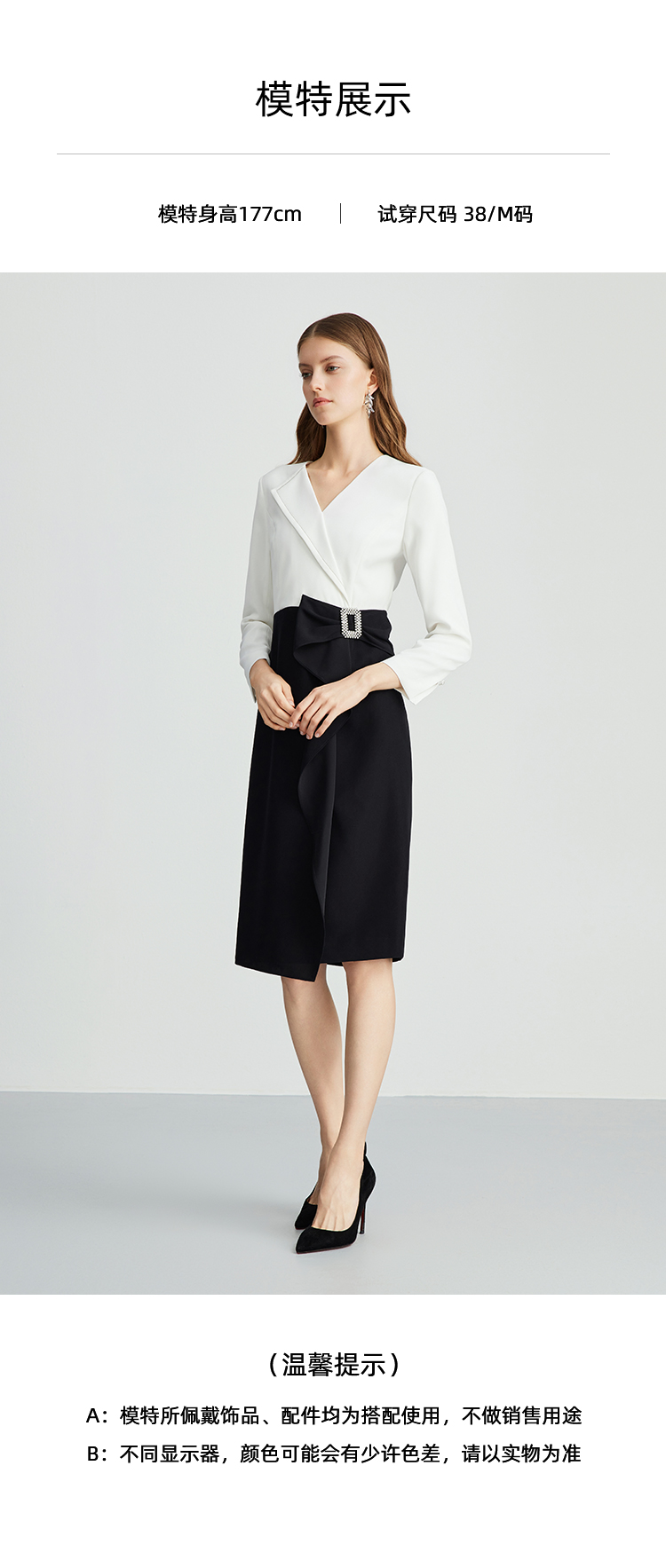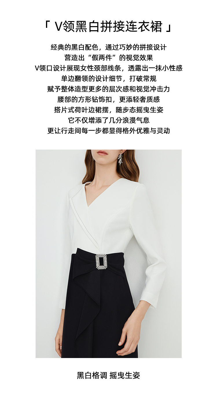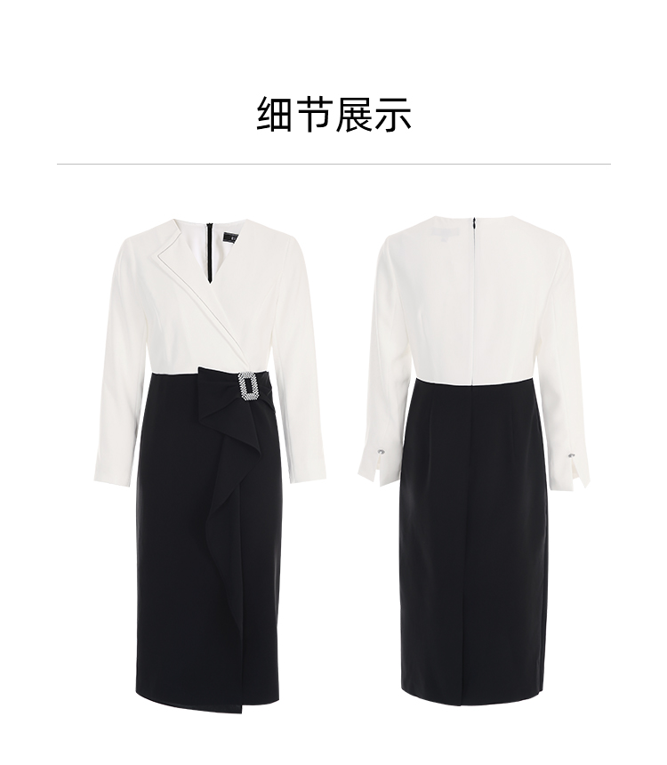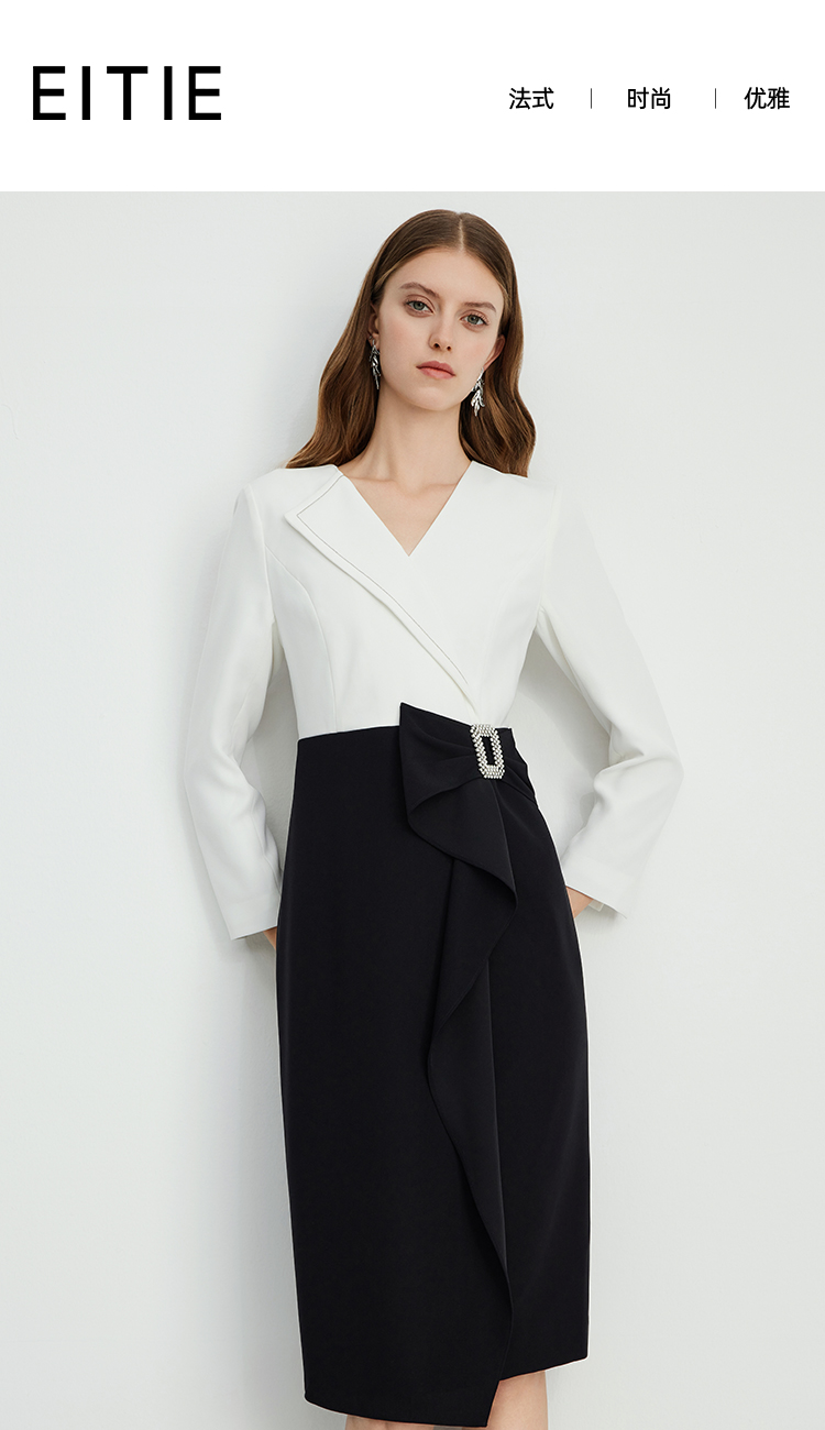 EITIE爱特爱不对称设计通勤撞色收腰包臀V领气质连衣裙秋新款C2407414