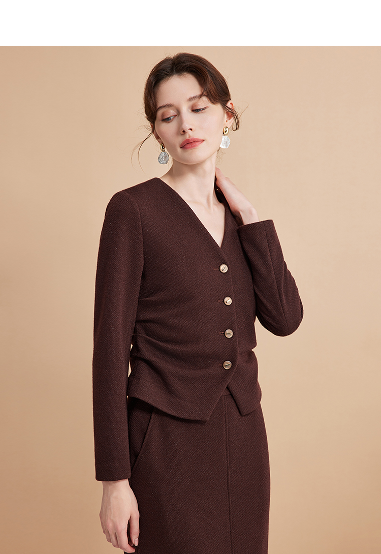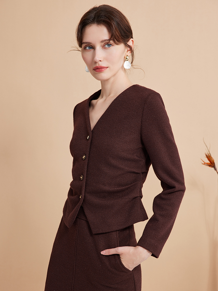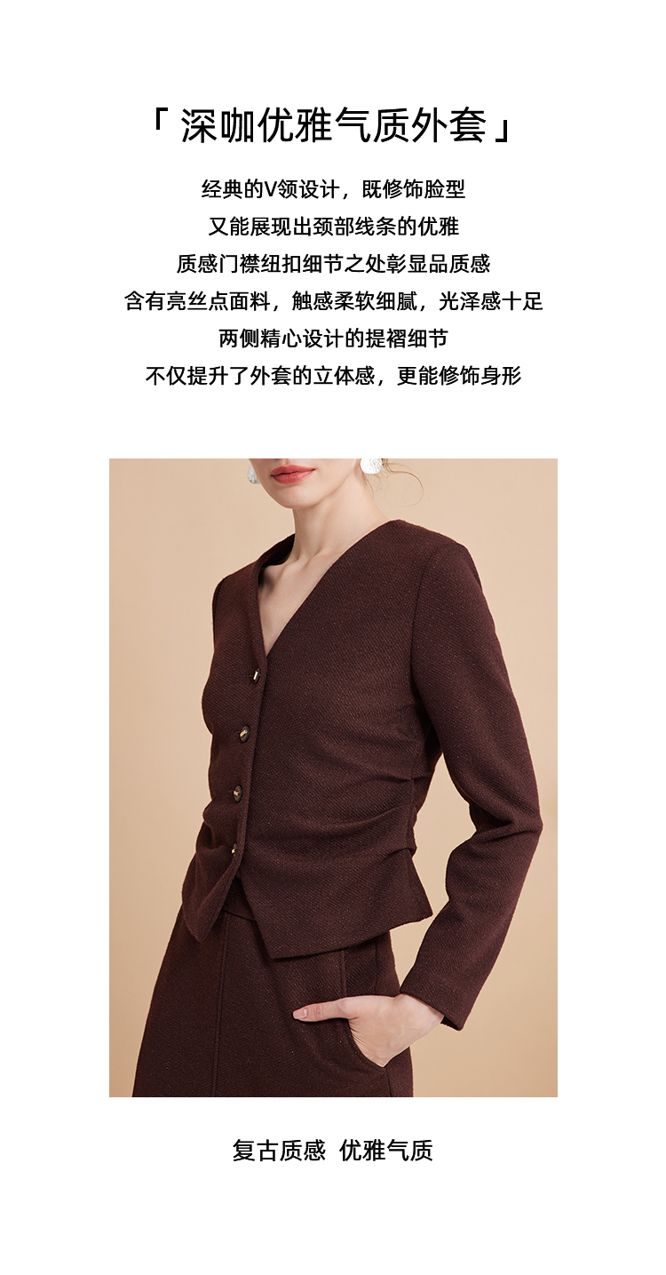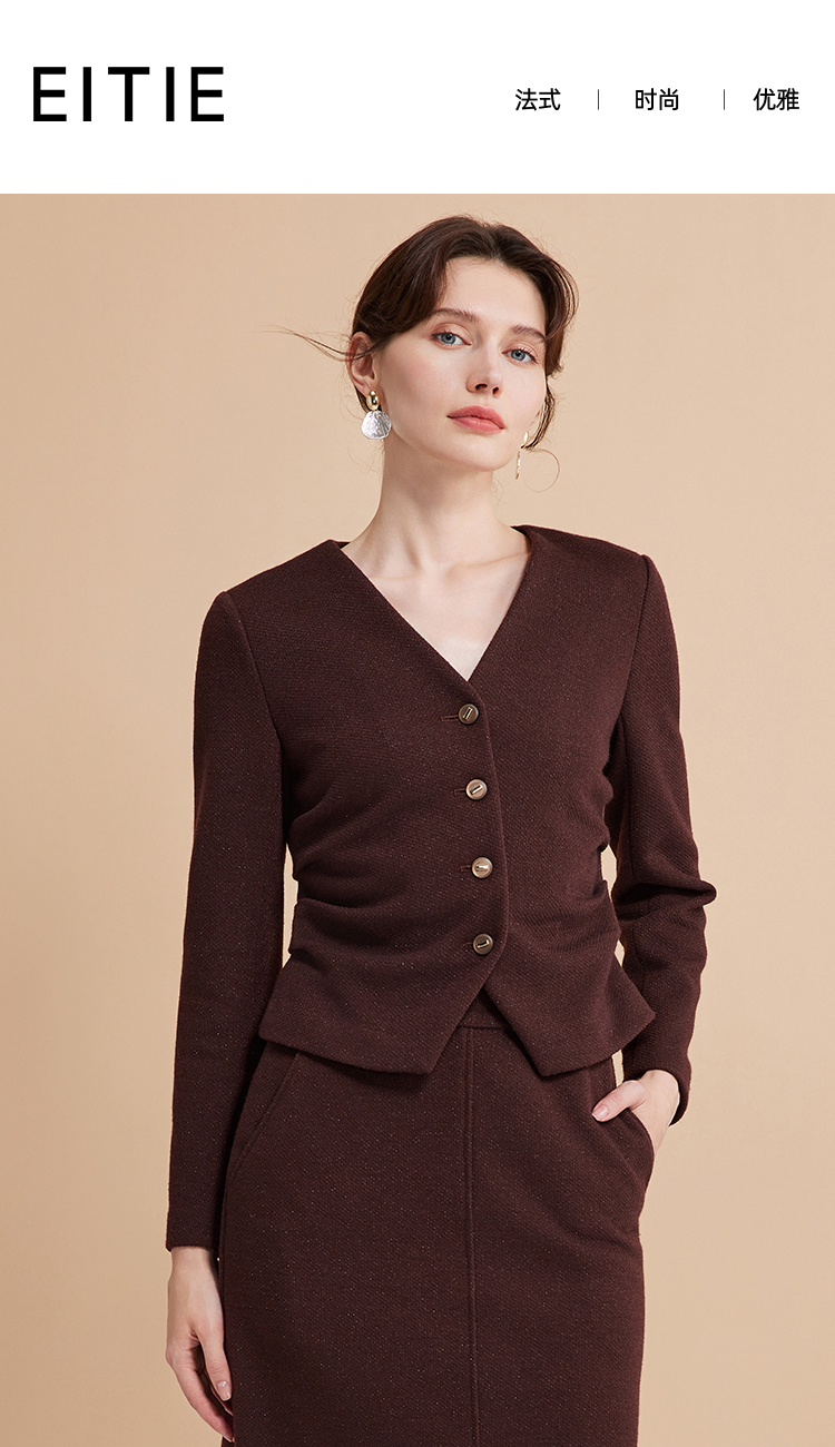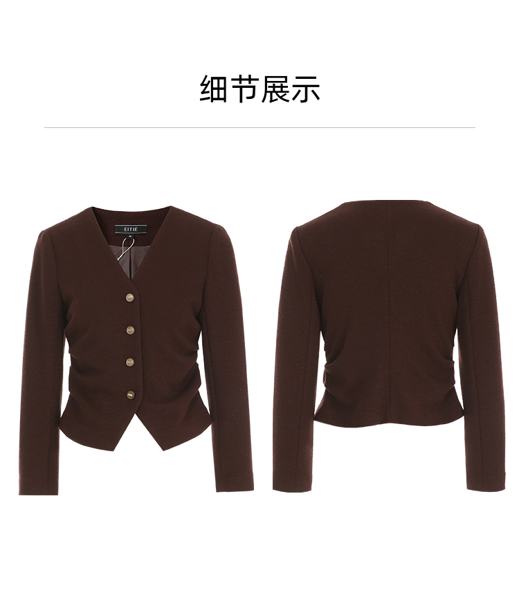 EITIE爱特爱气质V领高级感咖色褶皱收腰短款显瘦外套秋季新款D2403413