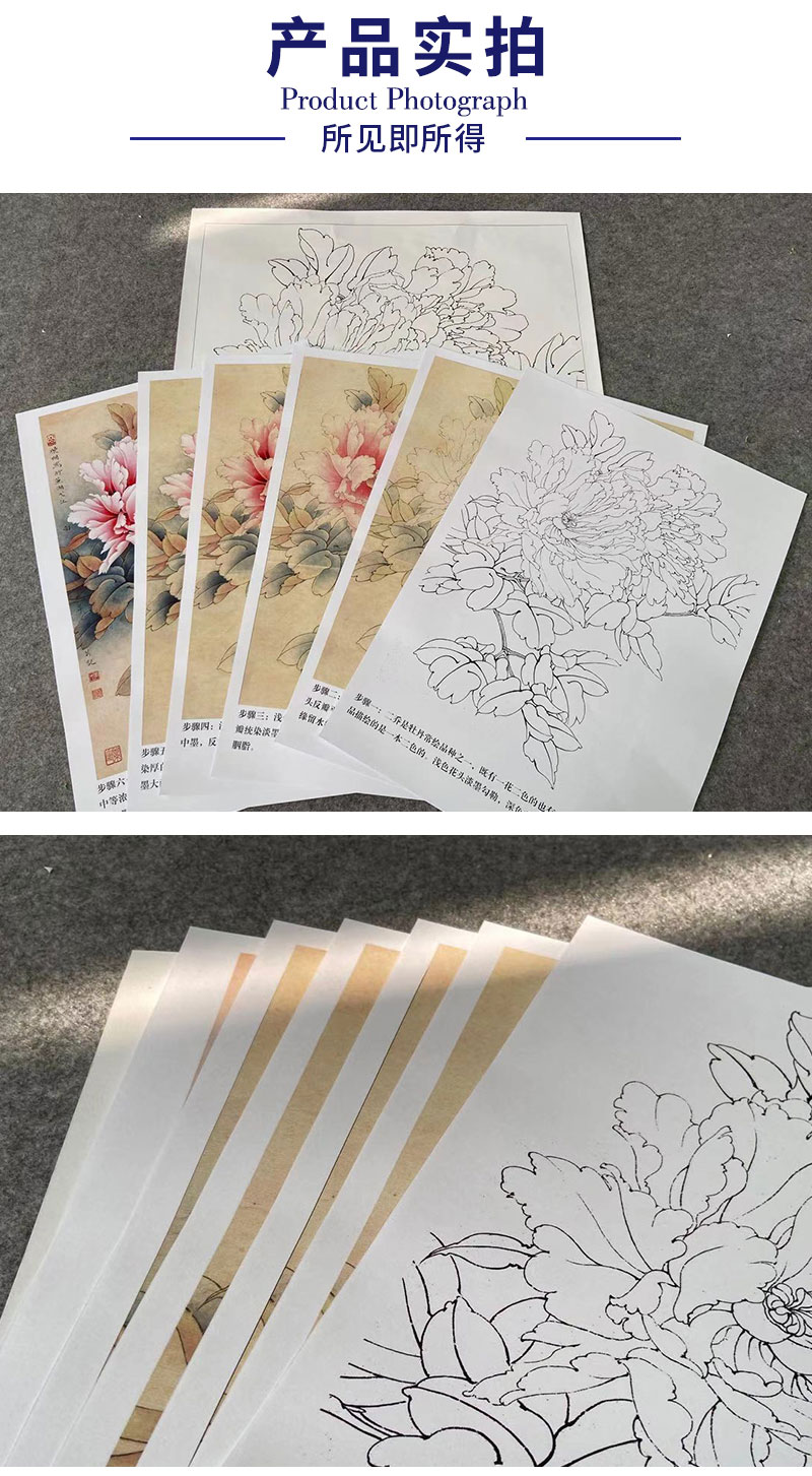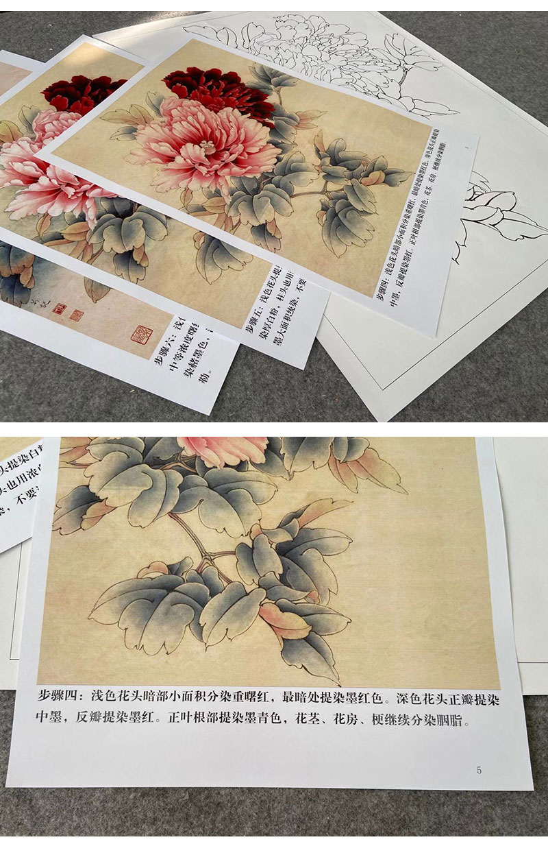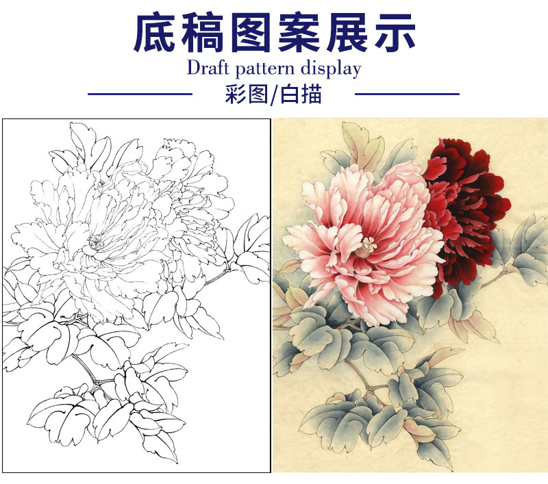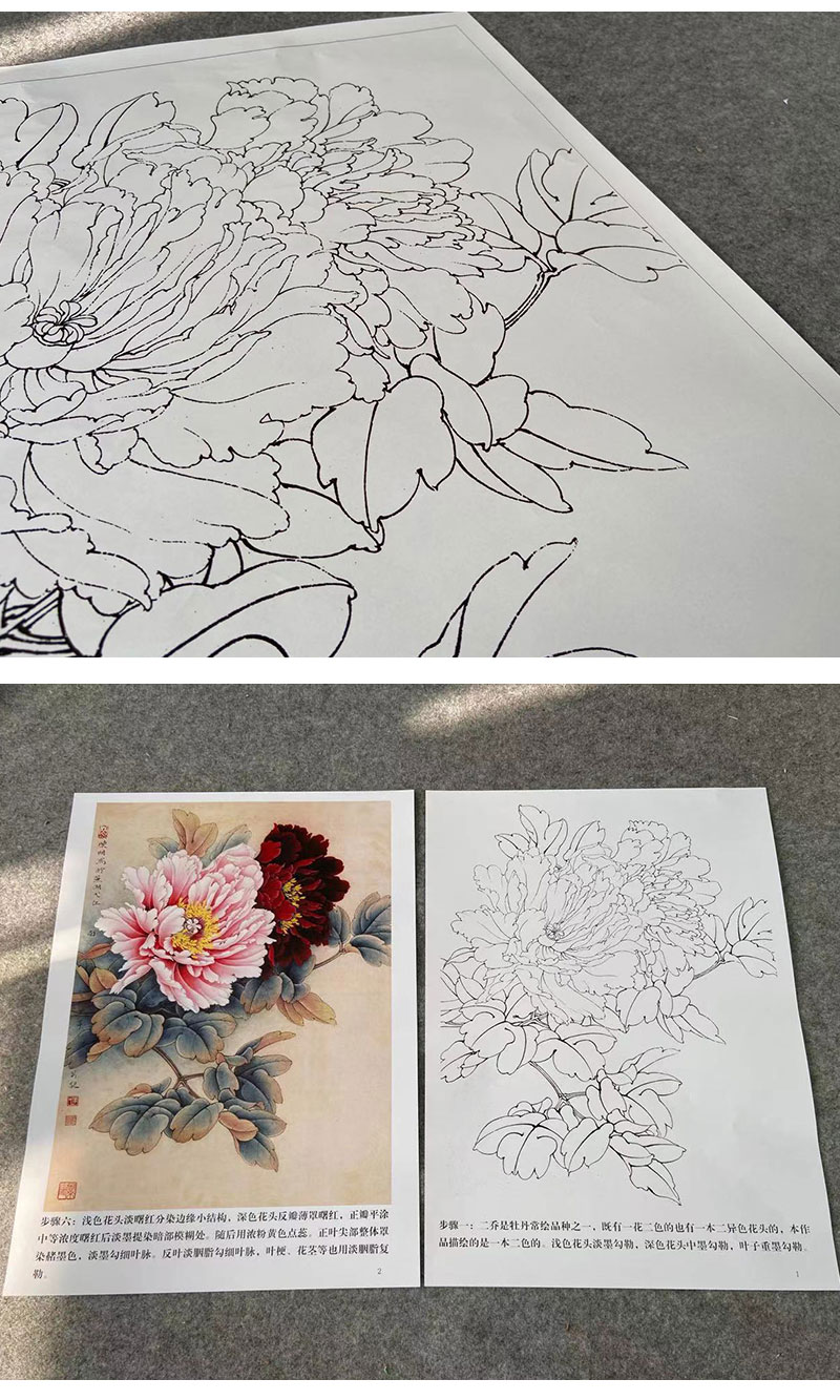 【有步骤、大彩图】李晓明工笔画白描底稿《二乔逢春》牡丹初学者临摹花鸟线稿KD12