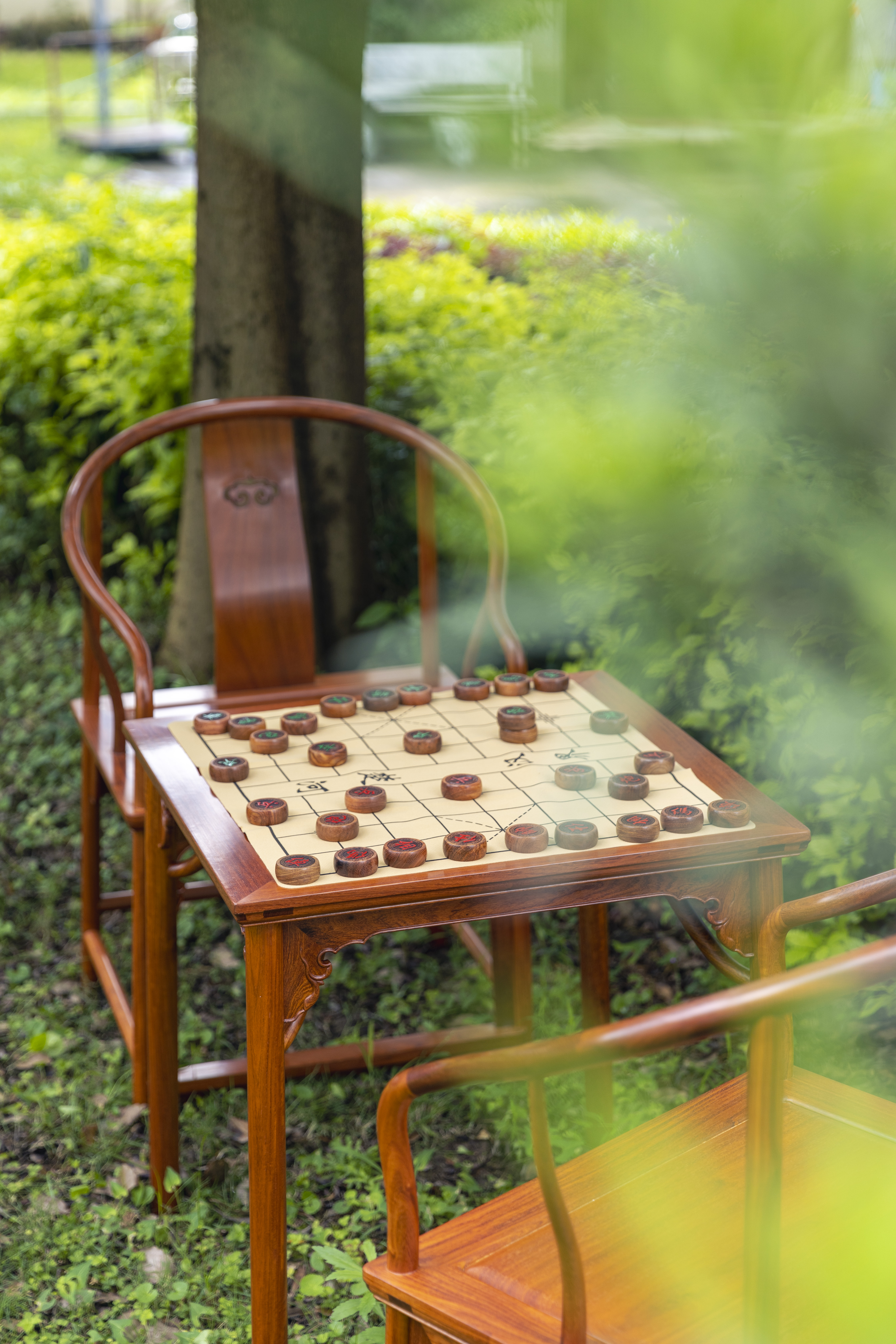 小棋桌尺寸甚佳,整器中正方阔,桌面四边相等,无束腰,面微微喷出,冰盘沿用椅盘面一样的造法,圆材侧脚,霸王枨结构为腿部留下充裕的活动空间,比例控制得当。
